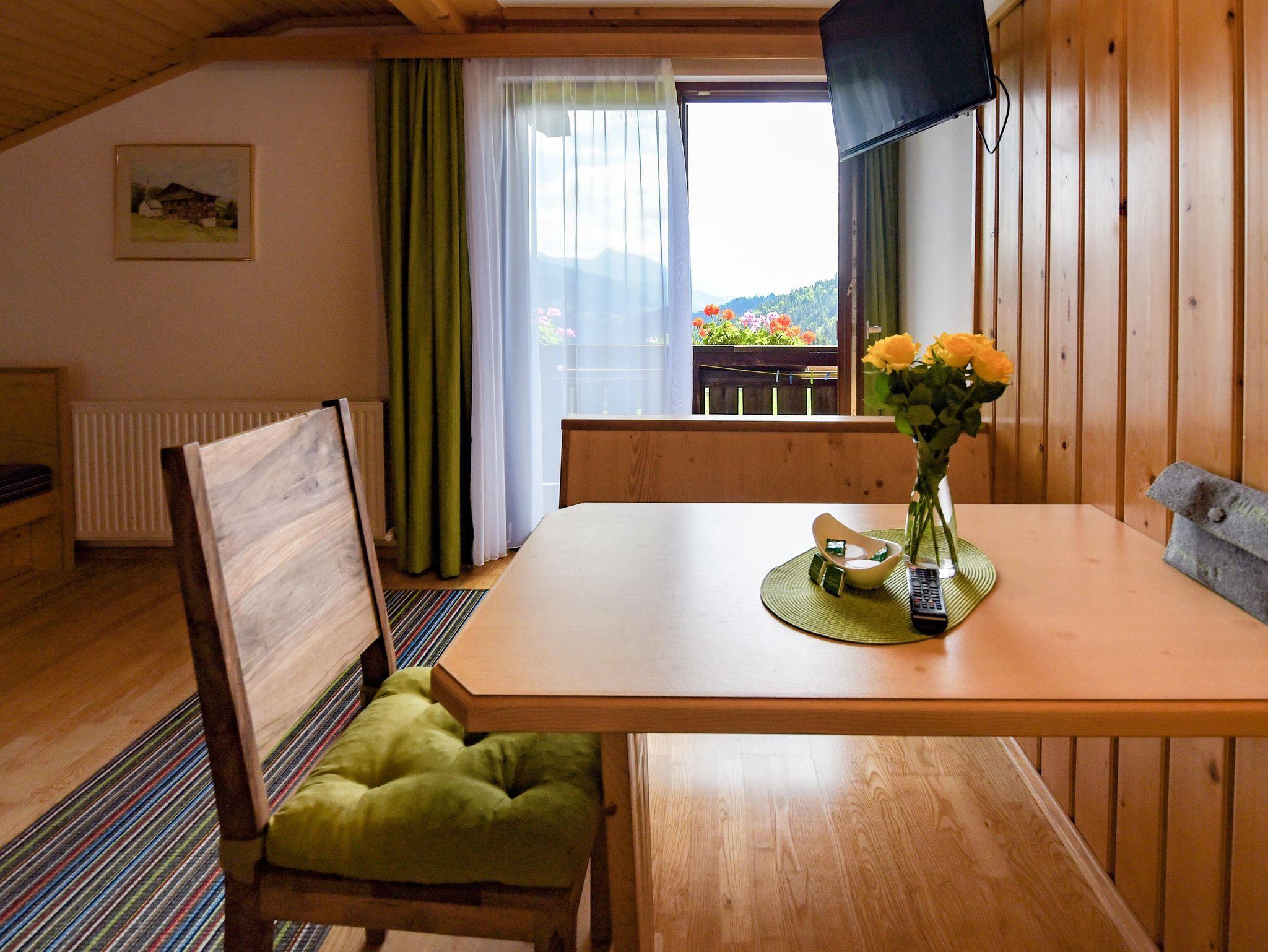 Diese Ferienwohnung besteht aus einem Vorraum mit kleiner Küche, einem großen Wohn-Schlafzimmer, Dusche/WC, und Balkon mit wunderbarer Aussicht in die Berge.