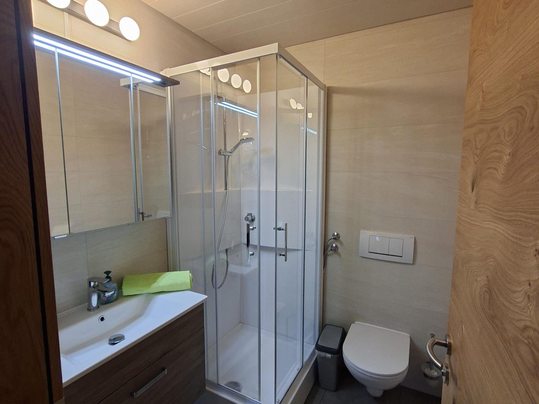Diese Ferienwohnung besteht aus einer großen Wohnküche mit Balkon, ein Elternschlafzimmer mit Balkon und DU/WC, ein Durchgang mit Garderobe ins geräumige Kinderzimmer ebenfalls mit DU/WC und Balkon.