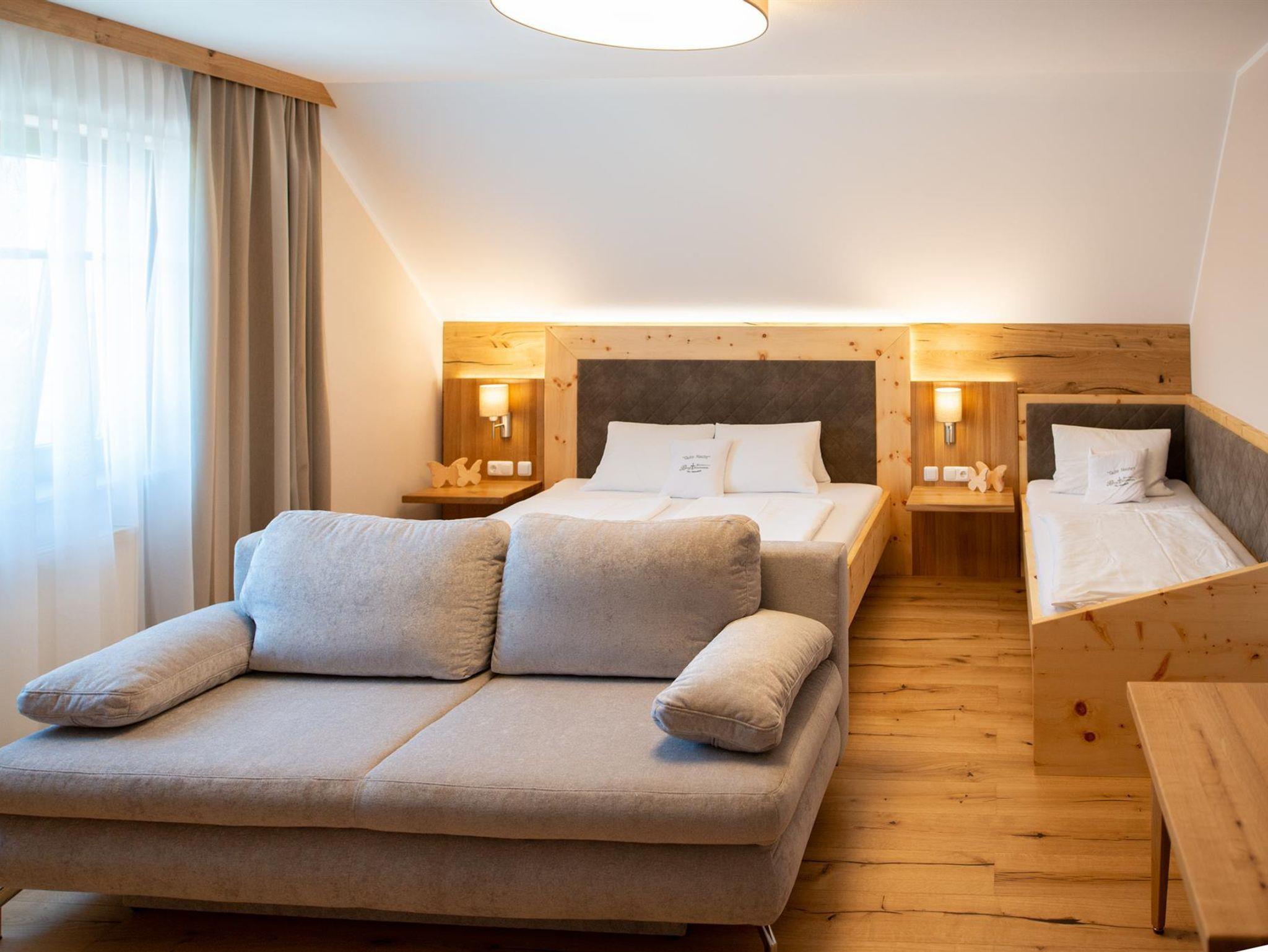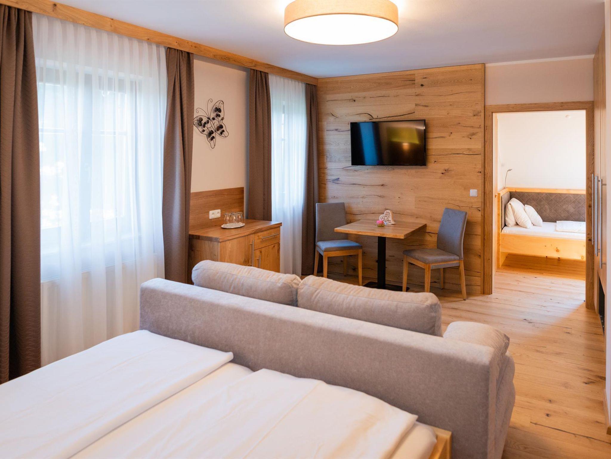 Die 2018 neu renovierten, mit Massivholz Zirbenbetten und Eichenholz Möbel eingerichteten Zimmer sind mit eigenem Vorraum, Bad & WC, SAT-TV und Teletext, WLAN, Gästekühlschrank, Zimmersafe, gemütliches Sofa & Haarfön ausgestattet.
