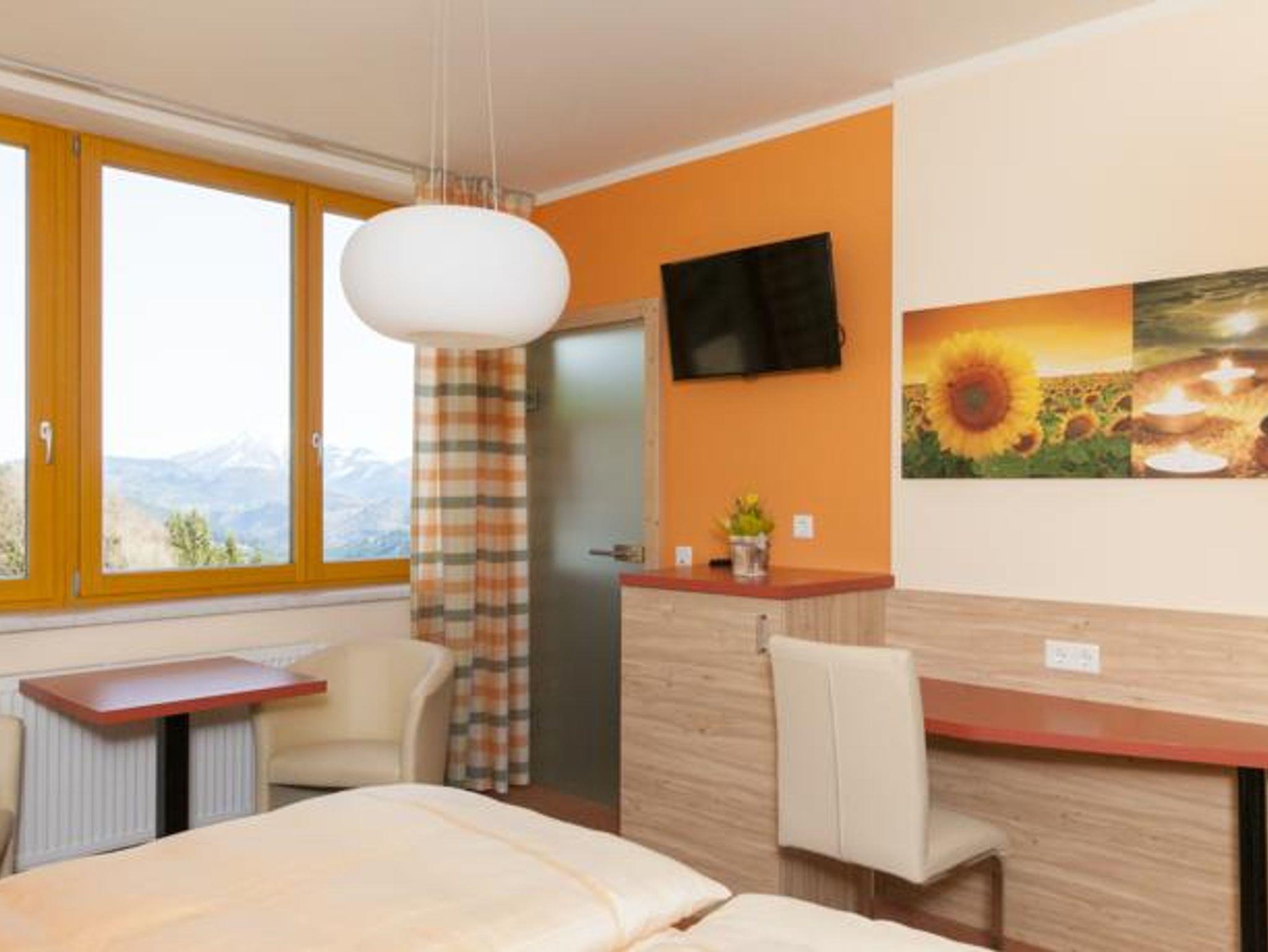 Doppelzimmer mit herrlichem Ötscherblick. Flachbildschirm mit SAT-TV, Sitzgarnitur mit rundem Tisch im modernen Look, indirekte Beleuchtung des Doppelbettes. Übernachtung mit Frühstück. Bitte beachten Sie, dass Schneeketten in den Wintermonaten bei Anreise erforderlich sind.