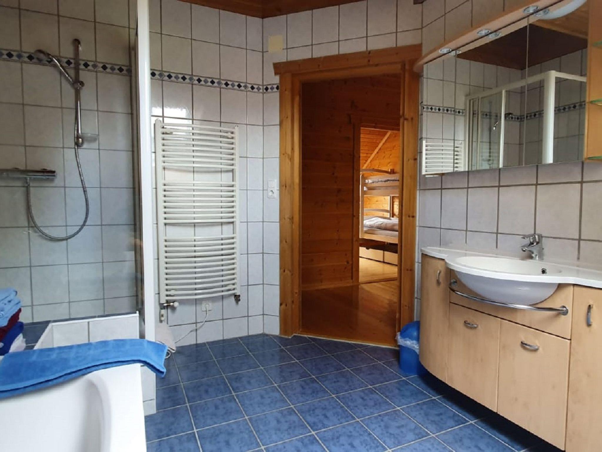 Die Ferienwohnung ist ca. 100qm groß, befindet sich in unserem neuen Blockhaus im 1.Stock und bietet Platz für bis zu 6 Personen. Es gibt einen geräumigen Vorraum mit gemütlicher Leseecke, 2 Schlafzimmer mit Doppelbett, 1 Schlafzimmer mit Stockbett, eine große Wohnküche (ausgestattet mit: geräumiger Küchenzeile - Geschirrspüler, Kaffeemaschine, Wasserkocher; Esstisch für 6 Personen; ausziehbare Couch, SAT-TV), 1 großes Bad (Dusche und Wanne) und WC getrennt, Waschmaschine. 2 Parkplätze stehen kostenfrei zur Verfügung. Wlan steht kostenfrei zur Verfügung.