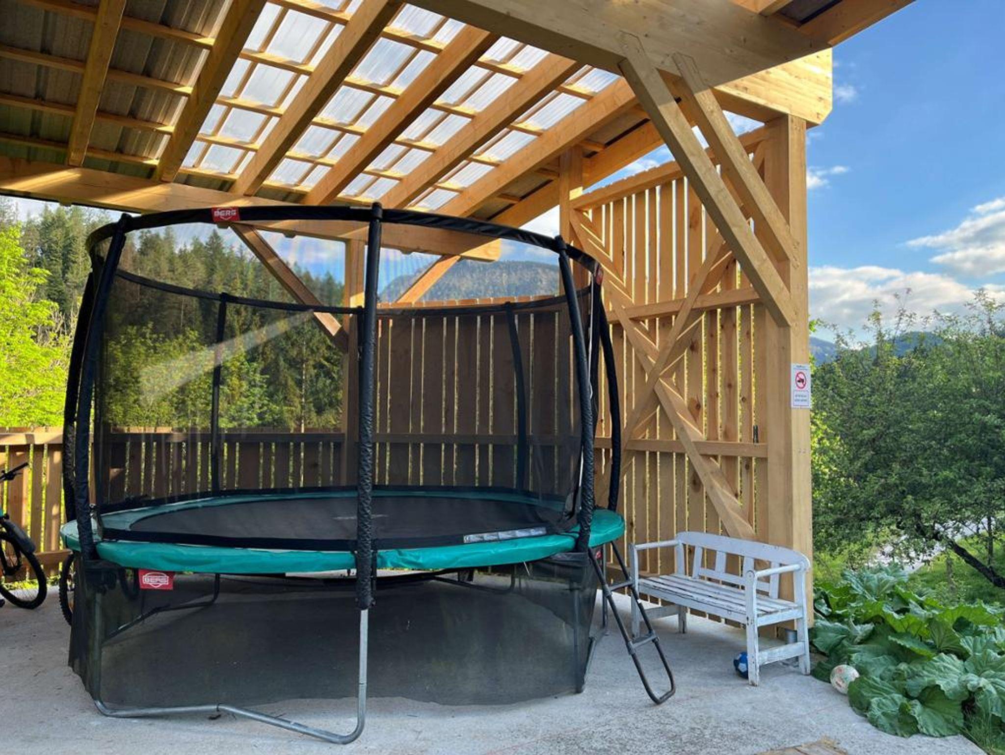 Eigener Gästegarten mit überdachter Sitzmöglichkeit, für unsere kleinen Gäste gibt es außerdem einen Spielplatz im Freien mit Schaukeln, großem Trampolin, Kinderfahrzeugen, Sandkiste, Parkplatz vorm Haus,...