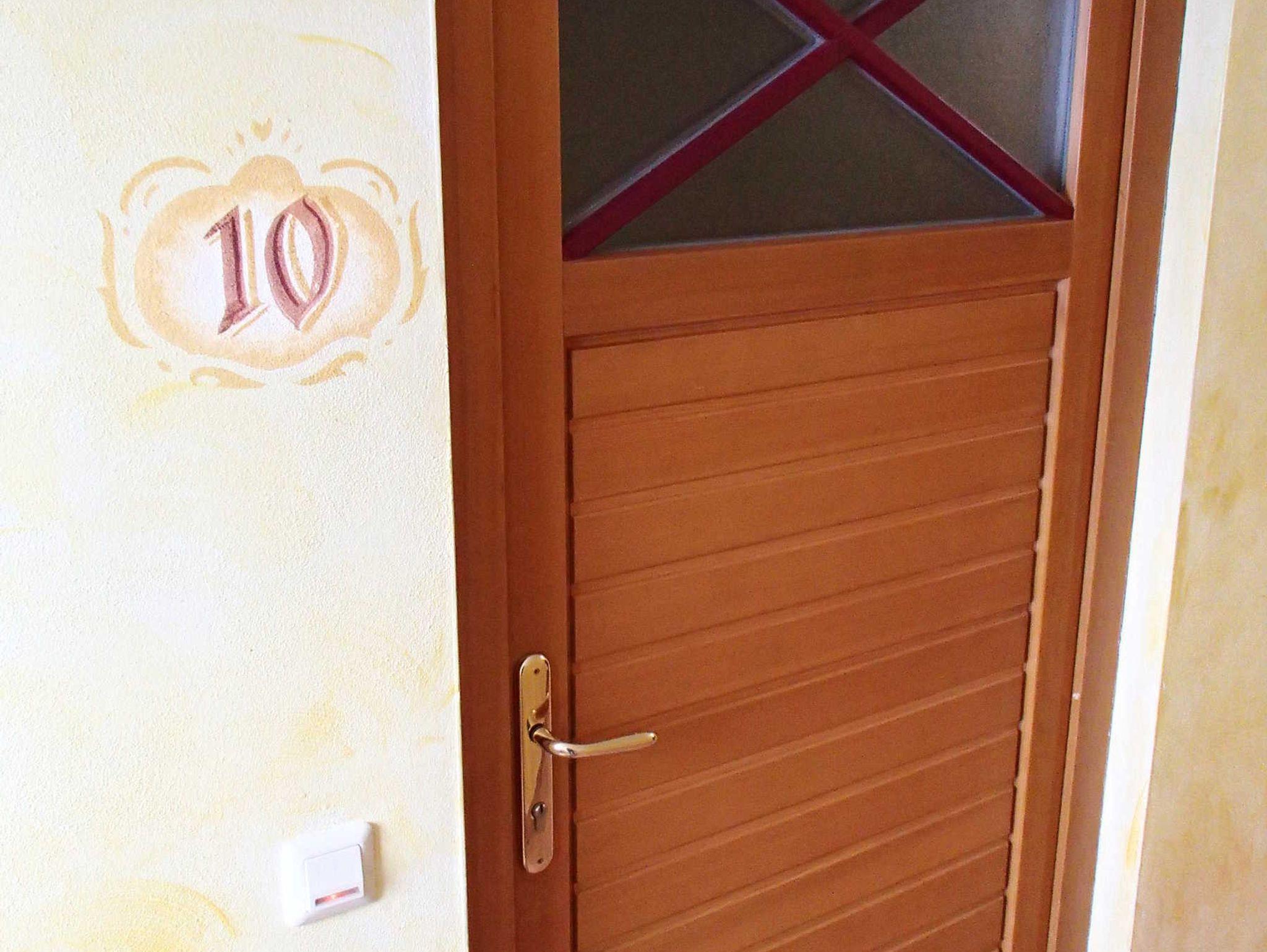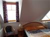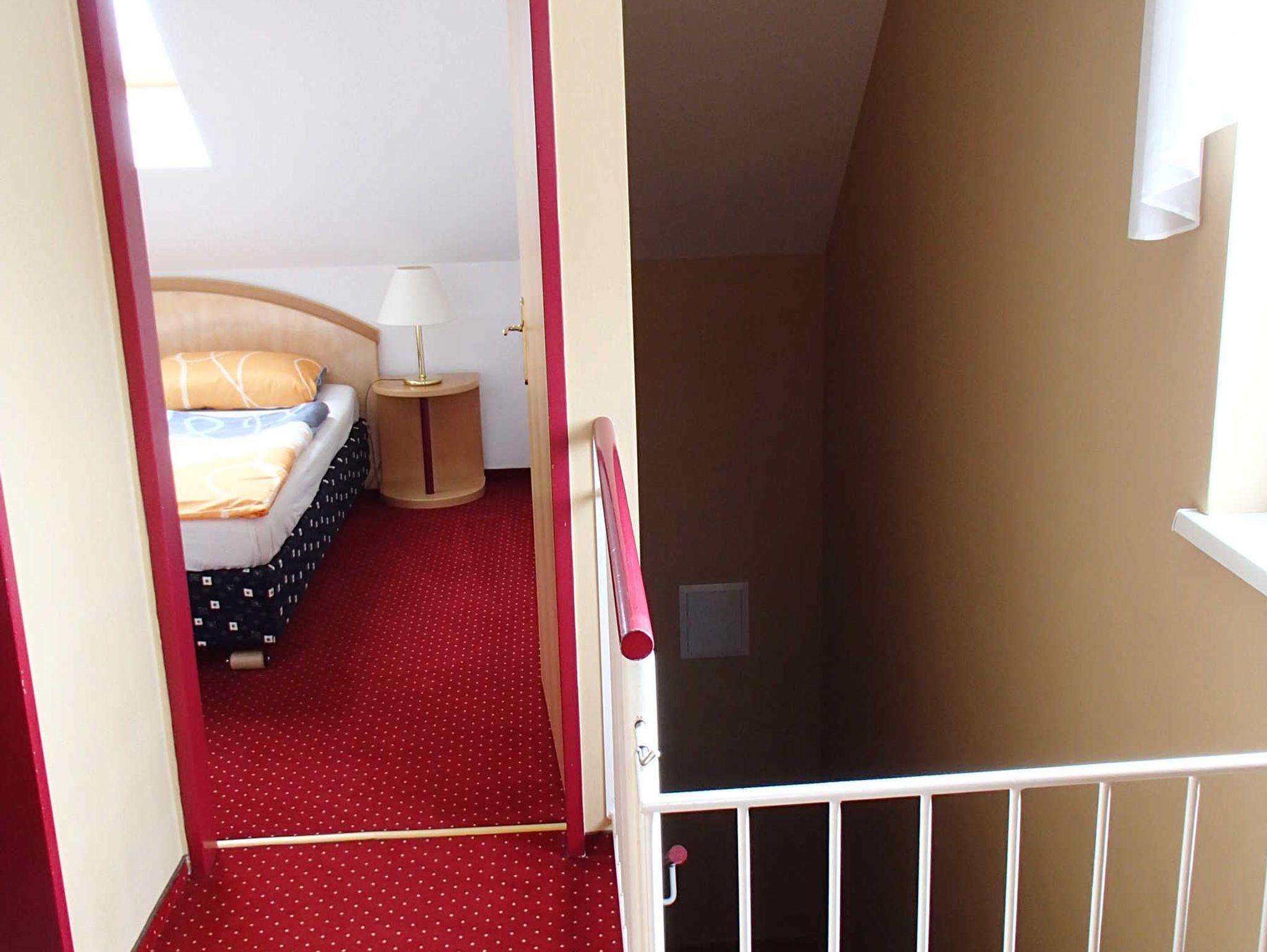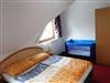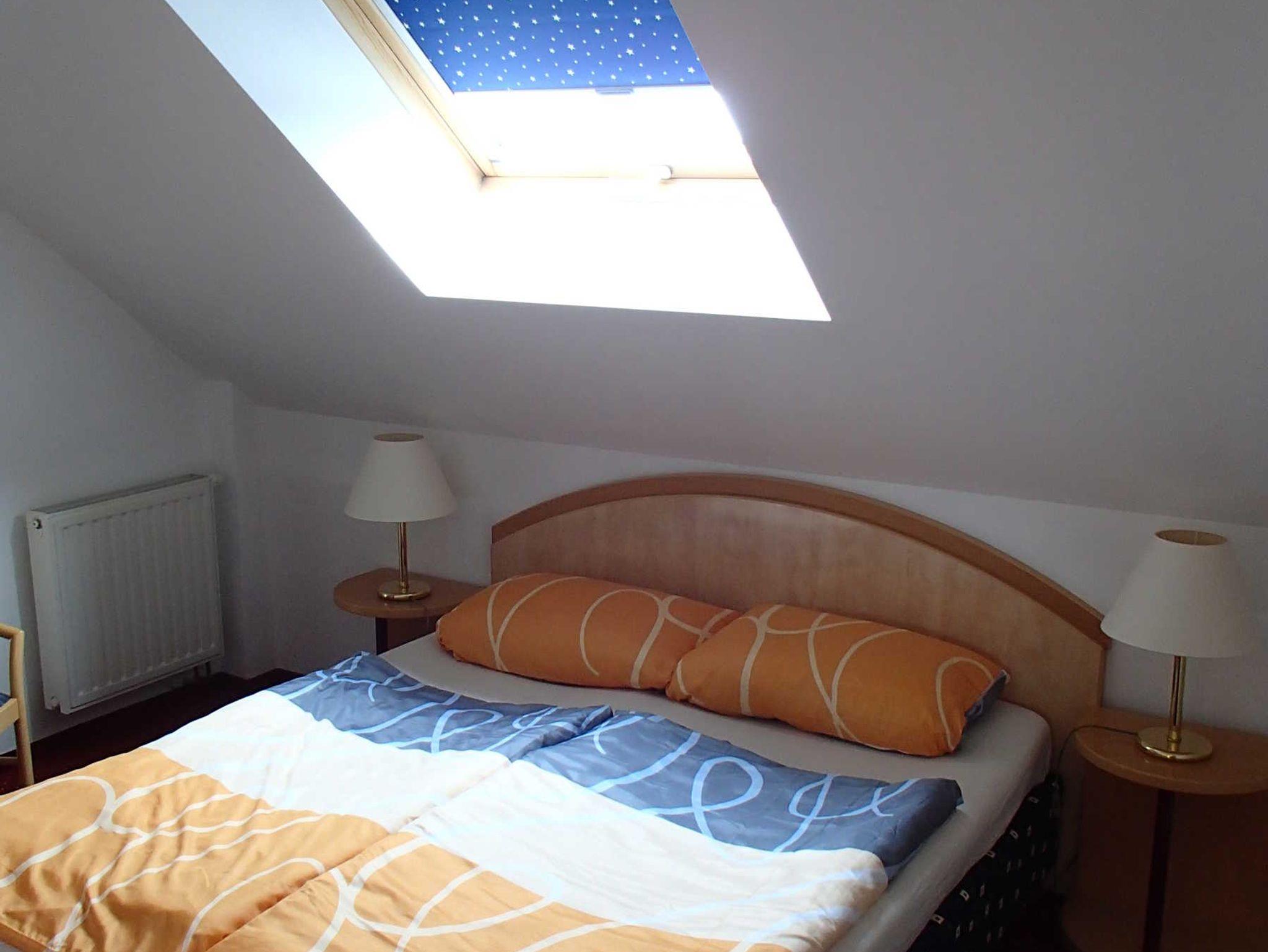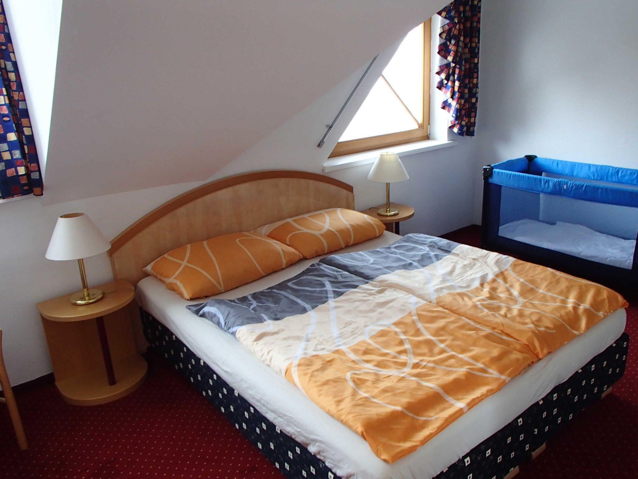 2 getrennten Schlafzimmern (4 Betten, 1 Matratze, 1 Klappbett, 1 Gitterbett) und ein großes Badezimmer mit WC befinden sich im Obergeschoß.