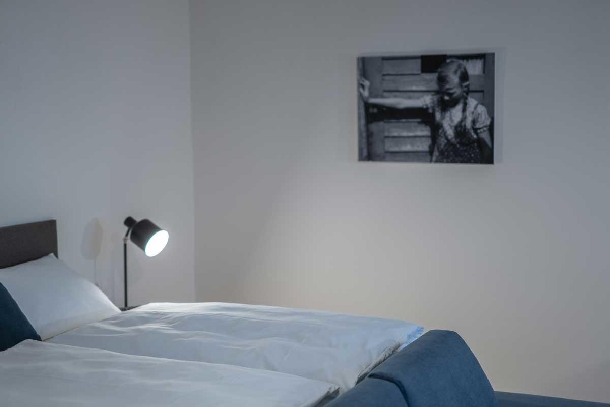 Vorraum mit Garderobe. 1 großes Schlafzimmer mit Boxspringbett (180 cm breit) und Schlafcouch.