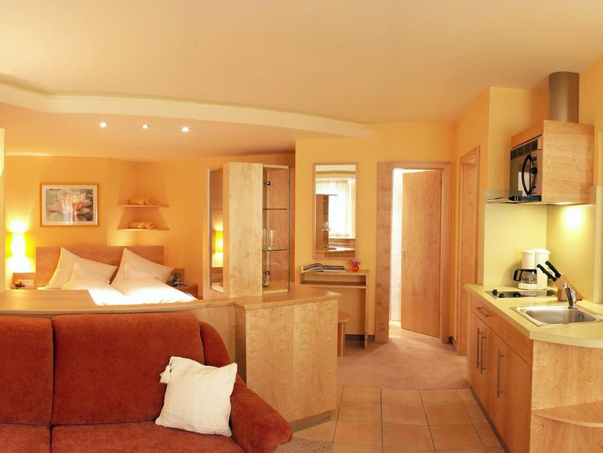 Das Wohnerlebnis der besonderen Art in unseren kuscheligen Appartements. Kombinierter Wohn- und Schlafbereich, Kochnische mit Microwellenherd, Kühlschrank, Kochplatten, Badezimmer mit Badewanne, separates WC, Telefon, W-LAN kostenlos. Auf Wunsch bieten wir auch Brötchenservice aufs Zimmer.