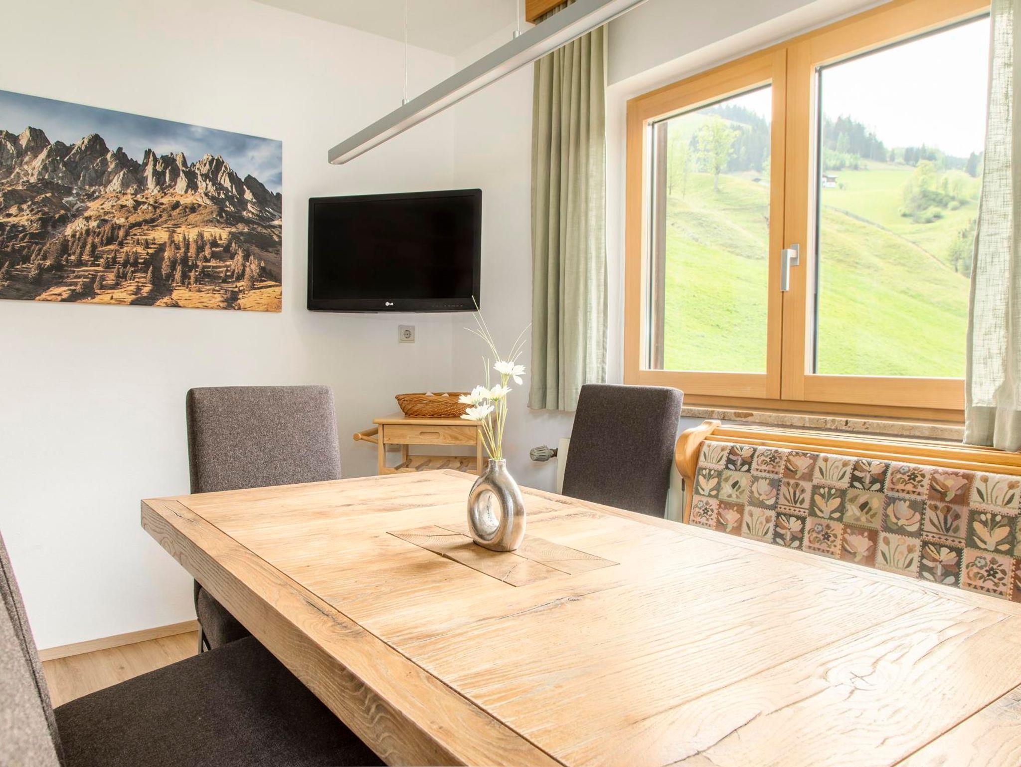 Küche mit TV, großen Küchentisch, E-Herd, Kühlschrank, Gefrierfach, Wasserkocher, Kaffeemaschine,...