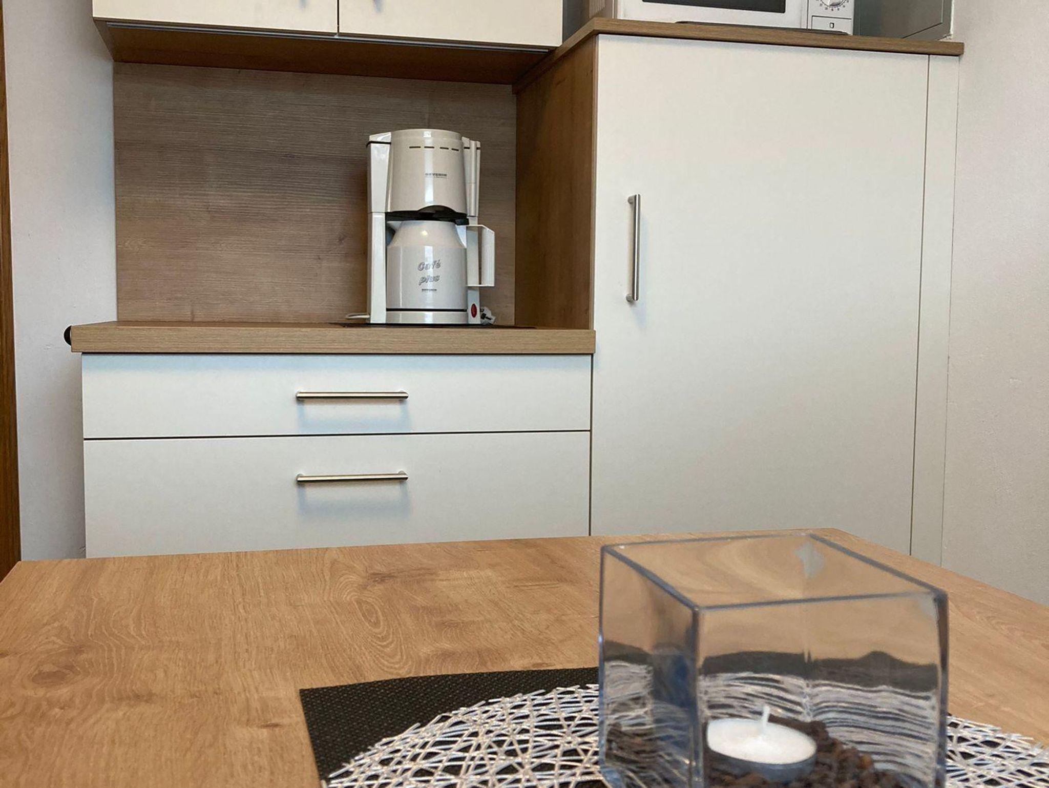 Das Appartement ist voll ausgestattet mit sämtlichen Koch- und Essgeschirr sowie E-Herd, Mikrowelle, Kaffeemaschine, Wasserkocher, Kühlschrank mit Gefrierfach, Geschirrspülmaschine, Handtücher, Bettwäsche, usw.