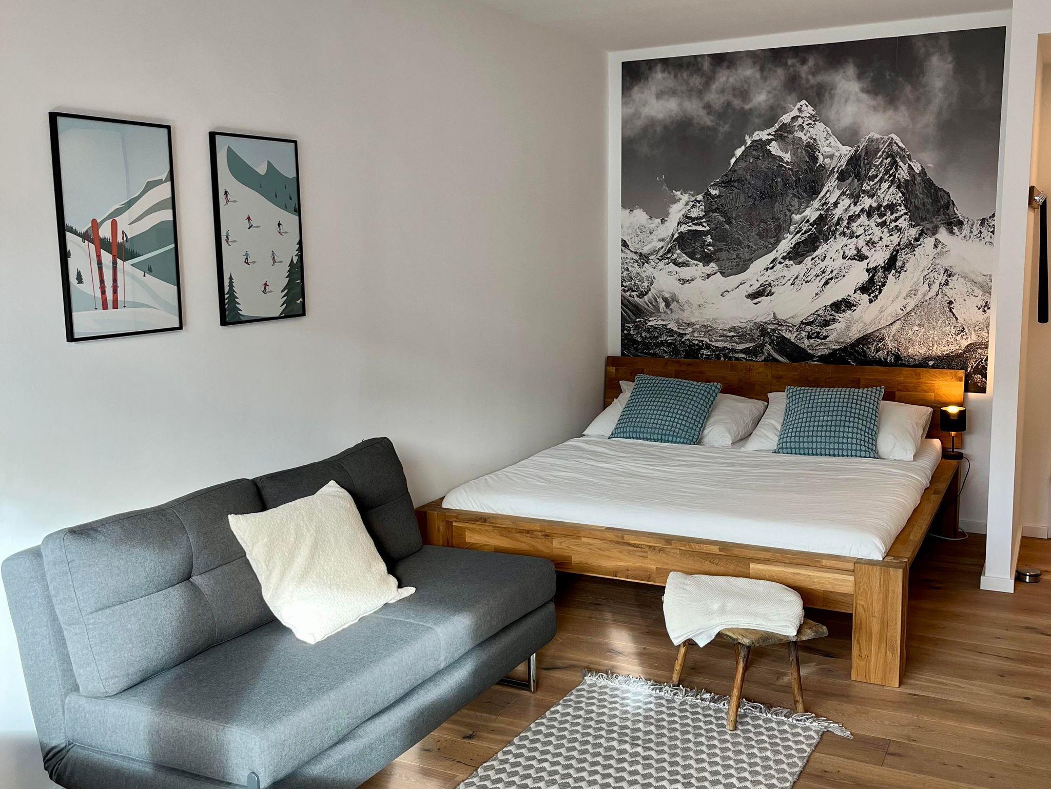 Die Unterkunft biete Platz für 4 Personen (Doppelbett und Schlafcouch) und Gelegenheit zum verweilen am sonnigen Balkon mit Talblick.
