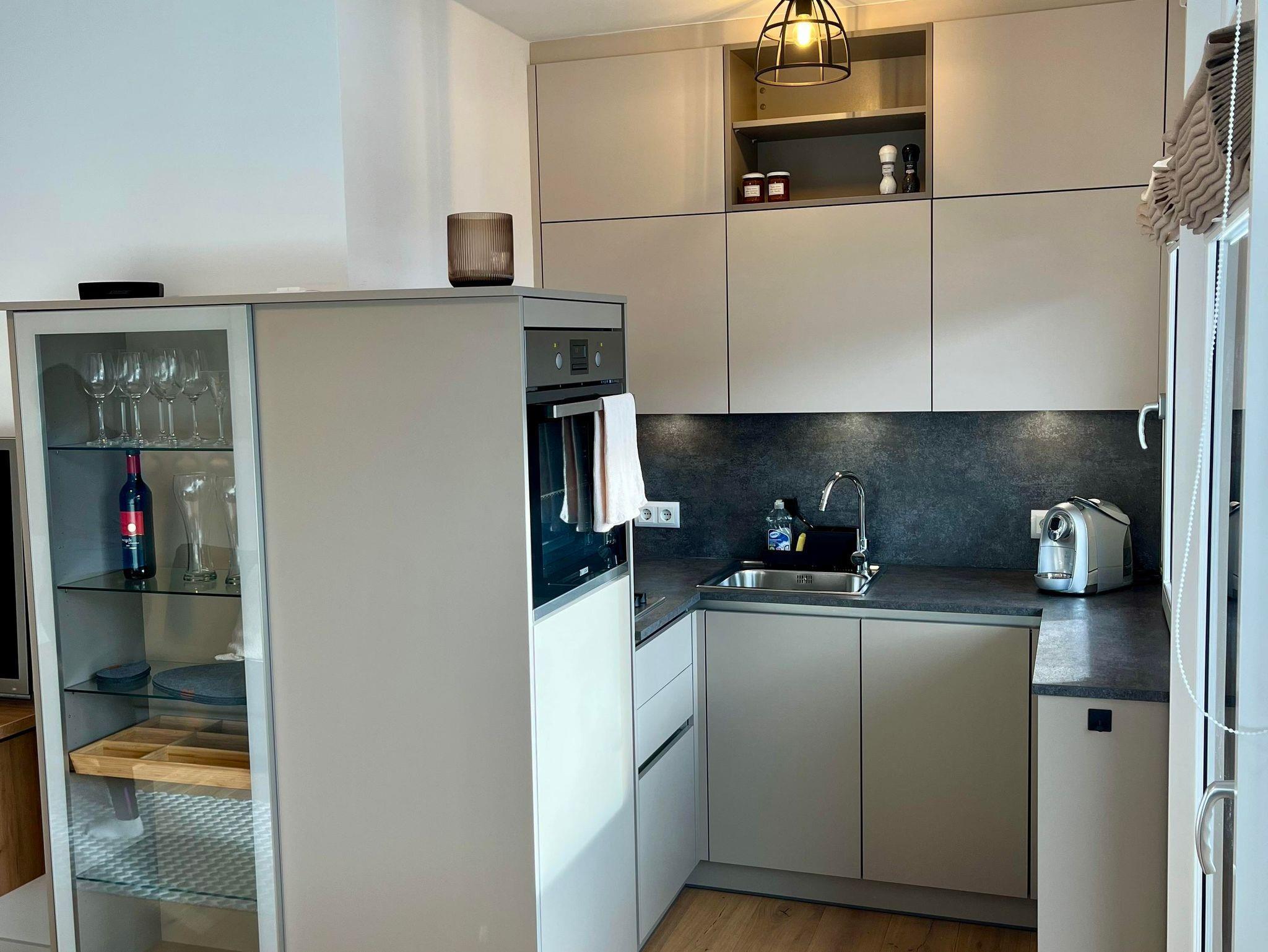 Die vollwertig ausgestattete Küche (Induktionsherd, Bachrohr, Geschirrspüler, Kühlschrank, Kaffeemaschine, Toaster etc.) bietet Möglichkeit zur Selbstversorgung.