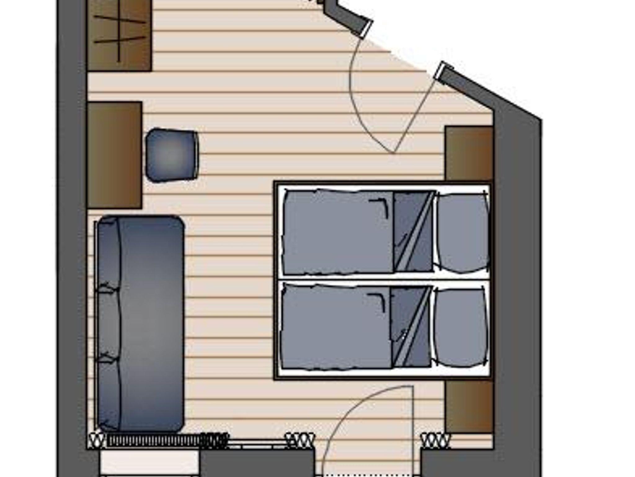 Das moderne Doppelzimmer im alpinen Stil für 1 bis 3 Personen befindet sich im 1. Stock, verfügt über ein Doppelbett (trennbar) mit offenem Fußende und hochwertiger Couch (Zusatzbett), TV, Dusche/WC und Balkon mit Blick auf den Bernkogel.