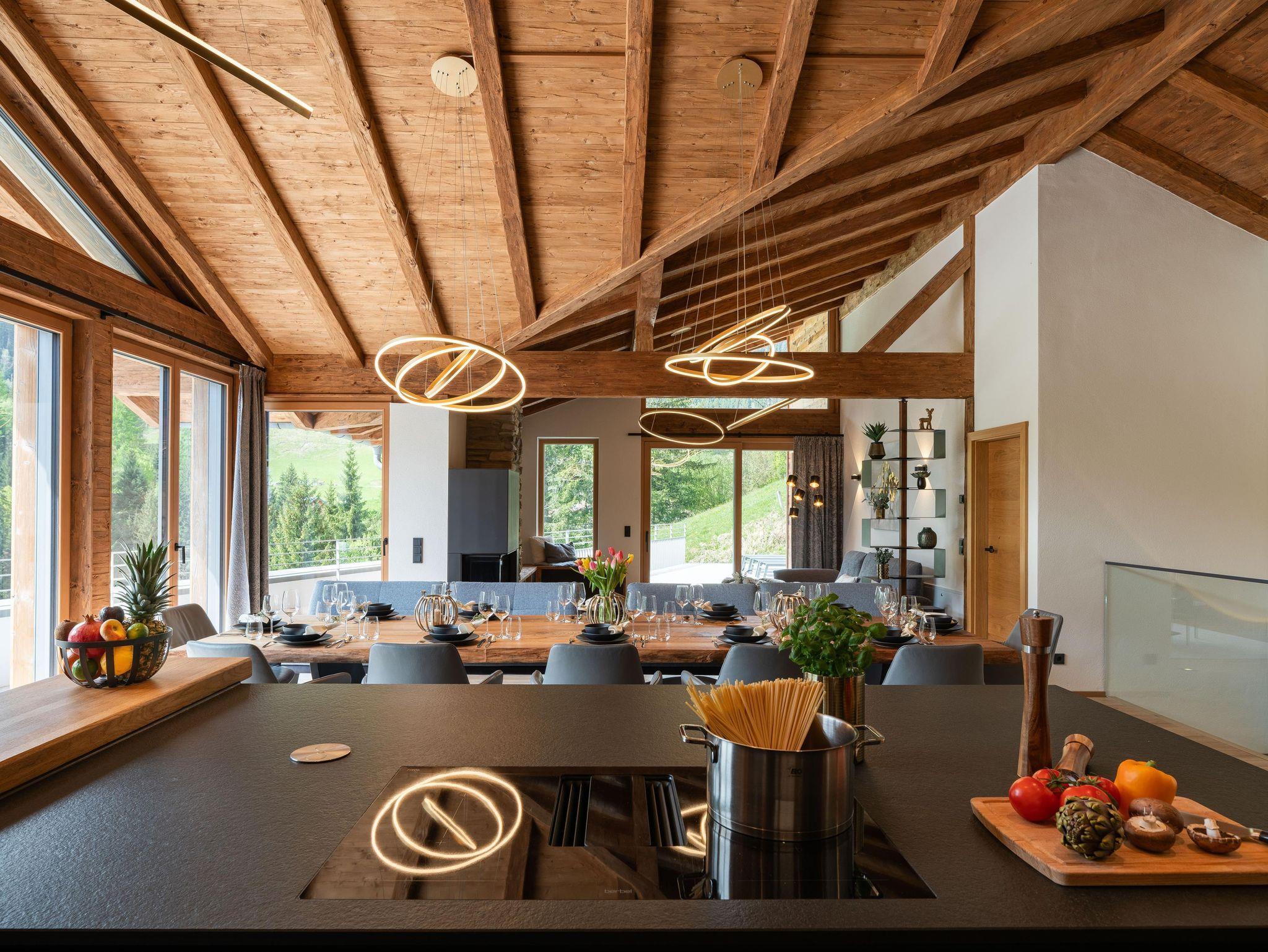 • Essbereich / Aufenthalt: Vier Meter lange Tafel, 75 Zoll TV, Holzofen, Panoramablick.