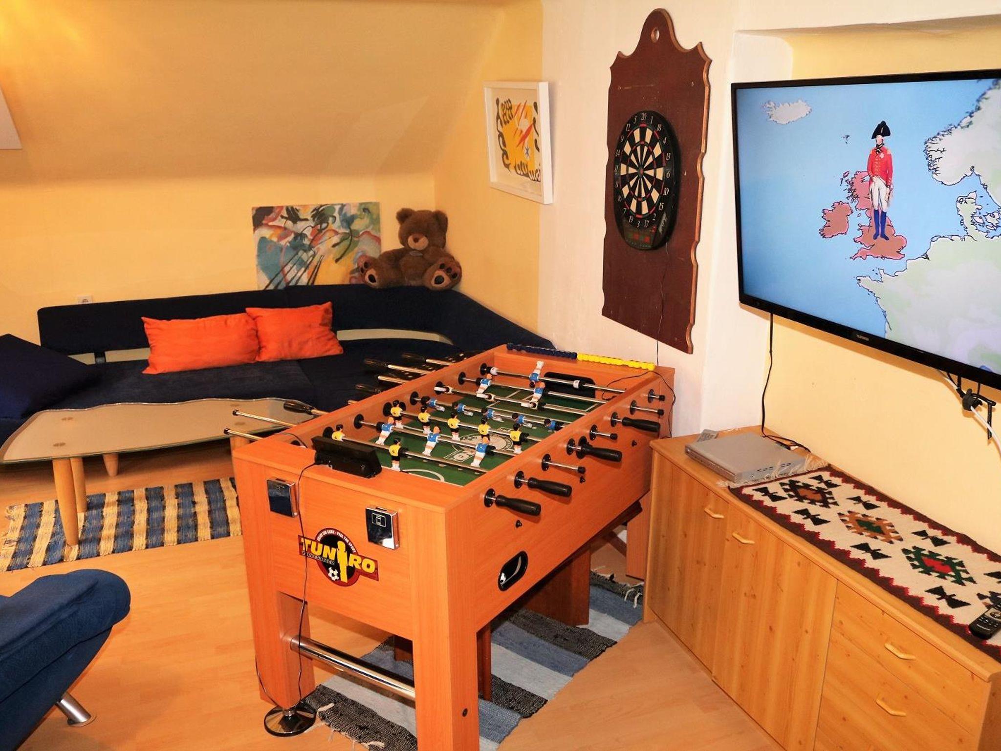 1. Obergeschoß: 100 qm, 3 Zimmer, Spiele-/Wohnzimmer, Küche (Mikrowelle, Geschirrspüler), Bad (Dusche, WC), WC, Kaminofen, SAT-TV, CD/DVD, Soccer-Tisch, WLAN