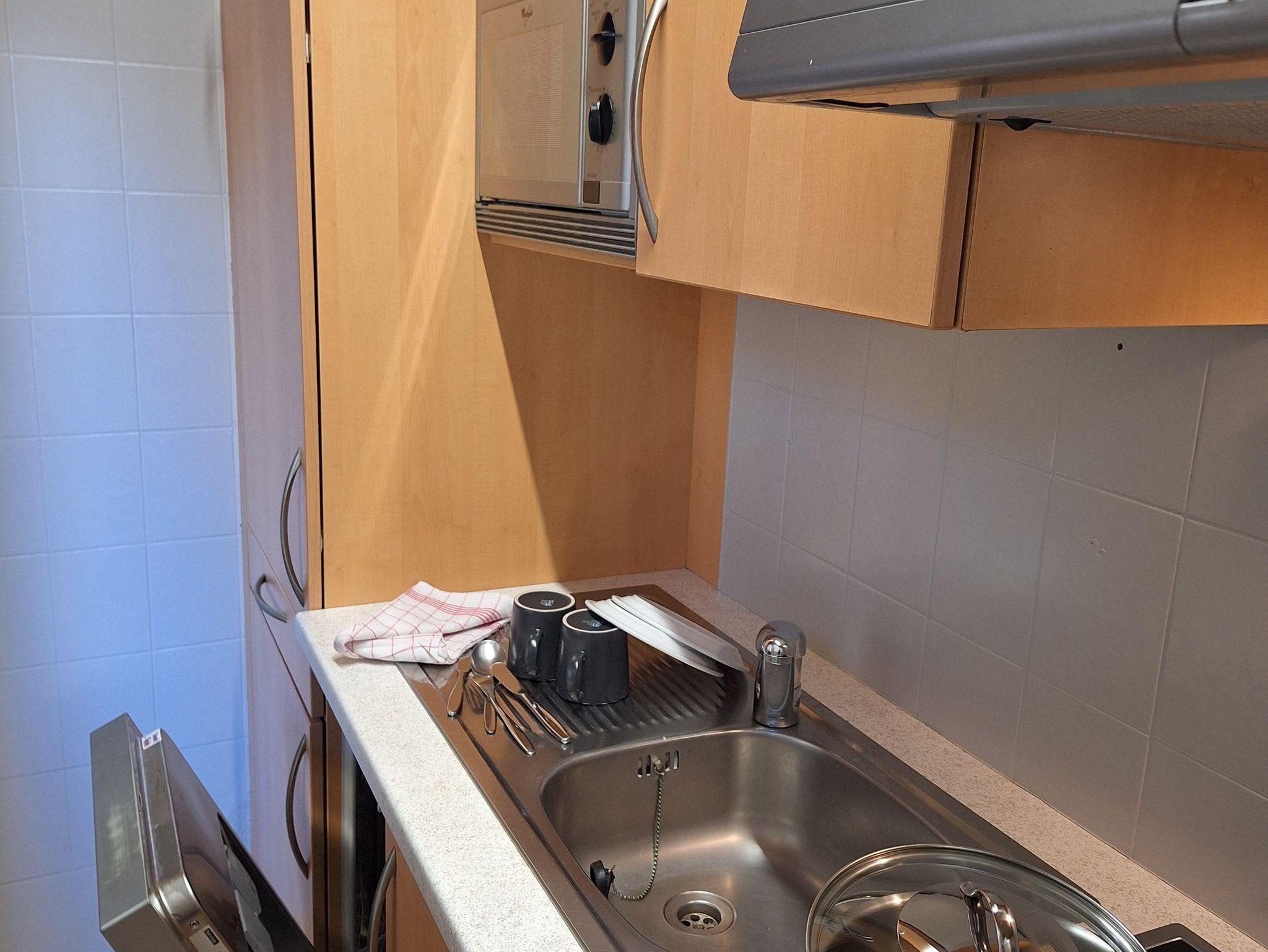 1 Doppelzimmer/DU/WC, ca. 8m² Balkon, Wohn-Esszimmer mit Couchbett, Esstisch und kleiner Küche, voll ausgestattet (Microwelle, Geschirrspüler, Kaffeemaschine, Wasserkocher, Toaster, 4-Platten-Elektroherd, Kühlschrank, Dunstabzug)