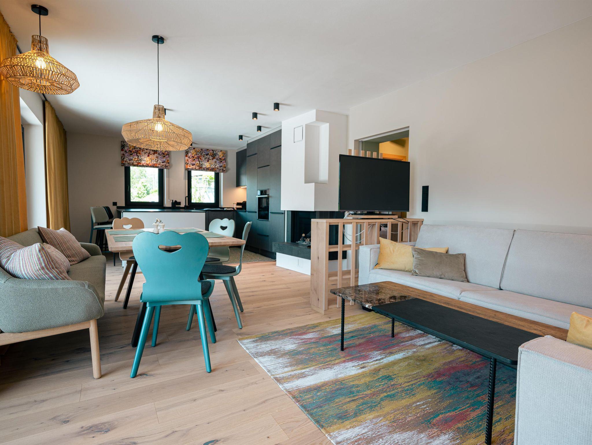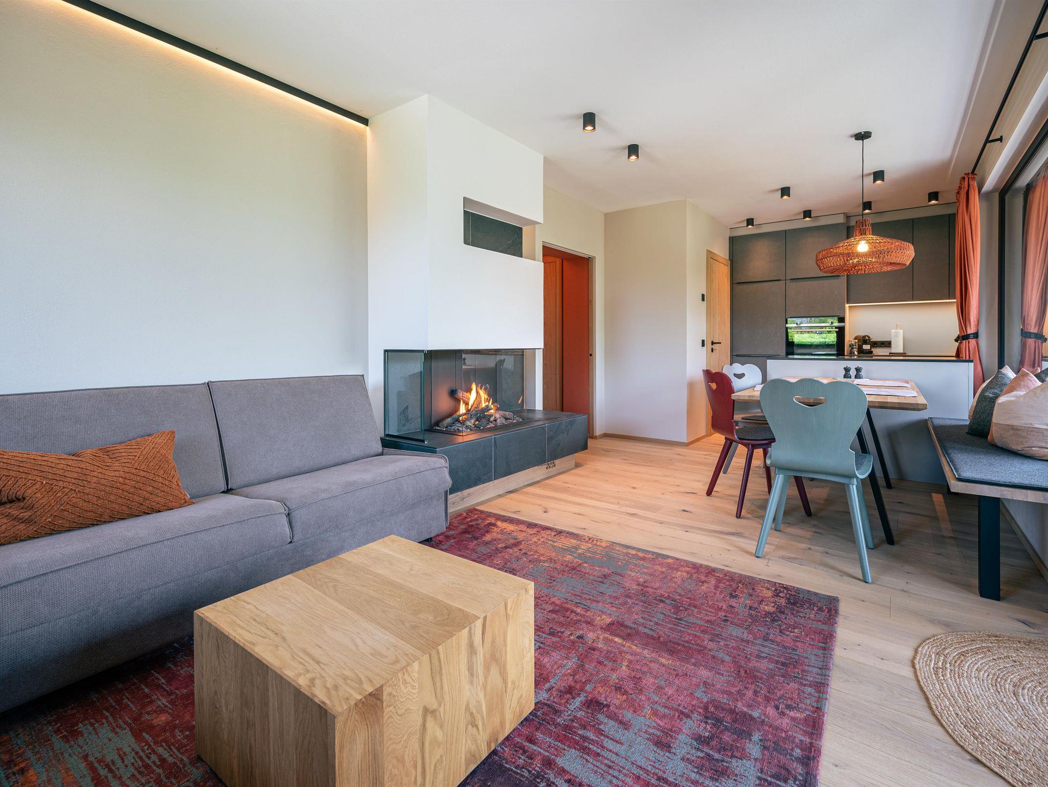 Die Wohnung wurde mit Naturmaterialien in einem stylishen Mix, passendes Farbkonzept zur Almwiese liebevoll eingerichtet. Die tolle private Aussensauna erfreut alle ab Sommer 2022.