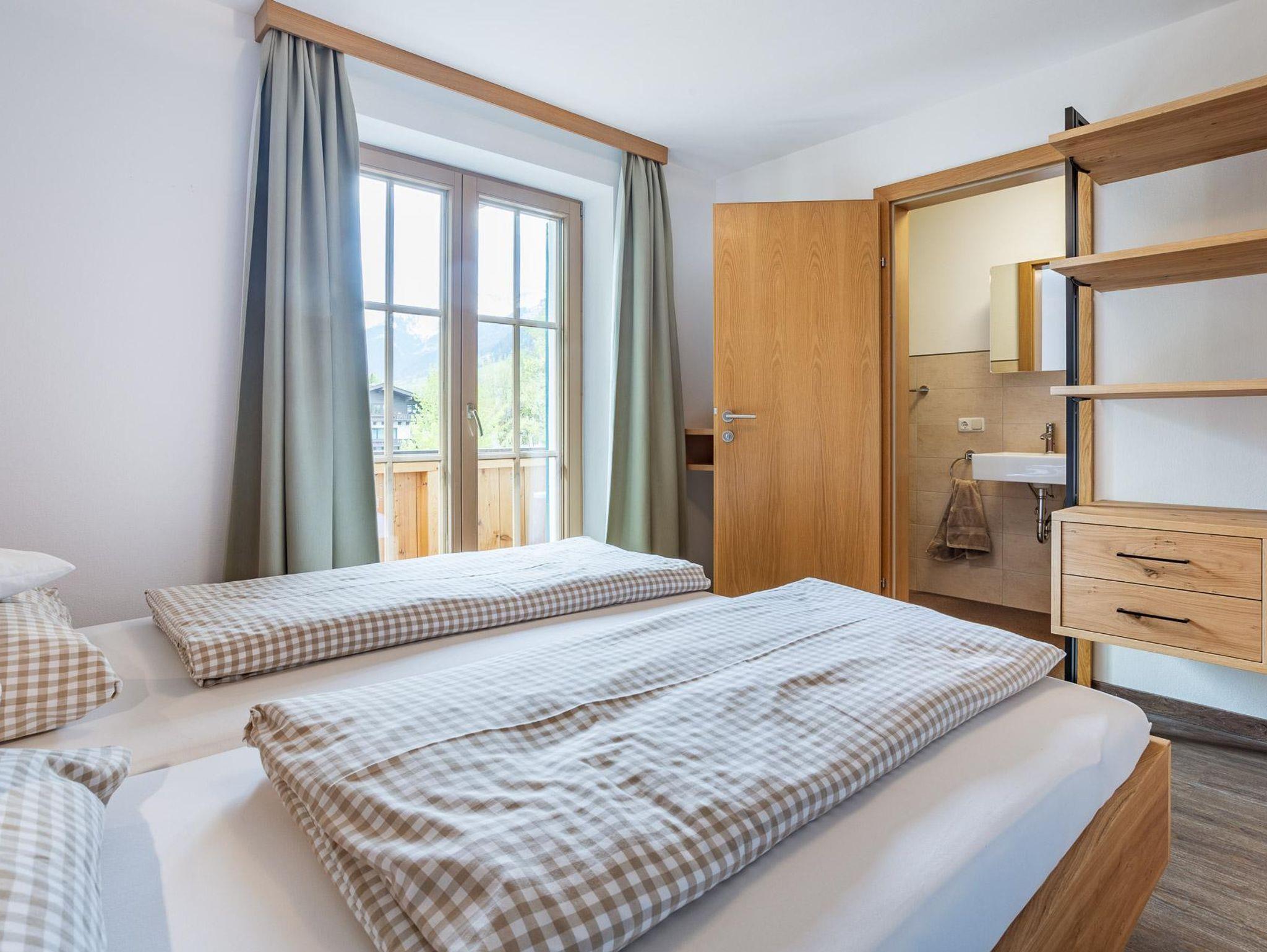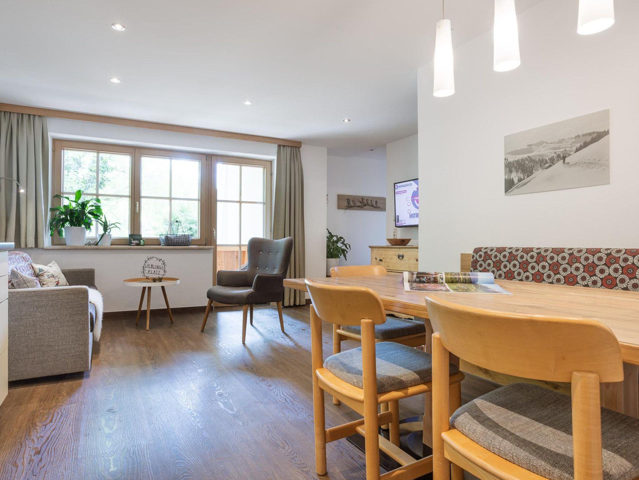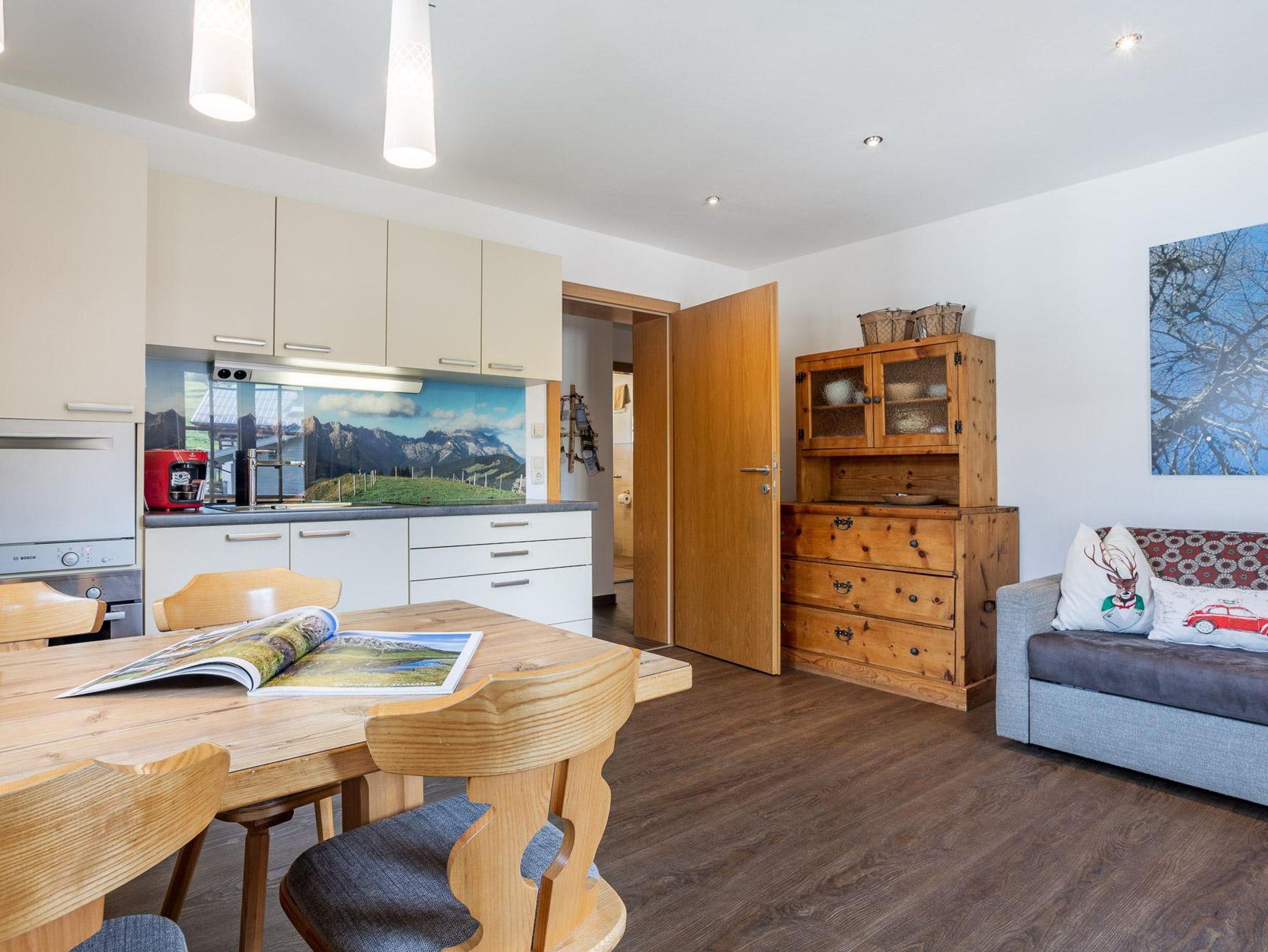 Geräumiger Wohn-Küche-Essraum - hochwertige Einrichtung mit Möbeln im modern-alpinen Stil. Gemütliche Ausziehcouch + Flat-TV, Küchenzeile mit allen Küchenutensilien.