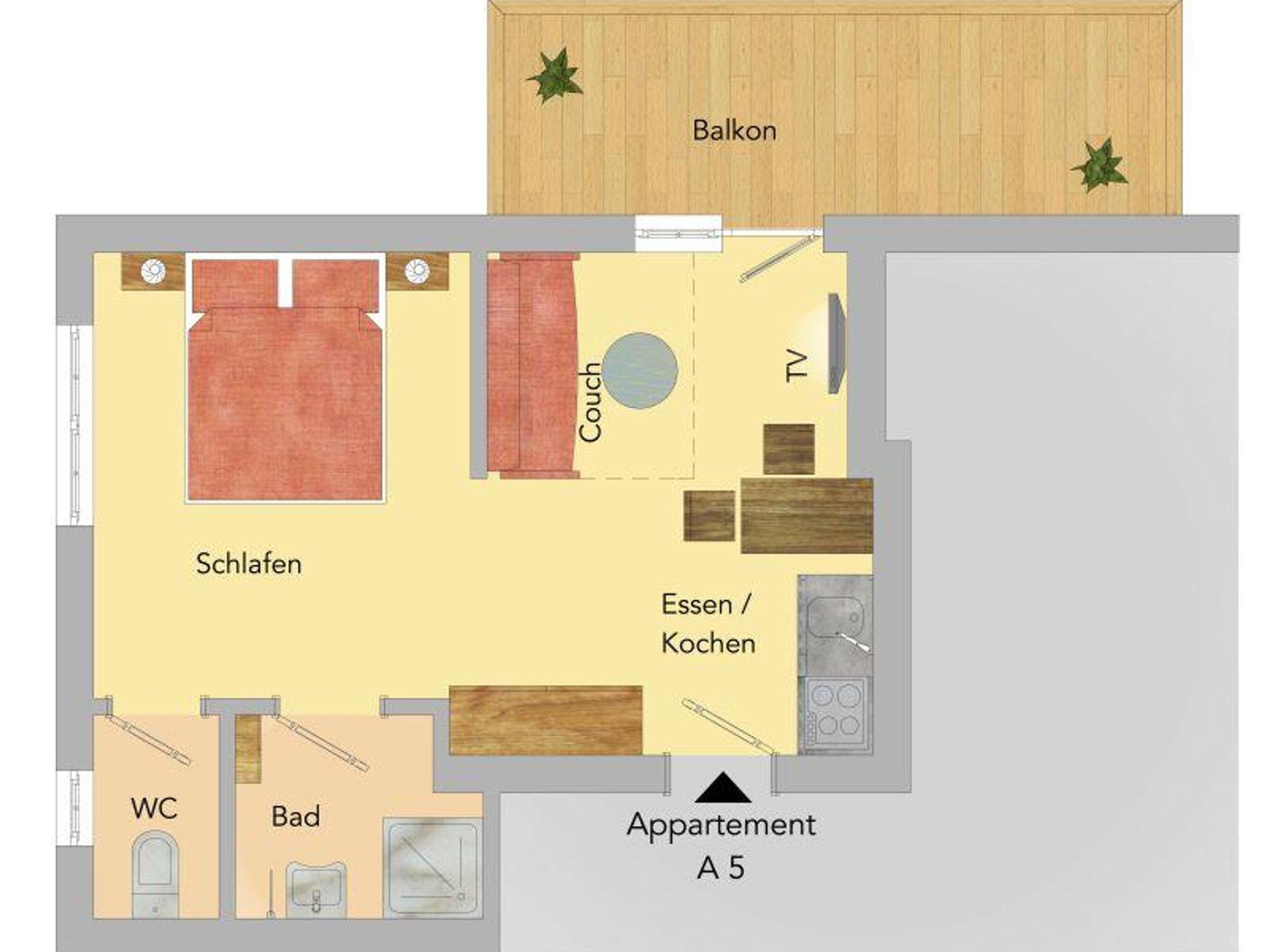 Appartment mit Wohnschlafraum, 28 m², Dusche, WC, Balkon.