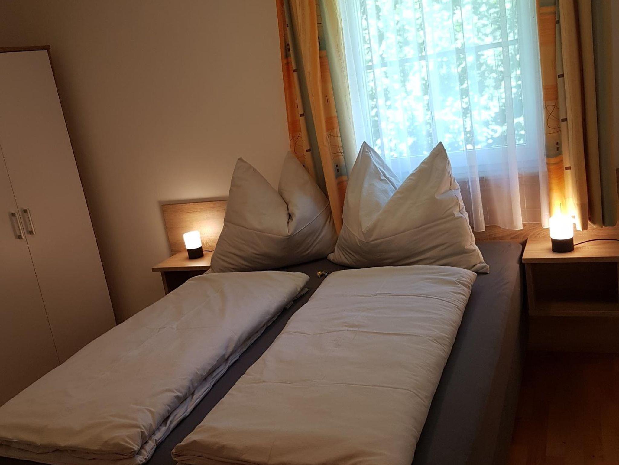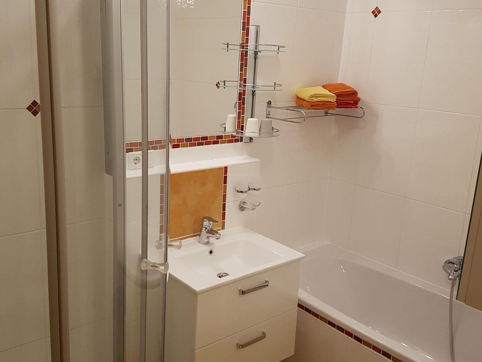 Dieses Apartment verfügt über 2 Schlafzimmer (wenn für 2 Personen angefragt wird, dann ist der Preis vergünstigt, da grundsätzlich von einer Bereitstellung von einem Schlafzimmer ausgegangen wird, optional kann das 2 Schlafzimmer bei Bedarf dazu gebucht werden), eine Küche mit einem Kühlschrank und einem Backofen mit Kochfeld, einen Flachbild-TV, einen Sitzbereich und ein Bad mit einer Badewanne und Dusche. Das WC ist separat. Handtücher und Bettwäsche werden im Apartment gestellt. Die Waschmaschinenbenutzung ist gegen Aufpreis möglich - dies muss aber vorab abgeklärt werden.