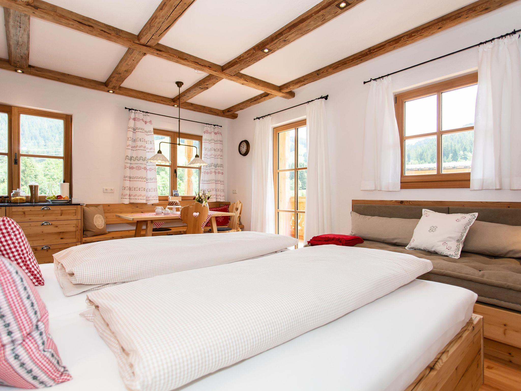 Unsere Einraum-Ferienwohnung bietet mit ihren 40qm und dem großen Bergpanorama-Balkon genügend Platz für bis zu 3 Personen für Ihren Urlaub in Maria Alm am Hochkönig. Die lichtdurchflutete Wohnung liegt im ersten Obergeschoss unseres Bauernhauses und gibt mit ihren vielen Fenstern und dem großzügigen Balkon mit Sitzgelegenheit den imposanten Blick aufs Steinerne Meer frei. Gemütlich und komfortabel ausgestattet im traditionellen Alpin-Charme mit viel Holz und Naturmaterialien überzeugt sie mit jeglichem Luxus wie Regendusche, gratis highspeed W-Lan, Kabel Flat-TV; Fußbodenheizung. Die voll ausgestattet Küchenzeile macht Freude am Kochen. In der gemütlichen Ess-Eck kann nach Herzenslust gespeist und relaxt werden. Allergikerfreundliches Bett