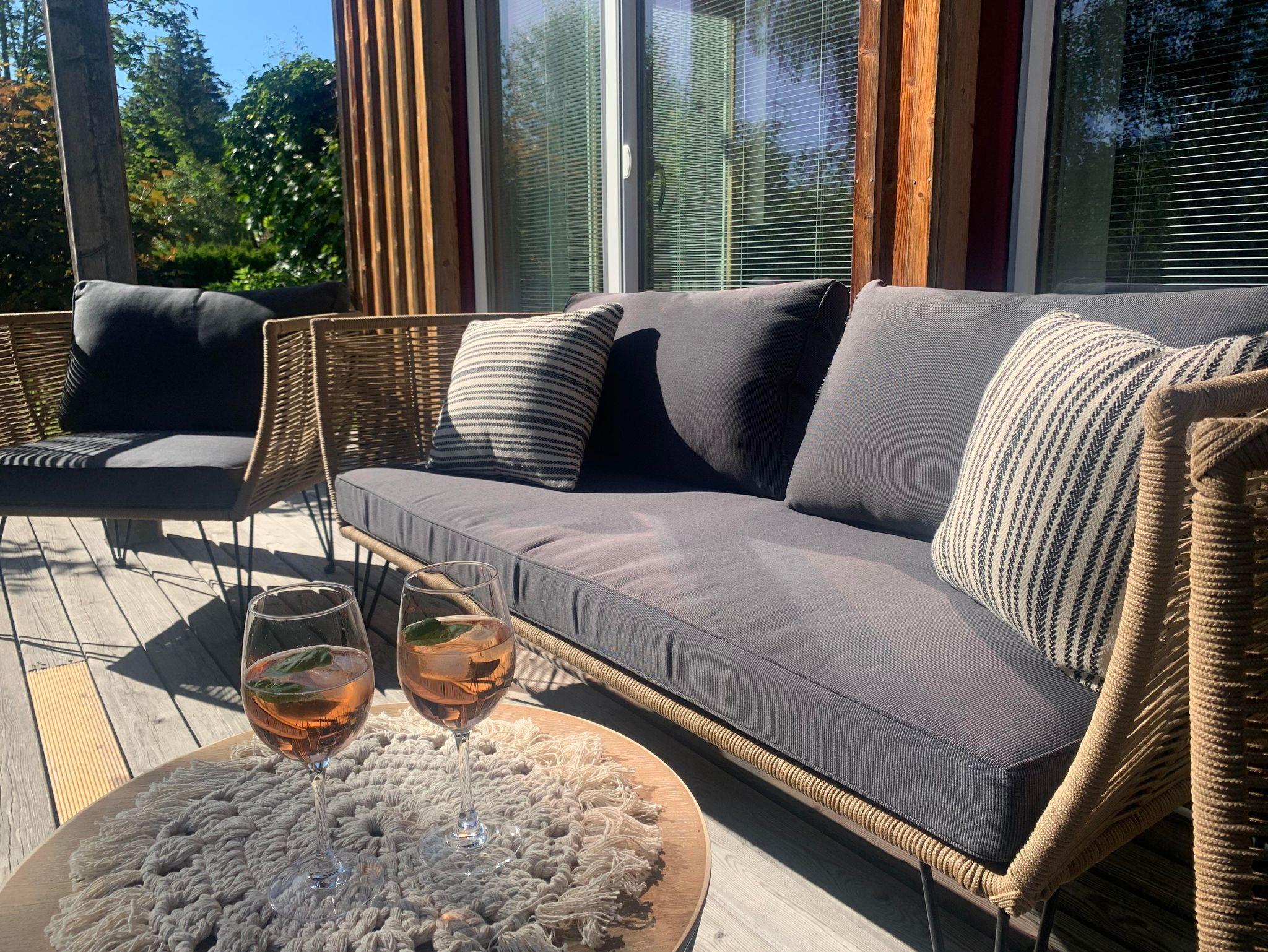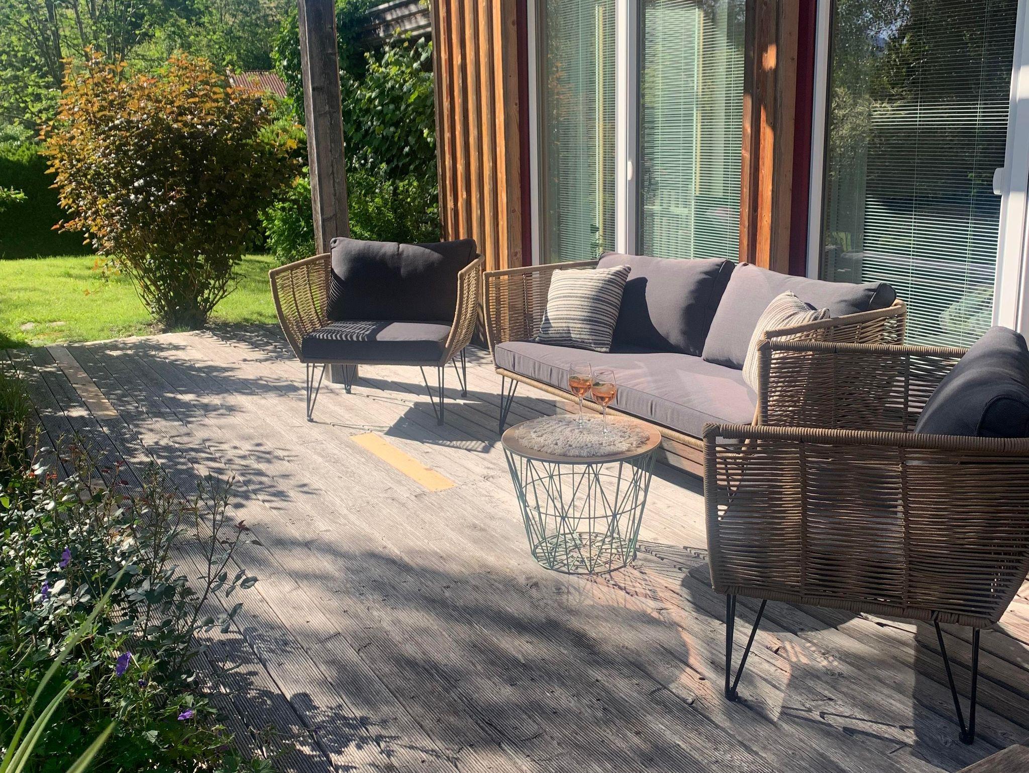 Luxuriöses Ferienhaus in modernem Holzbaustil mit 3 getrennten Schlafzimmern, 2 Badezimmern, 3 Toiletten, grosse Wohnküche mit moderner Ausstattung, Wohnzimmer mit offenem Kamin, einer Lese-Ecke und Kabel-TV, 2 Süd-Balkone im 1.OG, zudem stehen ein eigener großer Garten mit Terrasse und gemütlicher Lounge sowie ein Carport zur Verfügung.