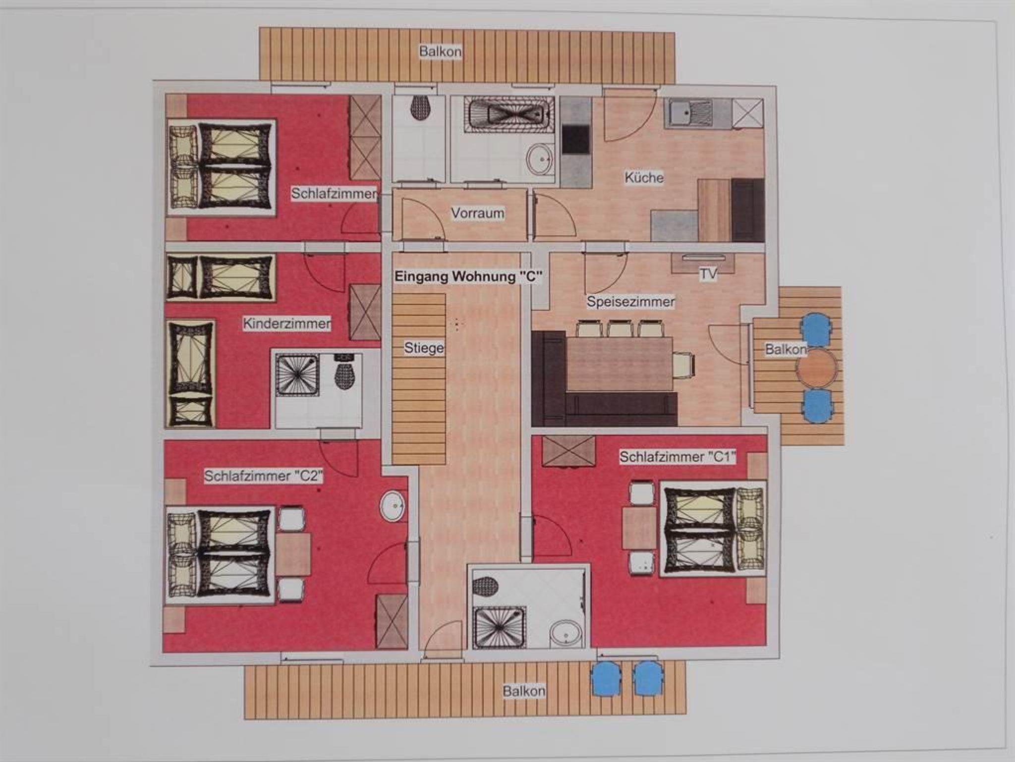 Wohnung C für 4-8 Personen. 1 Doppelzimmer mit Verbindungstür zum Kinderzimmer, Küche, Speisezimmer mit großer Essgruppe, Badewanne, WC, Balkon. Erweiterbar um 2 Schlafzimmer mit Dusche/WC für 6 oder 8 Gäste. Ideal für befreundete Familien.