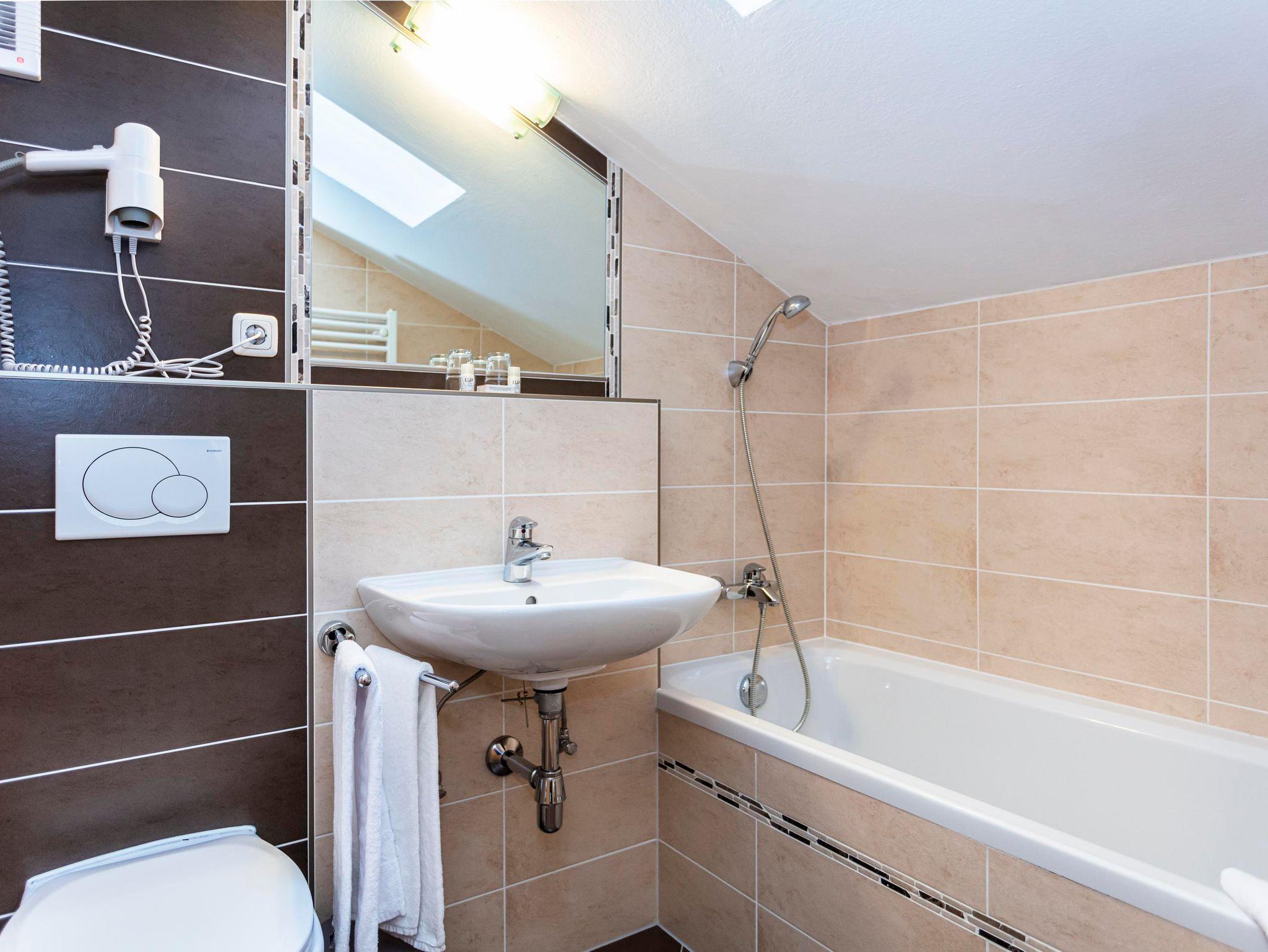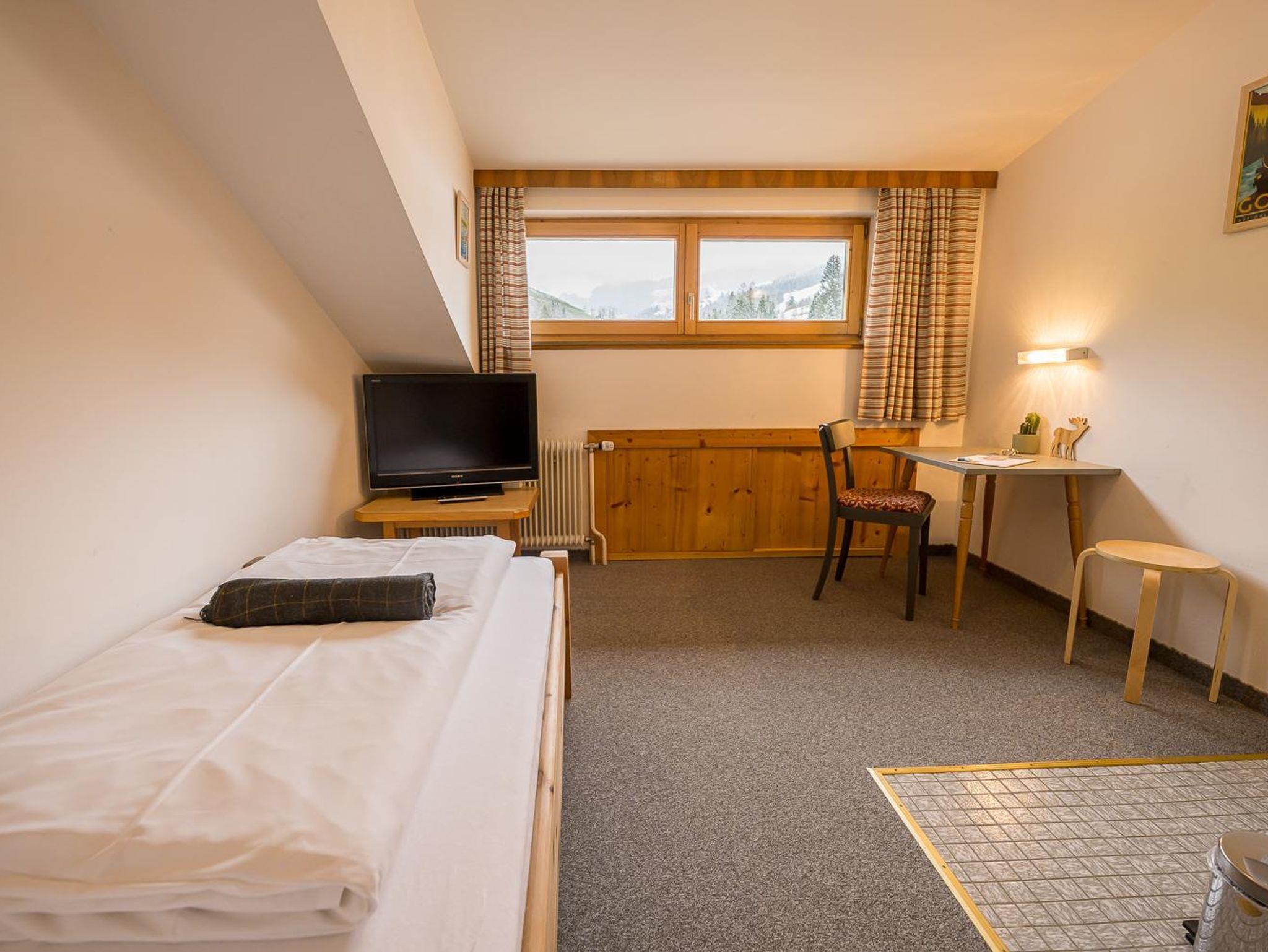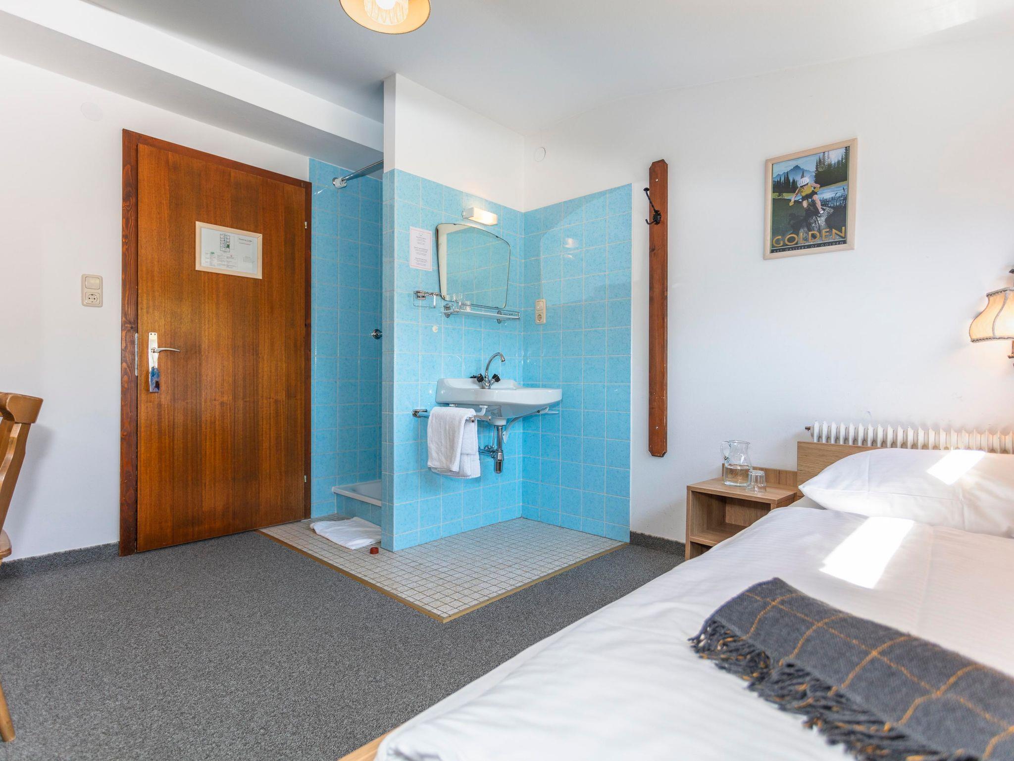 Einzelzimmer mit Dusche und Waschbecken am Zimmer. WC am Gang, Kabel-TV und WLAN