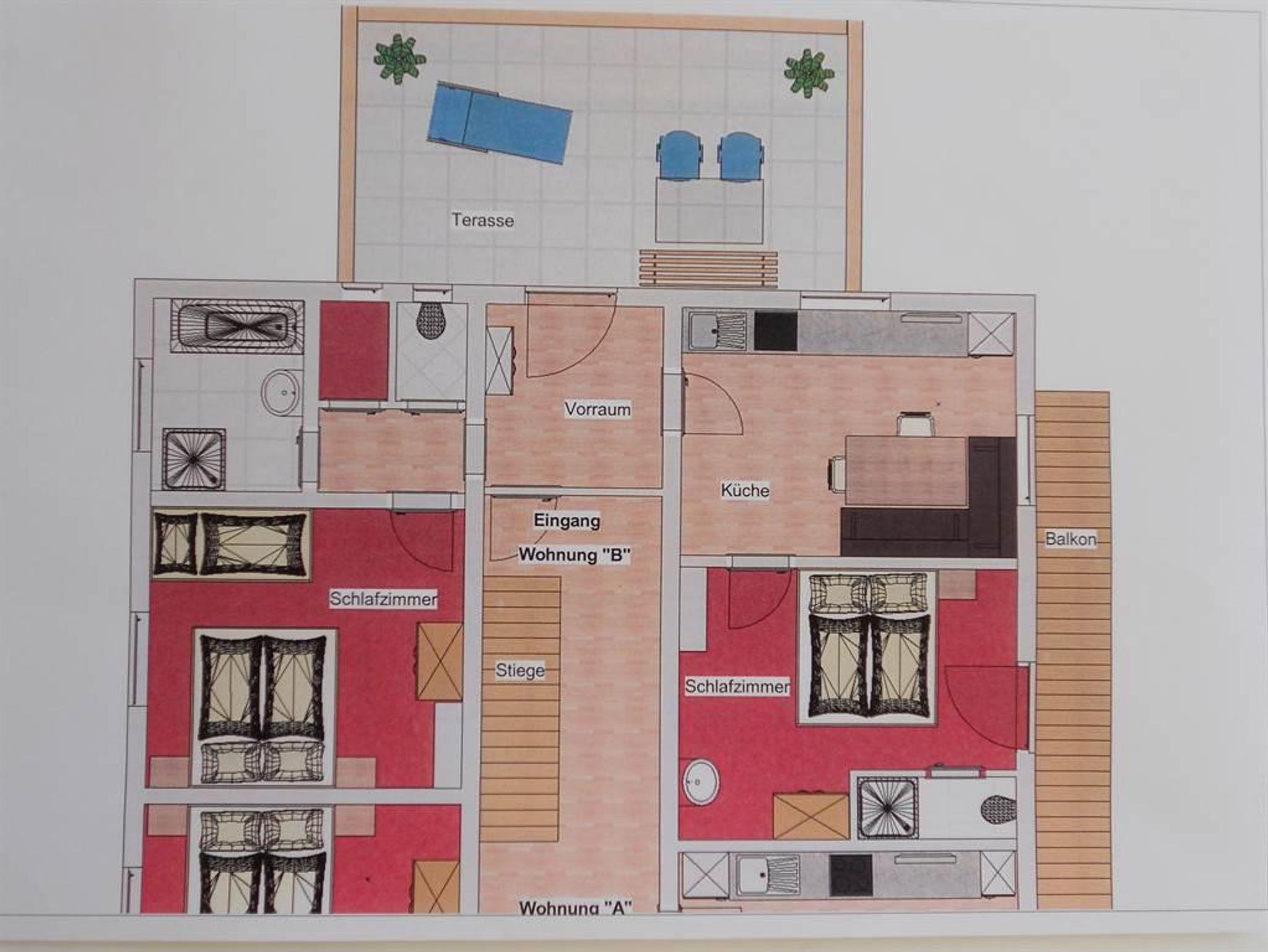 Wohnung B mit gratis W-Lan (Wifi) in der 1. Etage, bietet Platz für 2 - 5 Personen. Vorraum, Wohnküche mit gemütlicher Eckbank, Flachbild TV, 2 Schlafzimmer jeweils mit eigener Dusche, WC extra. Große möblierte Terrasse.
