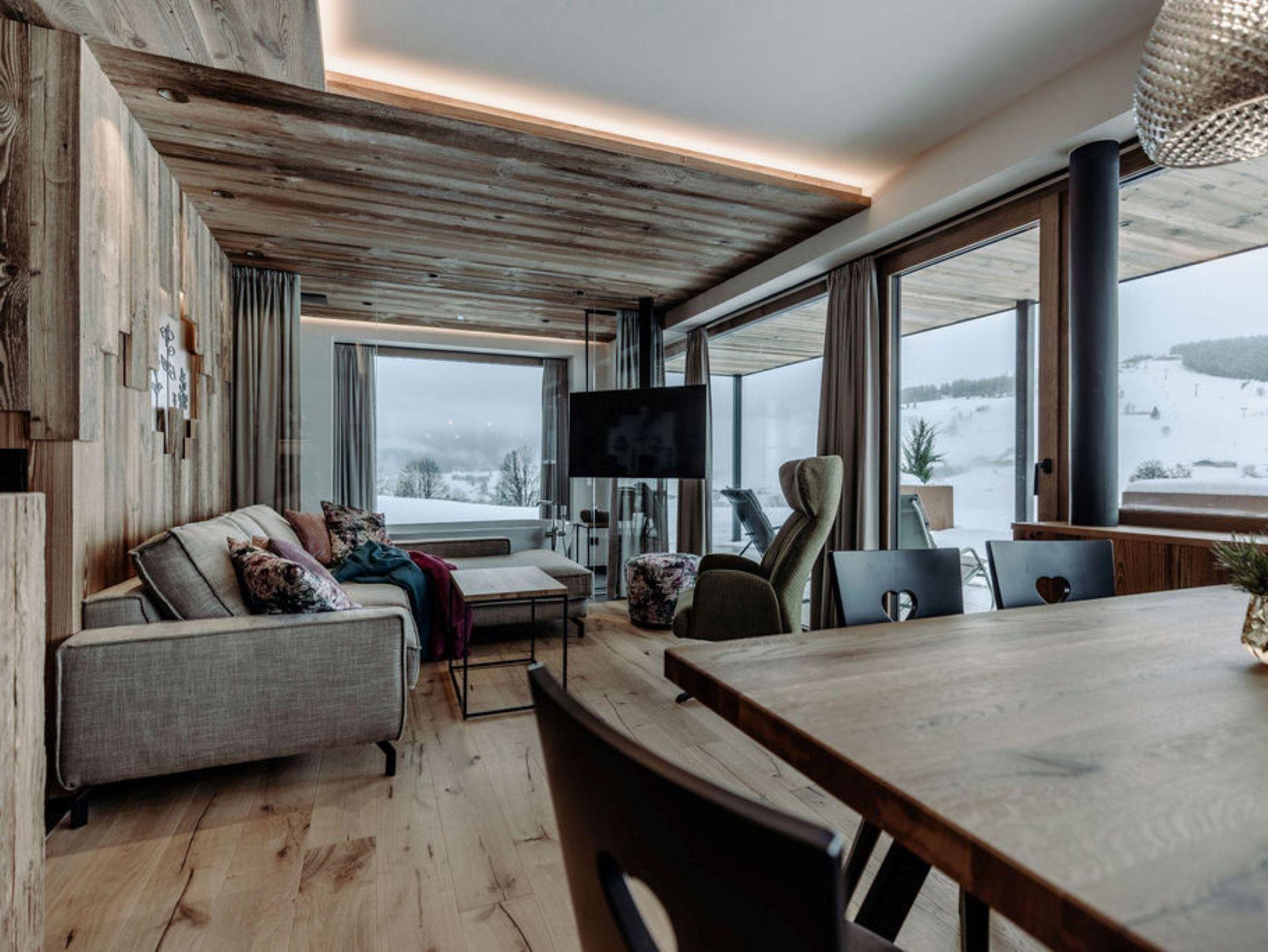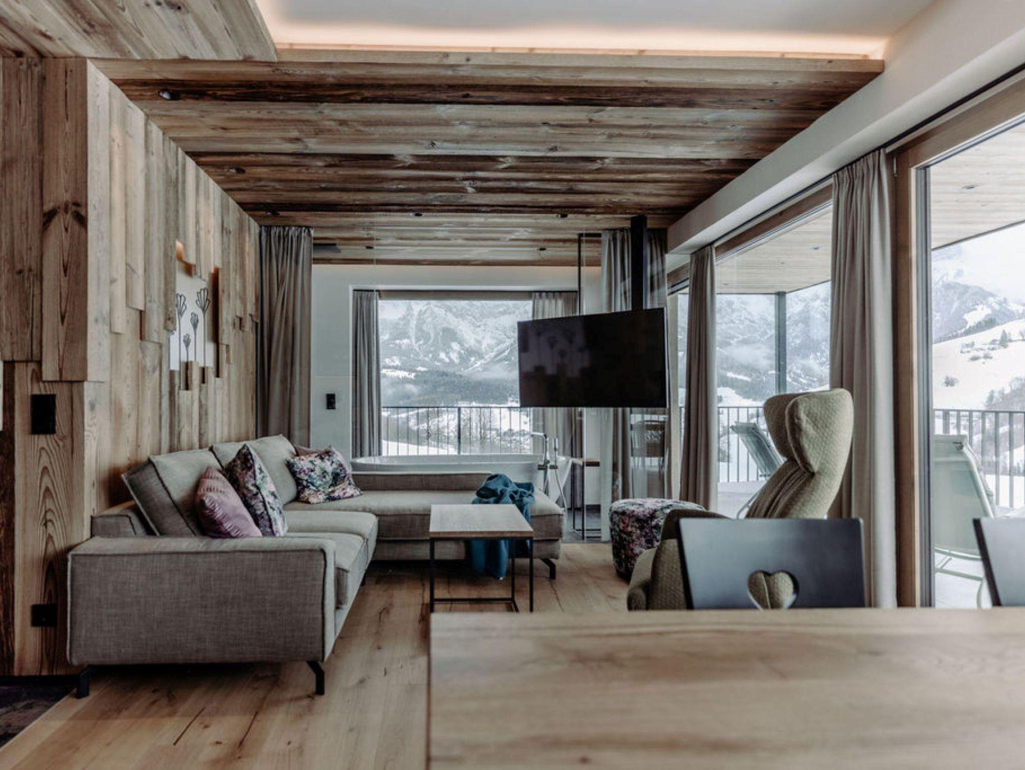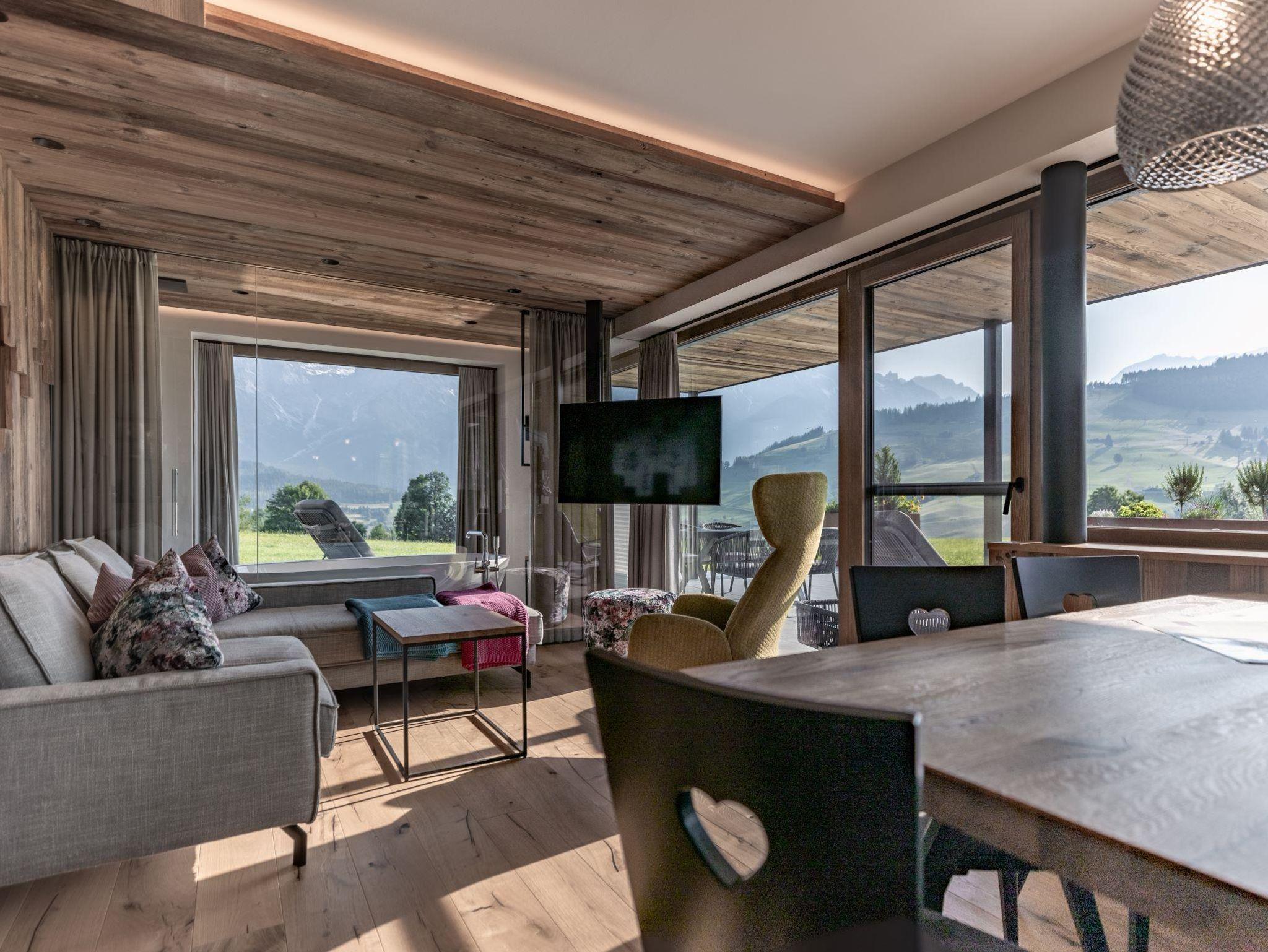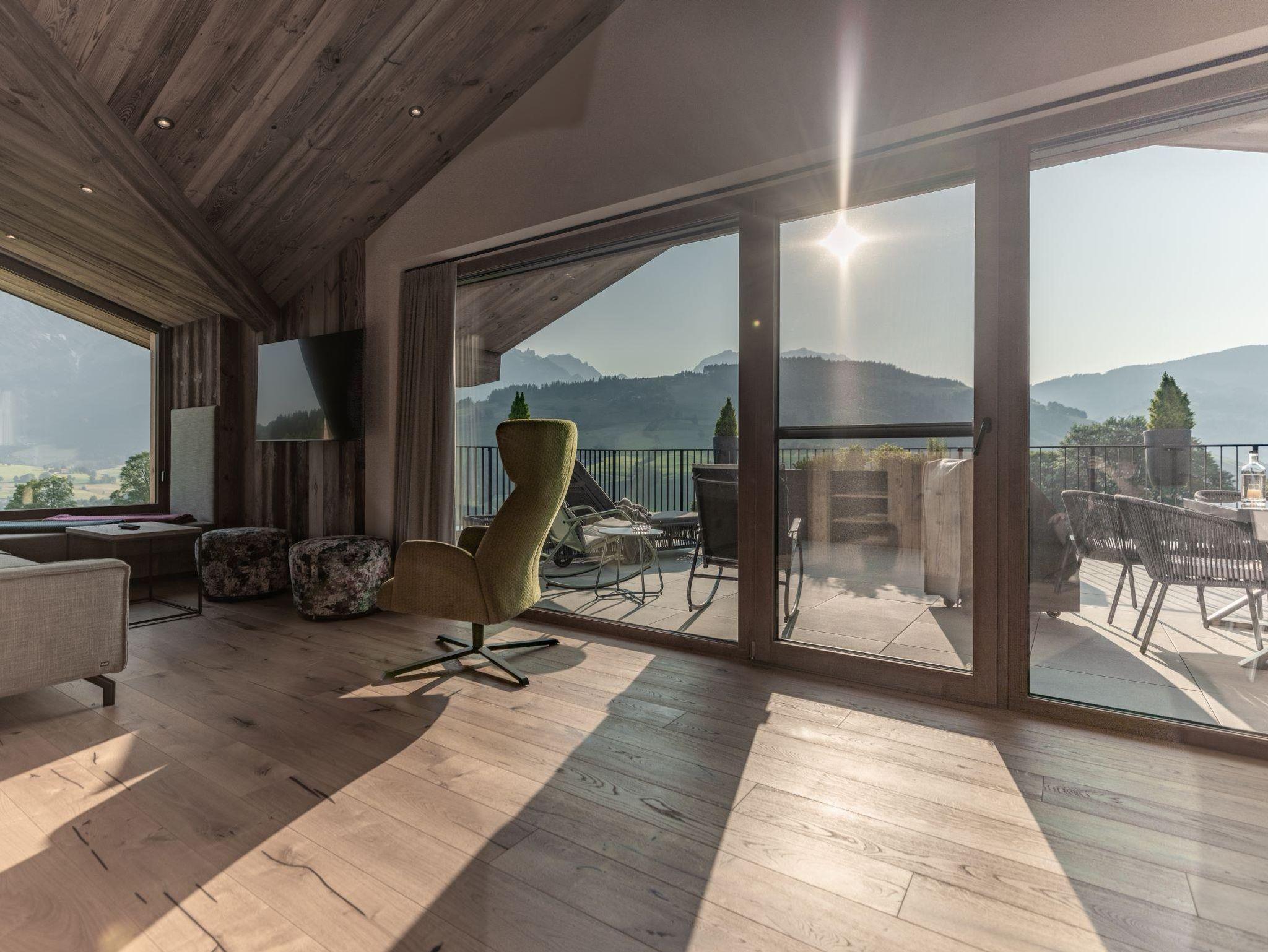 Die Kraft der Natur in Maria Alm erleben Unsere Natursuite bietet ausreichend Platz für bis zu 5 Personen. Verteilt auf zwei separate Zimmer & Badezimmer ist dieses Apartment ideal für Familien oder kleine Gruppen. Die Panoramasauna und die abtrennbare Panoramabadewanne bieten pure Erholung nach einem aufregenden Tag in der Region Hochkönig. Terrasse und Balkon laden zum Frühstücken in der Morgensonne oder Sonnenbaden am Nachmittag ein.