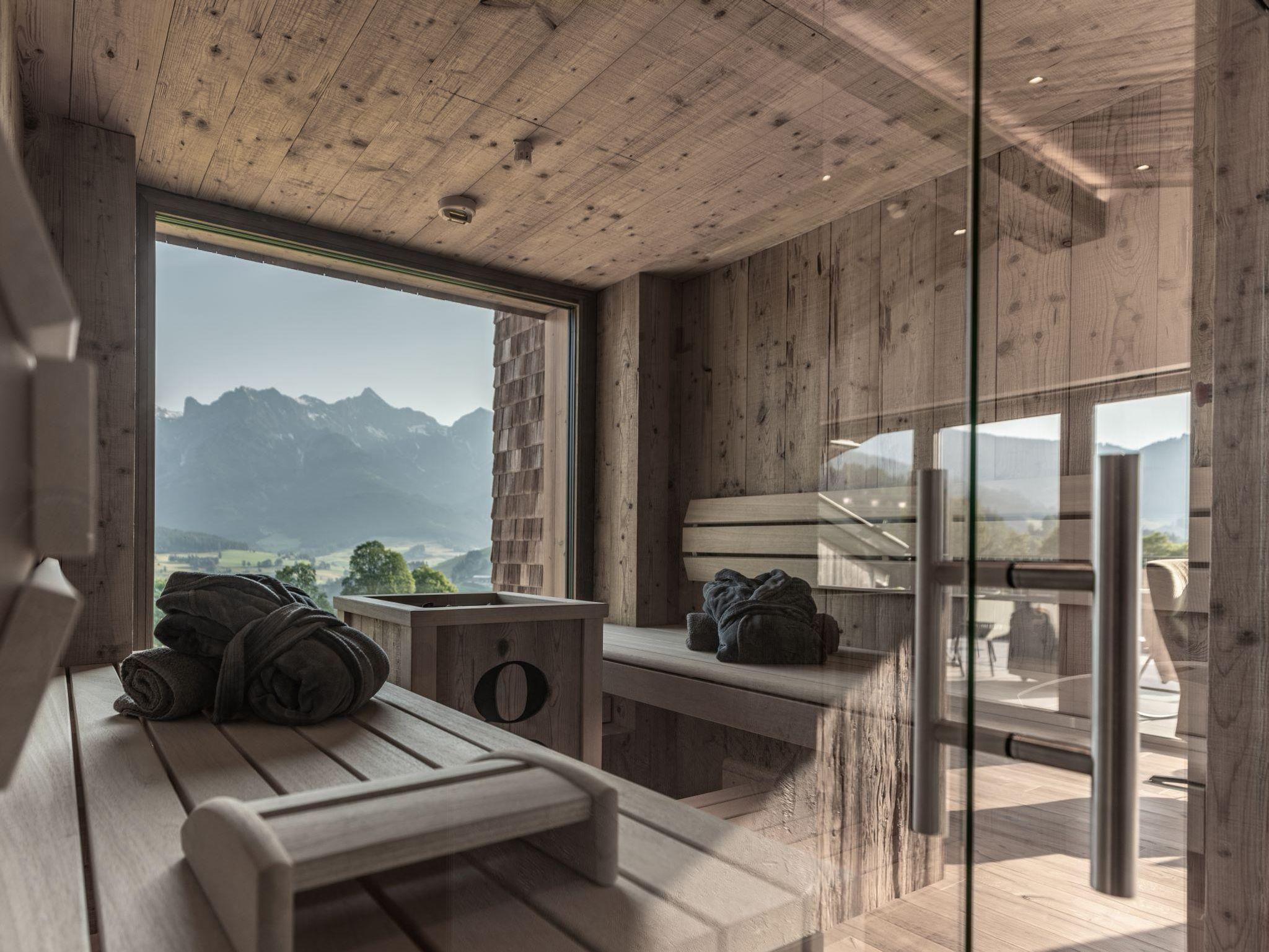 Finde Ruhe und Entspannung im Kräutergarten. Der Ausblick aus der Panoramasauna und -badewanne zeigt die schönsten Seiten der Region Hochkönig.