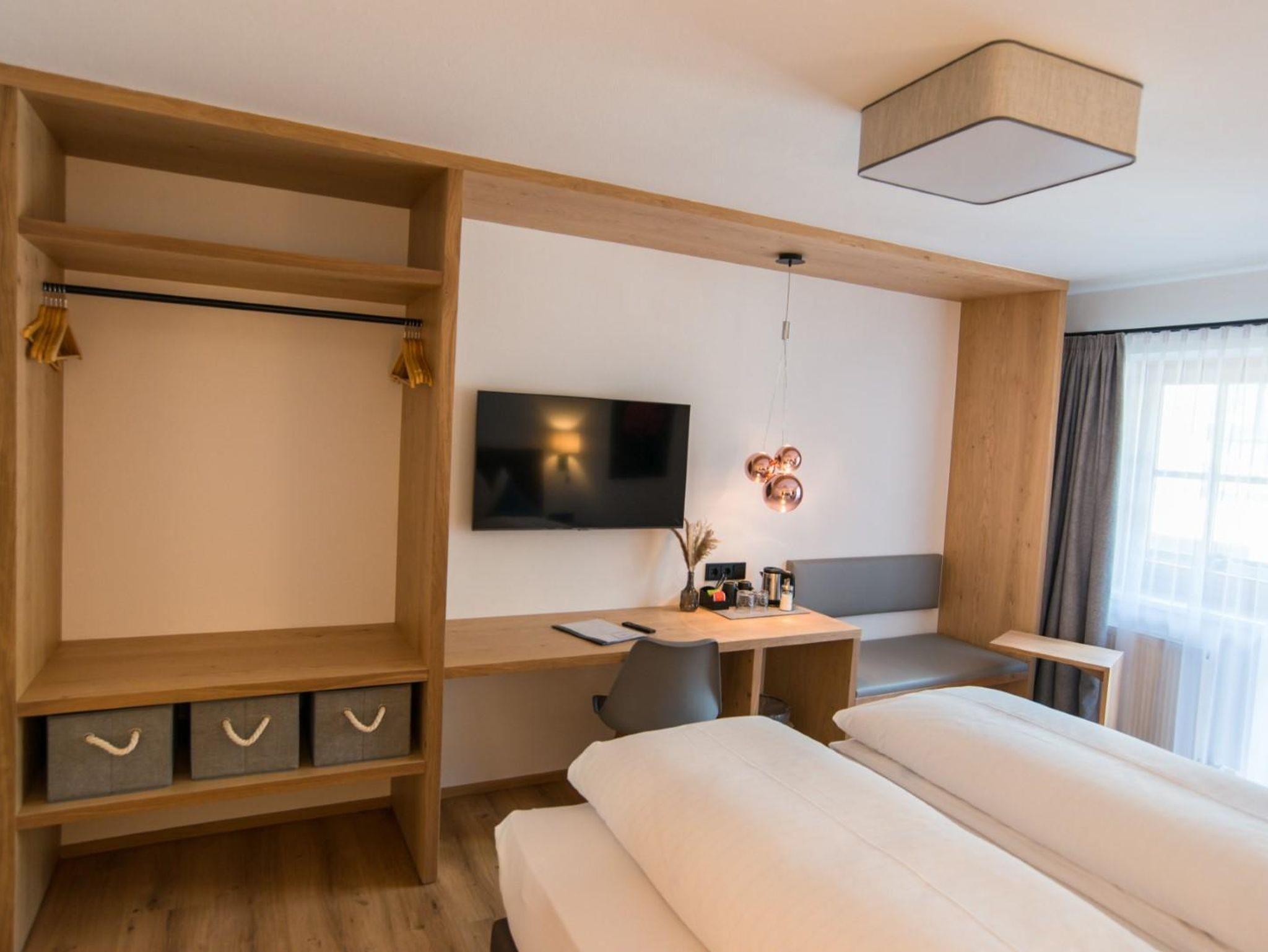 Doppelzimmer mit Zusatzbett und Südbalkon für bis zu drei Personen. Bad mit Dusche, separates WC, LED-TV, kostenloses WLAN, Telefon, Radio, Wasserkocher, Haarfön, Kosemtigspiegel und Balkon. Frühstücksbuffet und Wellnesbereich inklusive