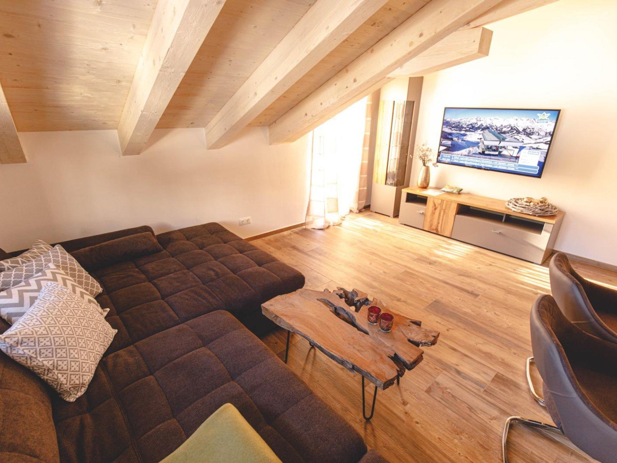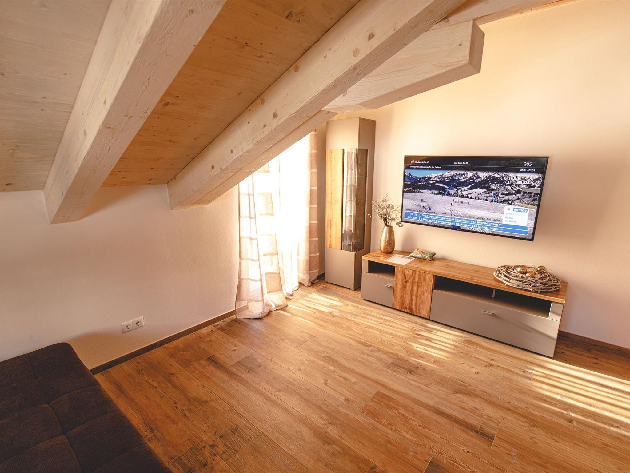 Ferienwohnung für 2-6 Personen l mit 2 getrennten Schlafzimmer und Bäder l großzügiger Wohnraum mit Schlafcouch l Wellnessbereich mit Sauna und Ruheliegen l süd-östliche Lage mit Balkon und Sitzmöglichkeiten l traumhafte Aussicht auf das Hochkönig bzw. Steinerne Meer Massiv l voll ausgestattete Küche mit Essecke l W-Lan l Kabel TV l Radio l Brötchendienst wenn erwünscht.
