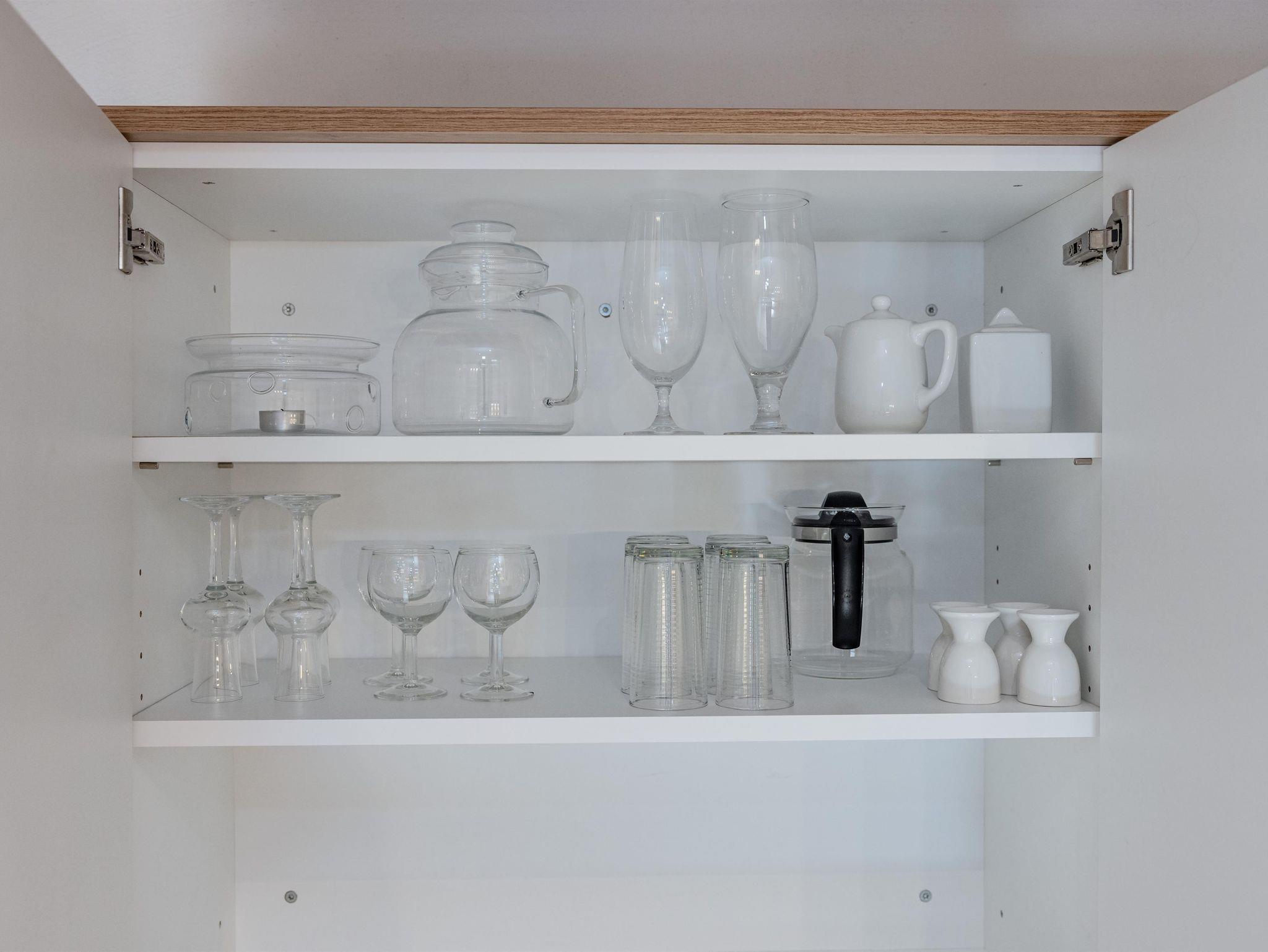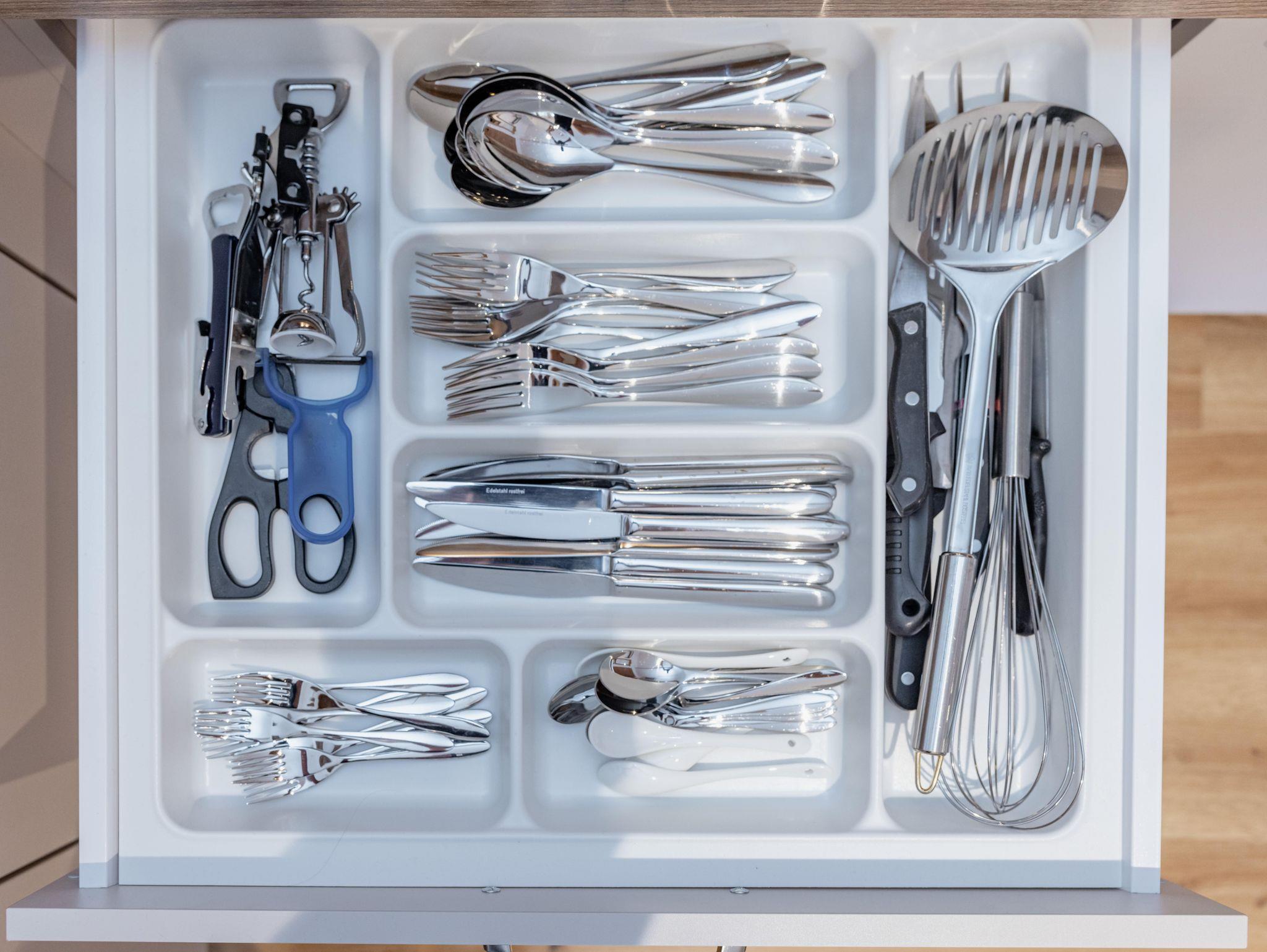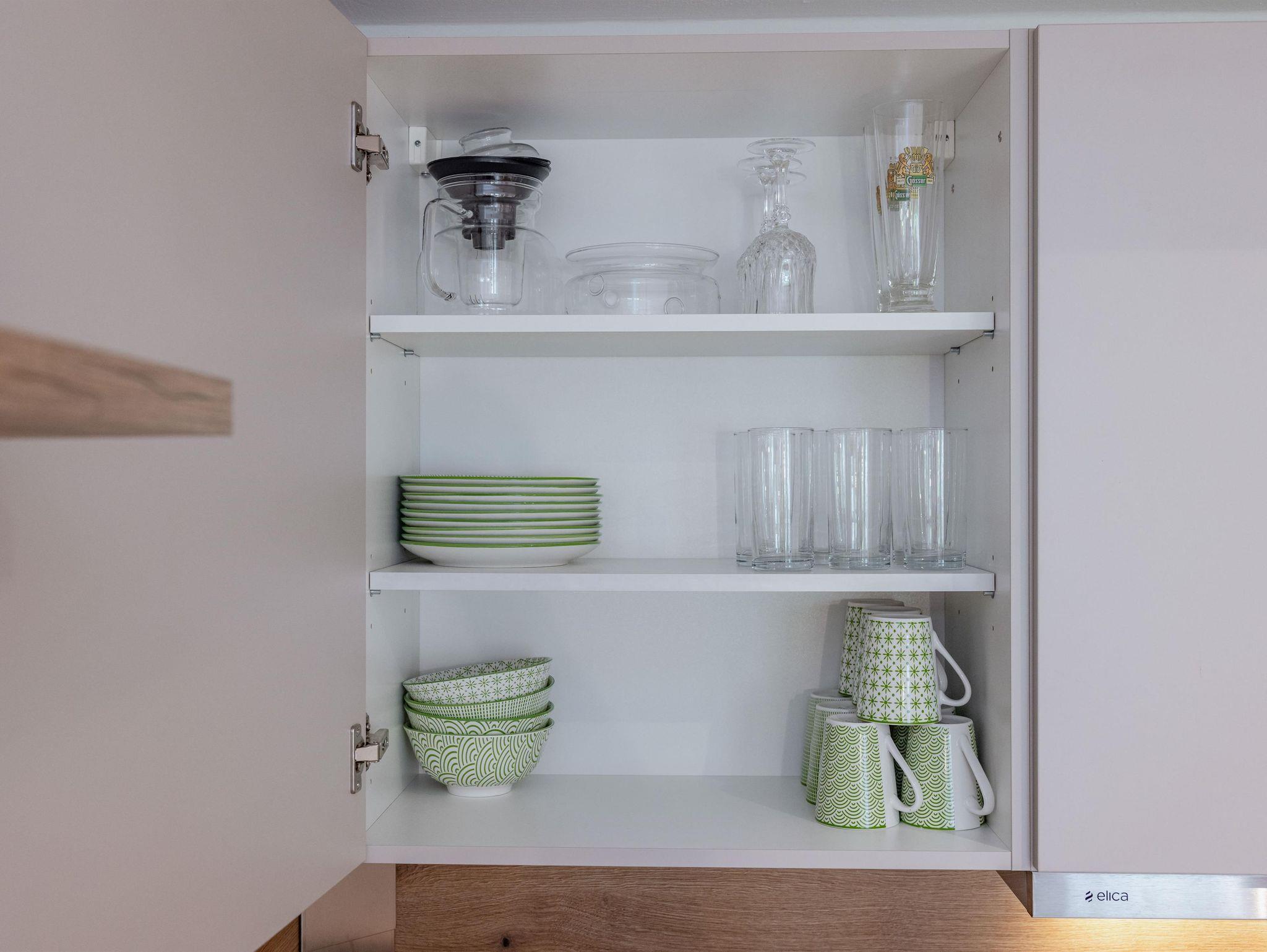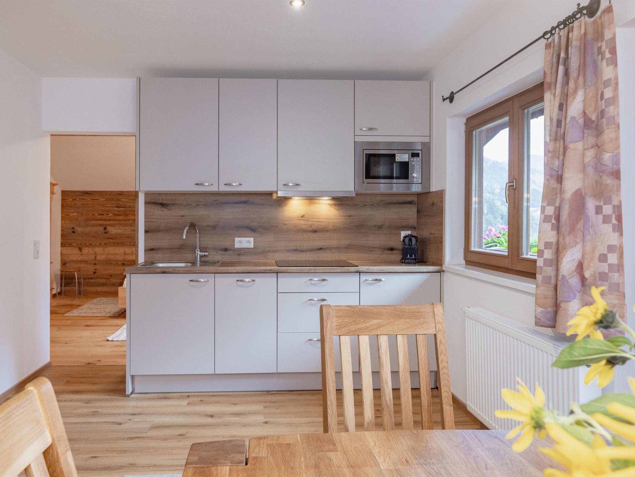 Küche mit Kühlschrank, Induktionsherd, Geschirrspühle, Mikrowelle, Kaffeemaschine bzw. Nespresso - maschine.