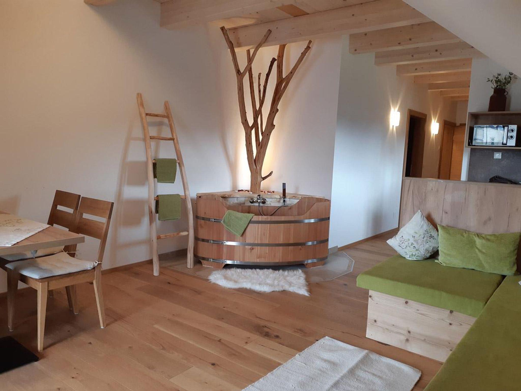 Unser luxuriöses Schwalbennest lässt die Herzen unserer Gäste höher schlagen. Inmitten des Wohnbereiches der Ferienwohnung bietet eine freistehende Badewanne Wellness in den eigenen 4 Wänden.