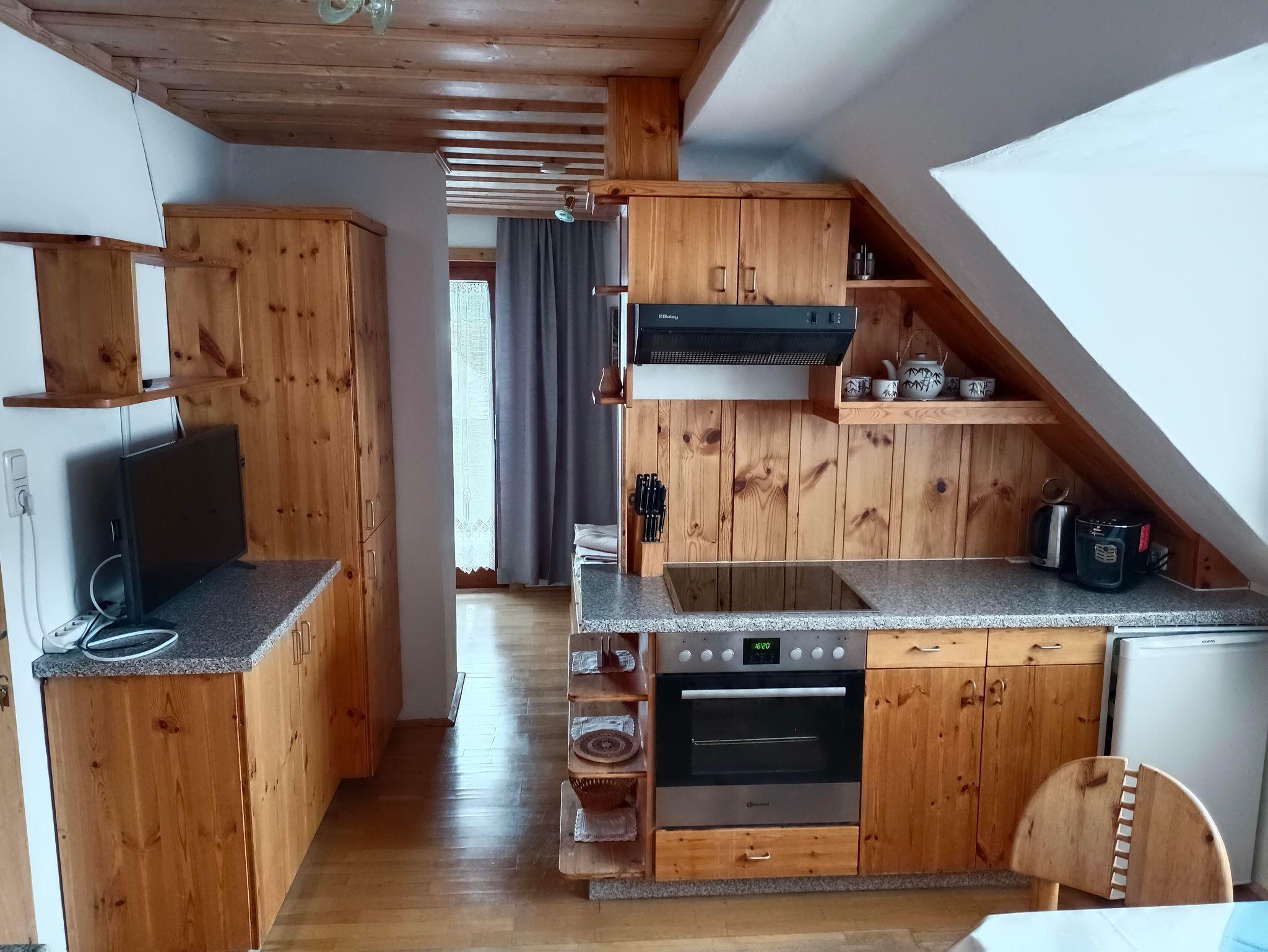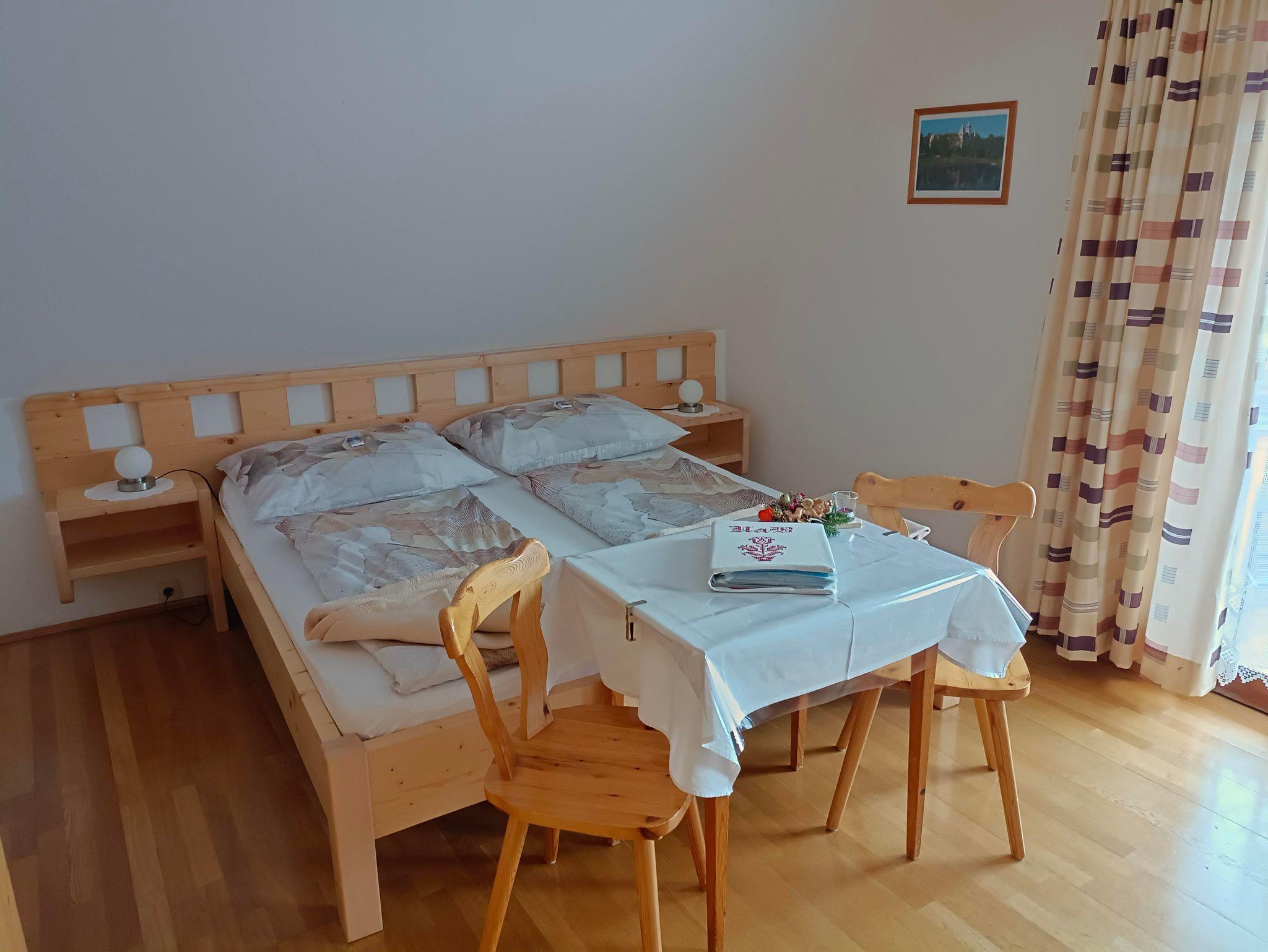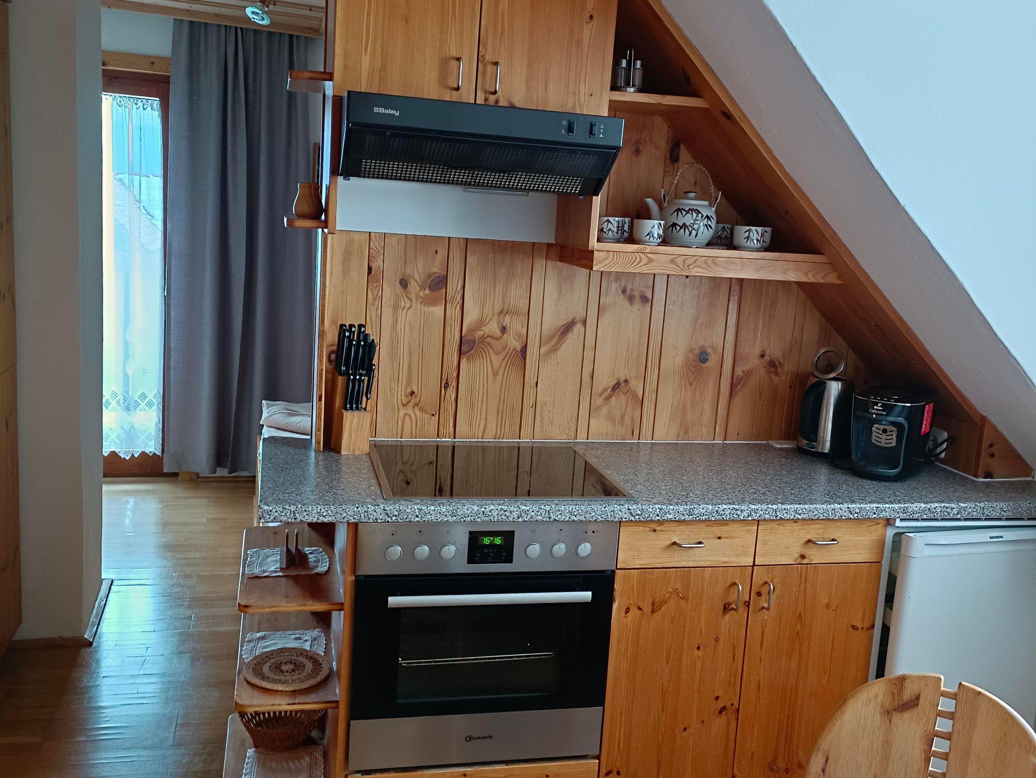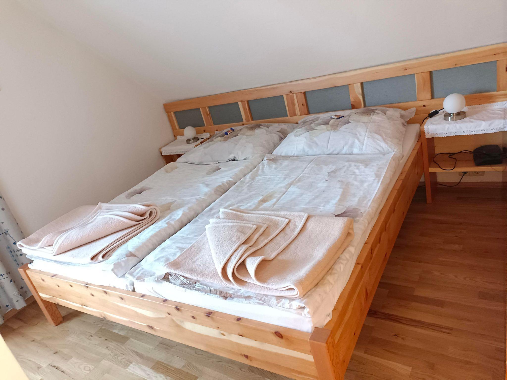 Die Ferienwohnung mit Fichten- und Kiefernholz verfügt über einen Balkon, 2 Duschen, 2 WCS, eine hell gehaltene Wohnküche mit Schlafzimmer, 2. getrenntes Schlafzimmer und Vorraum.