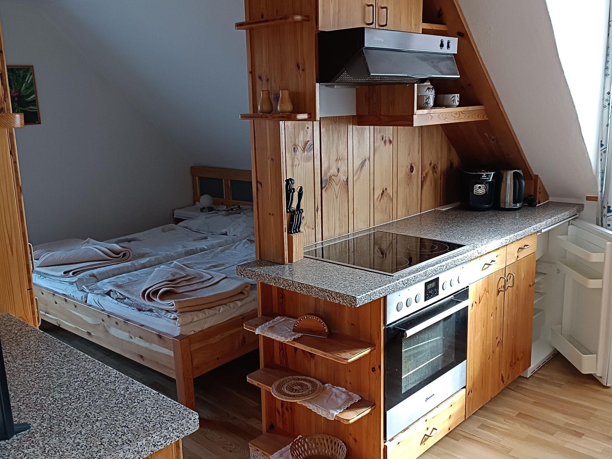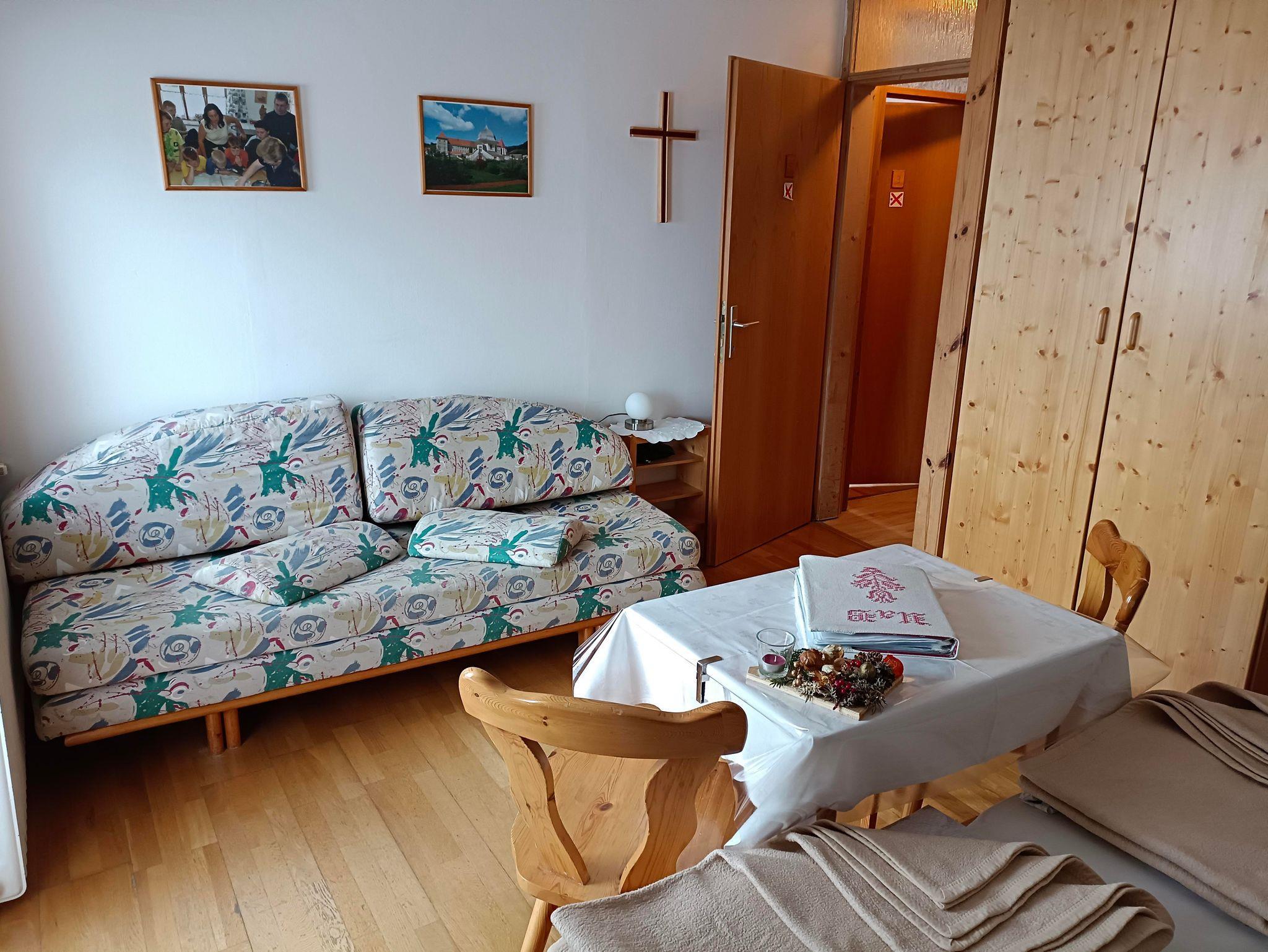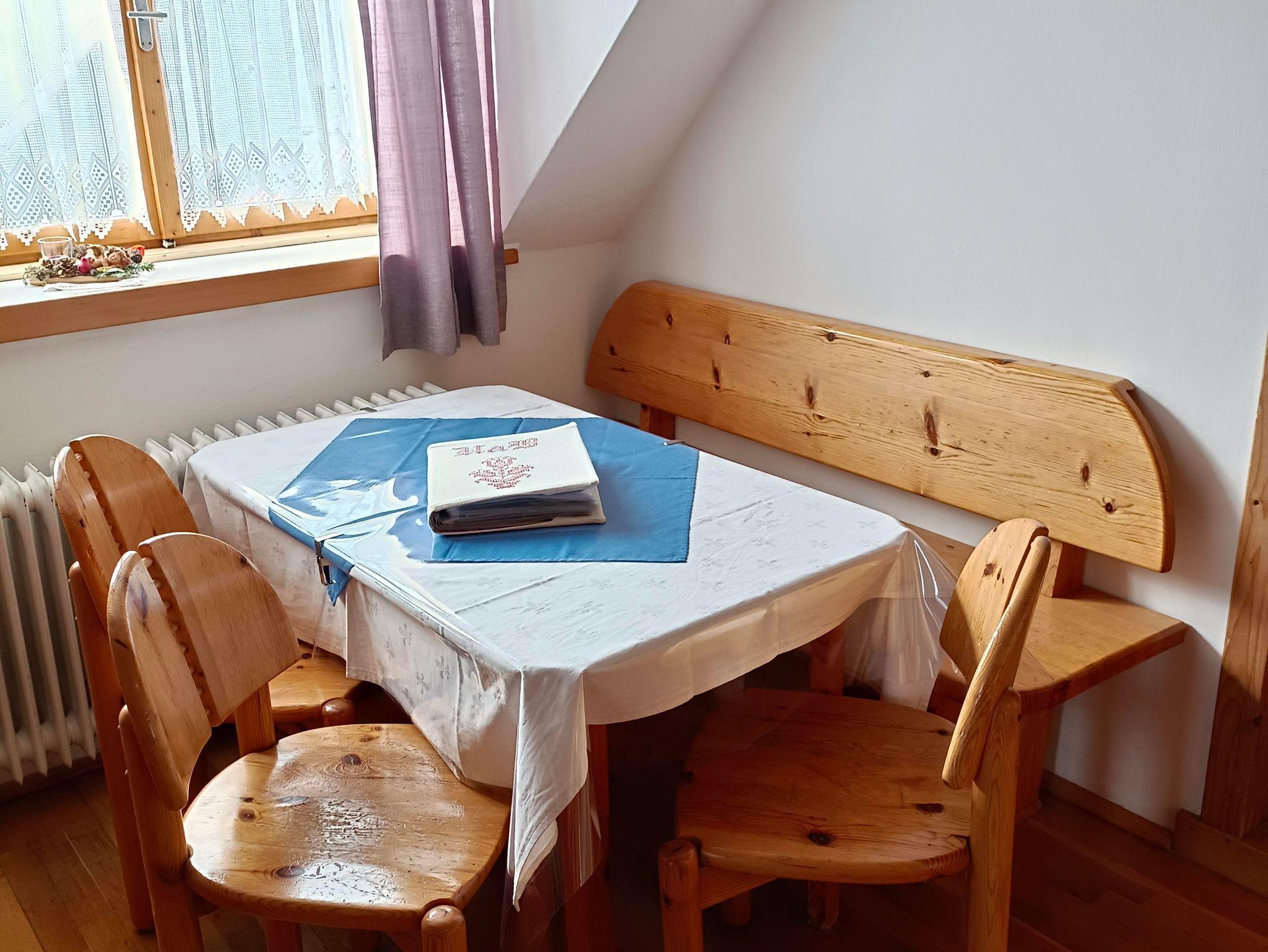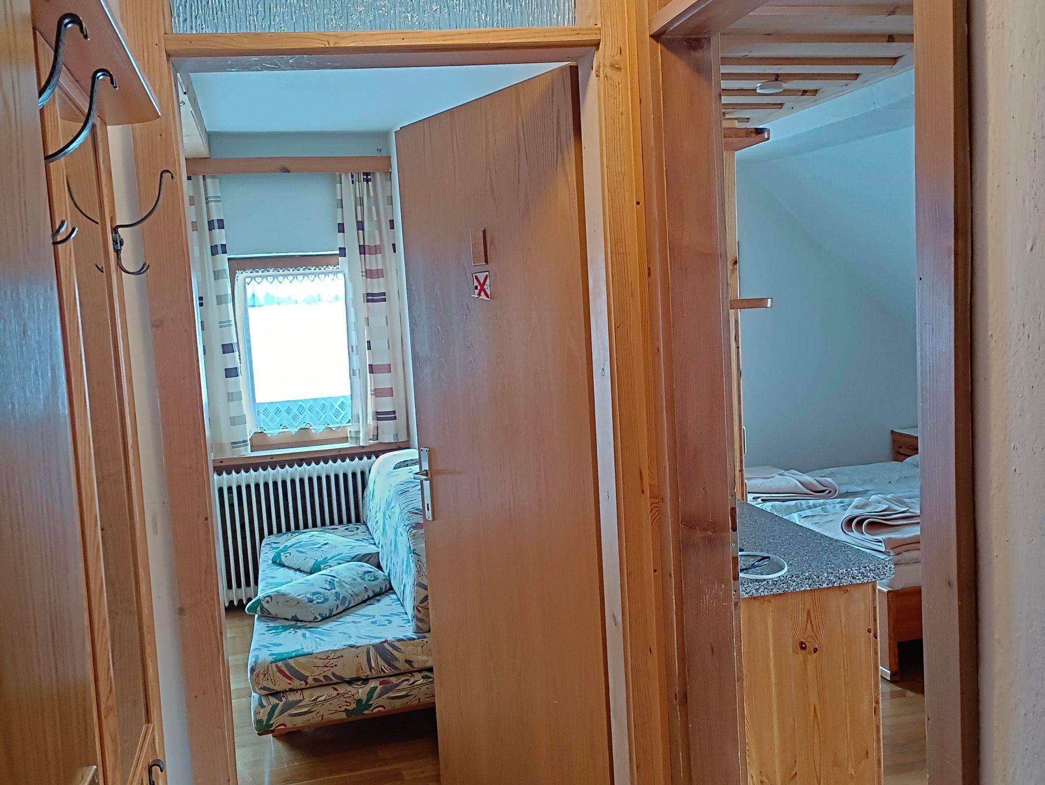 Die Ferienwohnung mit Fichten- und Kiefernholz verfügt über einen Balkon, 2 Duschen, 2 WCS, eine hell gehaltene Wohnküche mit Schlafzimmer, 2. getrenntes Schlafzimmer und Vorraum.