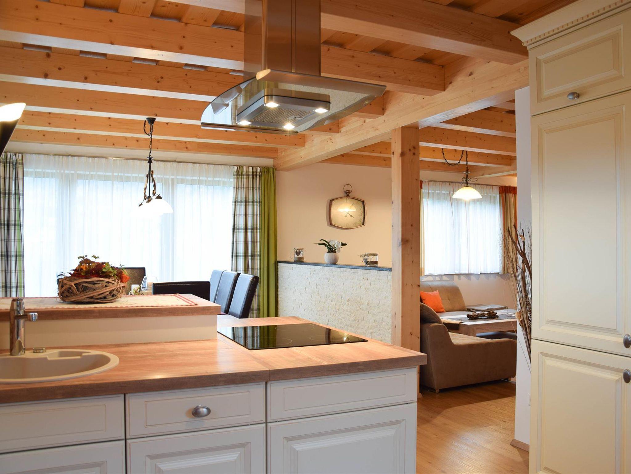 Komplett ausgestattete Küche mit E-Herd mit Cerankochfeld, Backrohr, Kühlschrank mit Gefrierfach, Geschirrspüler, Nespresso Kaffeemaschine, Wasserkocher, Koch- und Essgeschirr