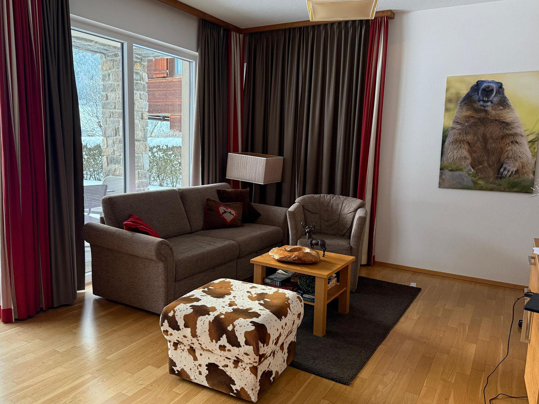 Das Nichtraucher-Appartment befindet sich im Haus D, ebenerdig mit schöner Terrasse und kleiner Rasenfläche, optimal nach Westen ausgerichtet. Ein Tiefgaragenstellplatz, weitere Stellplätze im Freien sowie Ski- und Fahrradkeller stehen zur Verfügung.