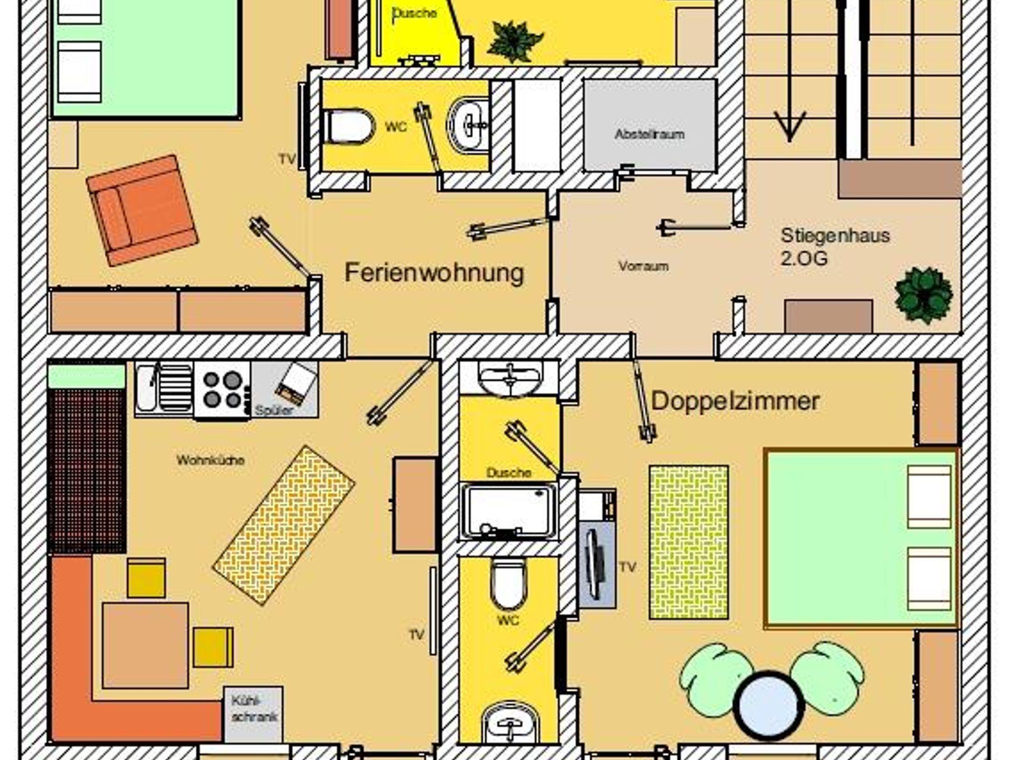 Unsere Ferienwohnung für 2-4 Personen mit Vorraum, zwei Schlafzimmern für je zwei Personen mit jeweils Bad, Toilette, TV (SAT) und kostenlosem Internet. Wohnraum mit Küchenzeile, Geschirrspülmaschine, Backrohr, Mikrowelle usw.