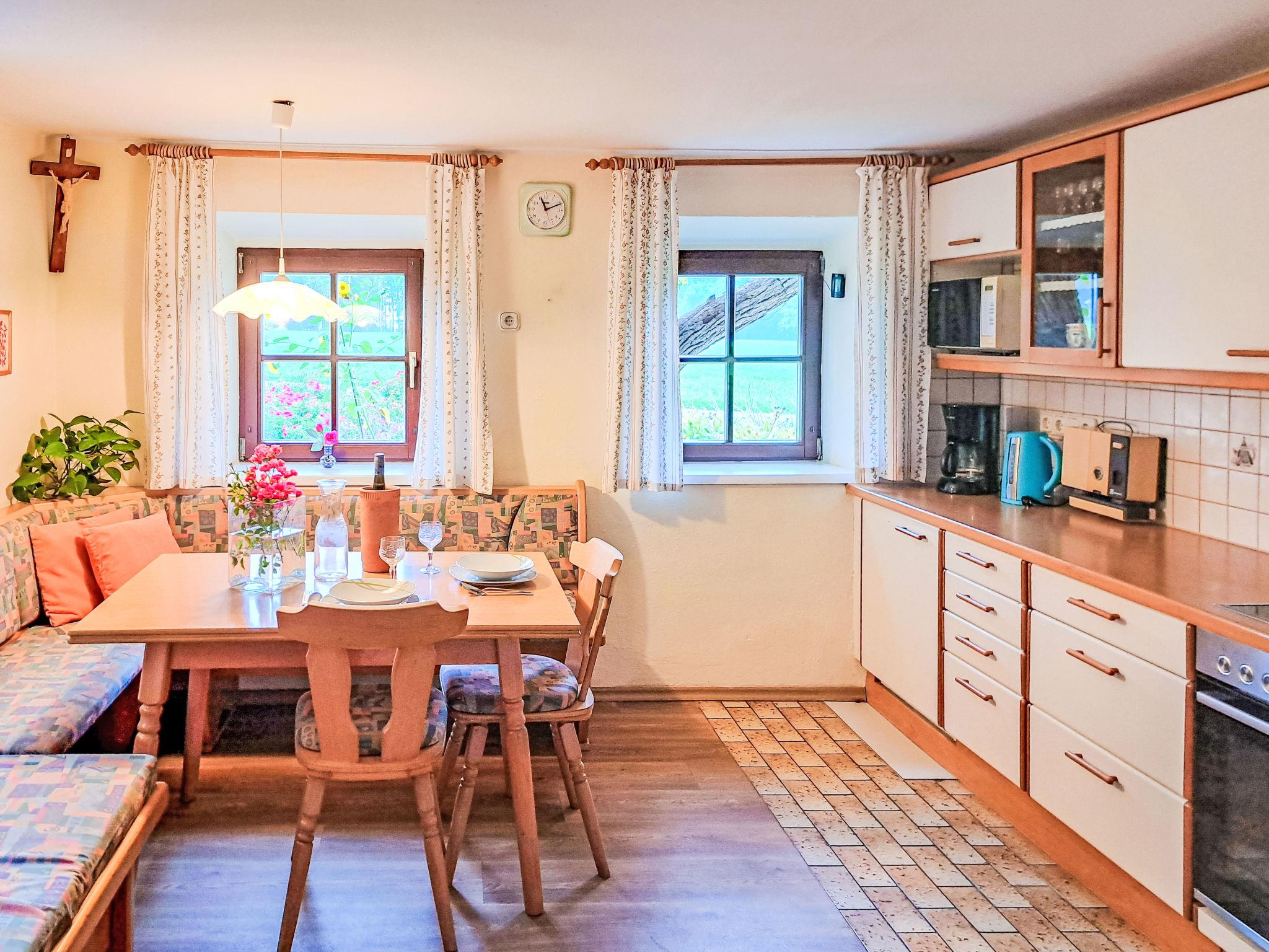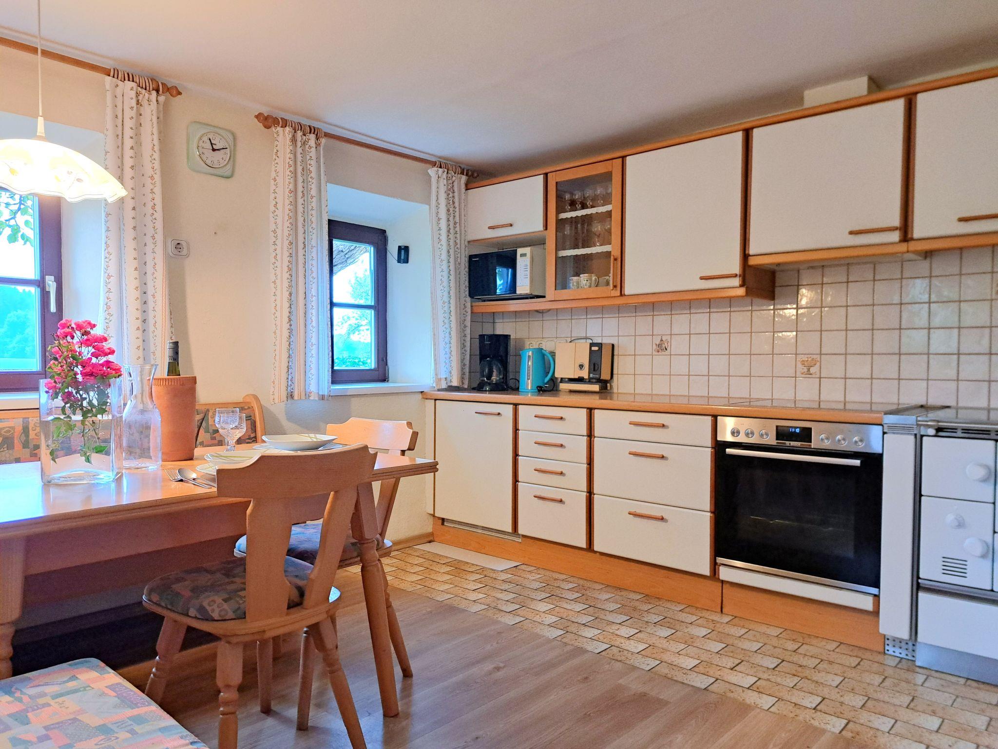 "Lindnerhof", 4-room farmhouse 130 m2. Rustic and cosy furnishings: entrance hall. Living/dining room. Large kitchen (4 hot plates, oven, dishwasher, kettle, freezer) with dining nook. Bath/shower/WC. Upper floor: 2 double bedrooms. 1 room with 2 beds. Wooden floors. Beautiful view of the countryside. Facilities: washing machine (extra). Please note: non-smokers only.