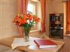 Wir bieten Ihnen eine komplett ausgestattete Küche mit E-Herd, Mikrowelle, Backofen, Kaffemaschine, Wasserkocher, Kühlschrank mit Gefrierfach und Geschirrspülmaschine.