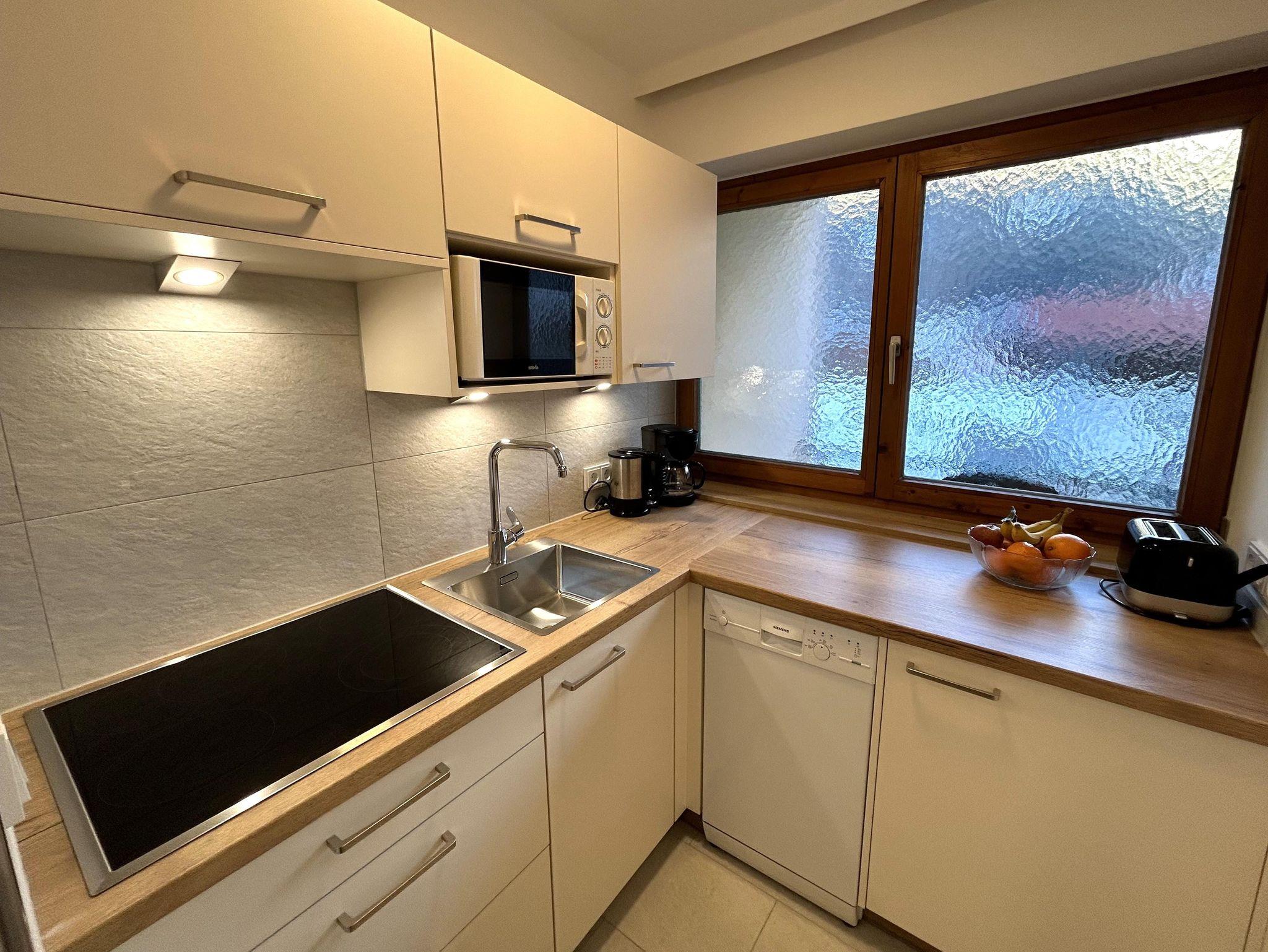 Wohnschlafzimmer mit Doppelcouch, gepolsterter Eßecke und Bauernkomode. Zweibettzimmer mit 2 Fauteuils und Tischchen, Wandvertäfelung. Große Schiebetüre zum Liegebalkon bzw. zur Gartenterasse. Vorraum mit Schrank. Frisch renoviertes Badezimmer mit Dusche, Waschbecken, WC und Heizstrahler. Seperate Küche mit 3-Platten-Herd, Dunstabzug, kompl. Geschirr, Kühlschrank, Geschirrspülmaschine, Mikrowellenherd, Kaffeemaschine. Farb-TV, Safe, Internetanschluss.