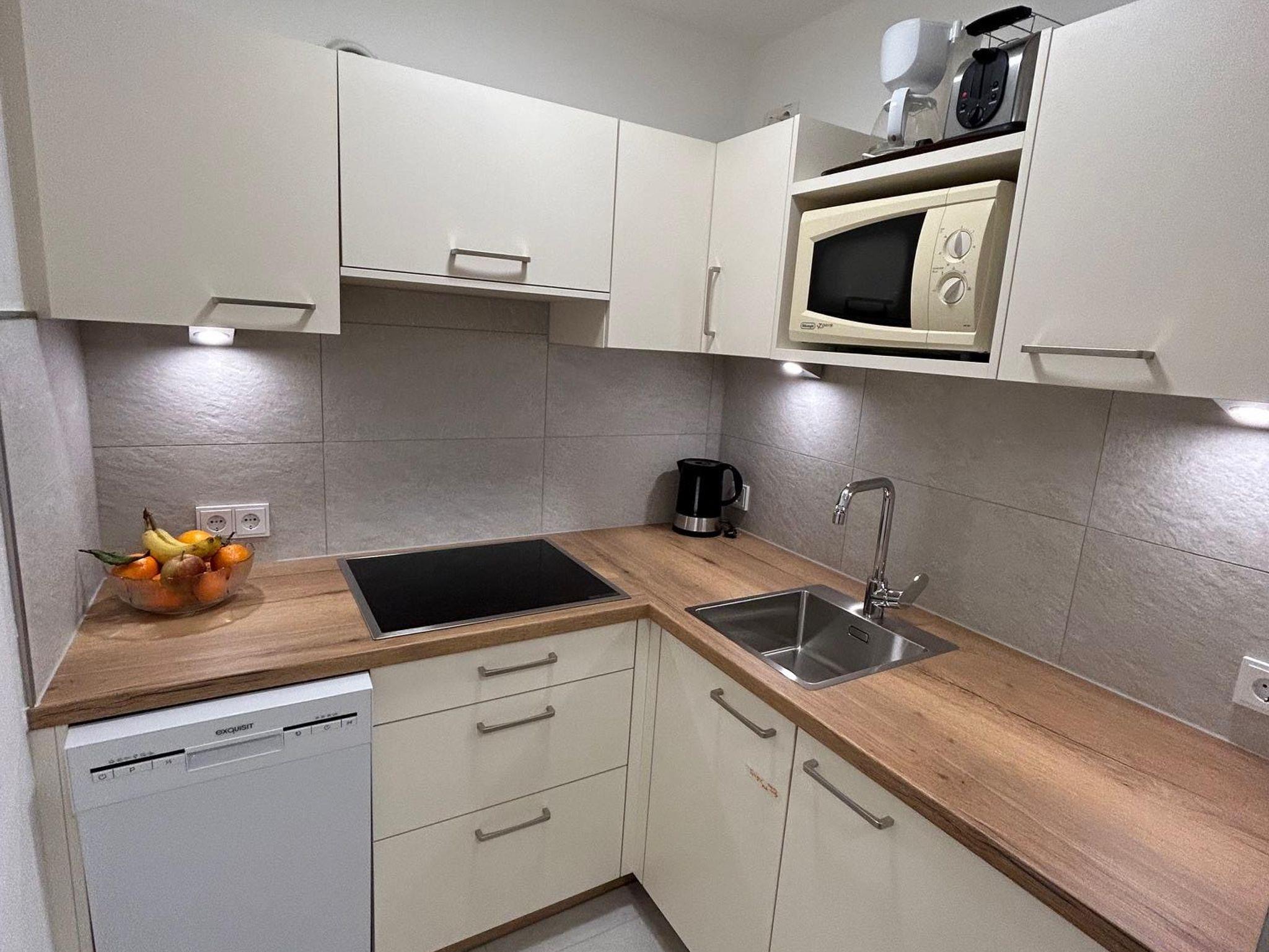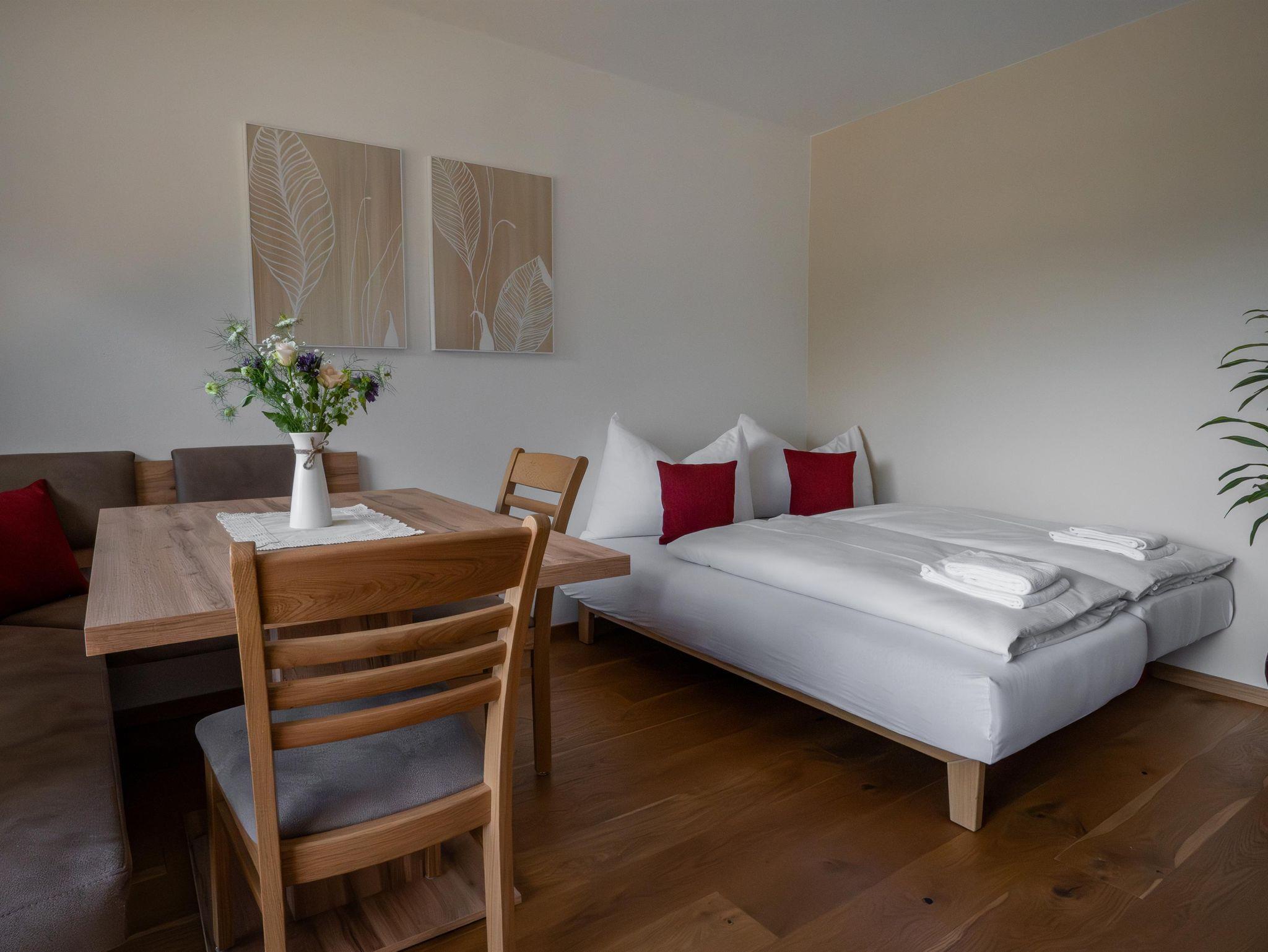 Wohnschlafzimmer mit Doppelcouch, gepolsterter Eßecke und Bauernkomode. Zweibettzimmer mit 2 Fauteuils und Tischchen, Wandvertäfelung. Große Schiebetüre zum Liegebalkon bzw. zur Gartenterasse. Vorraum mit Schrank. Frisch renoviertes Badezimmer mit Dusche, Waschbecken, WC und Heizstrahler. Seperate Küche mit 3-Platten-Herd, Dunstabzug, kompl. Geschirr, Kühlschrank, Geschirrspülmaschine, Mikrowellenherd, Kaffeemaschine. Farb-TV, Safe, Internetanschluss.