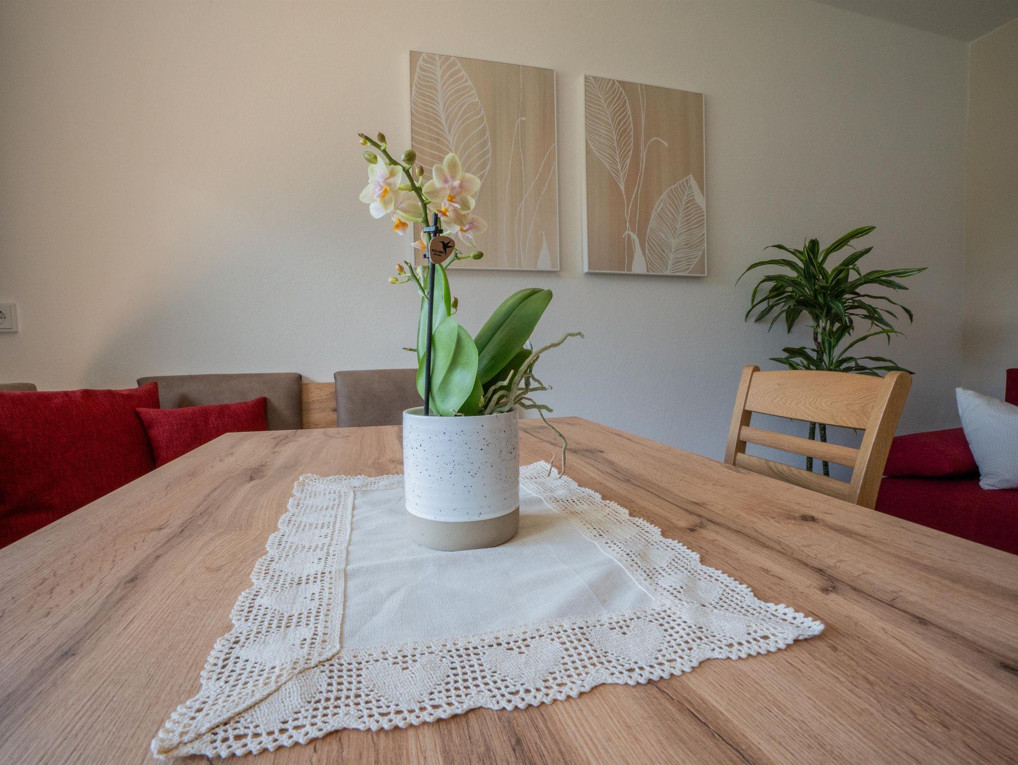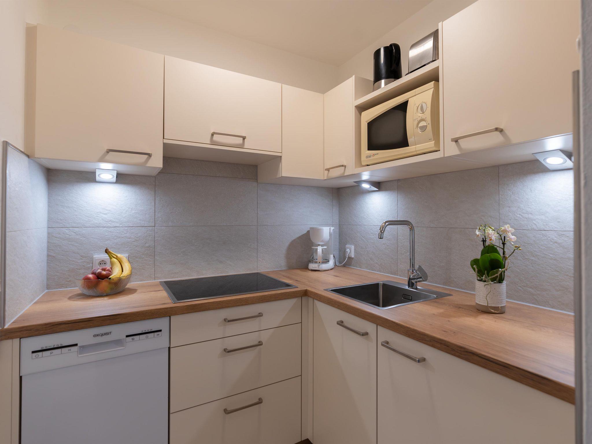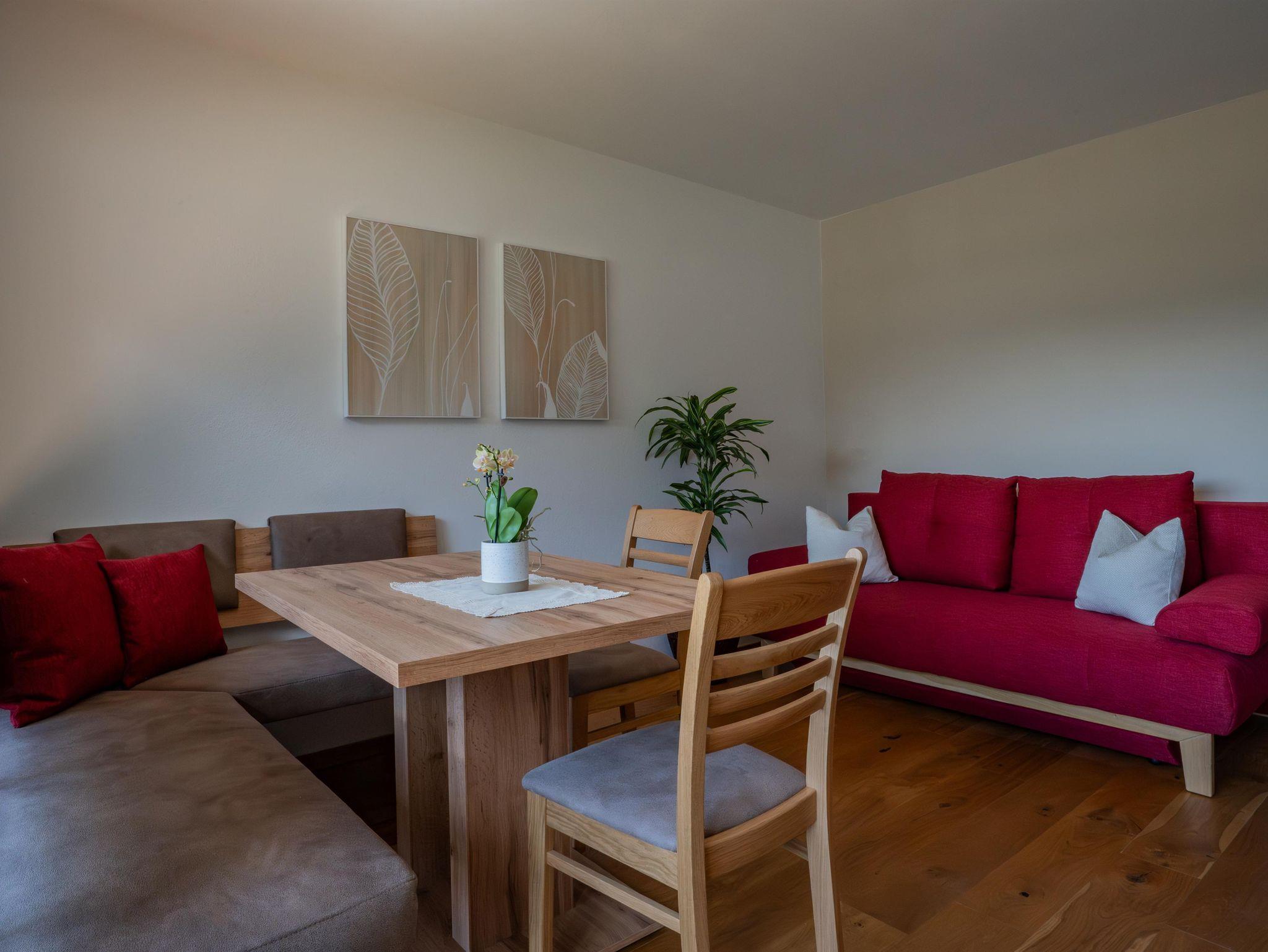 Wohnschlafzimmer mit Doppelcouch, gepolsterter Eßecke und Bauernkomode. Zweibettzimmer mit 2 Fauteuils und Tischchen, Wandvertäfelung. Große Schiebetüre zum Liegebalkon bzw. zur Gartenterasse. Vorraum mit Schrank. Frisch renoviertes Badezimmer mit Dusche, Waschbecken, WC und Heizstrahler. Seperate Küche mit 3-Platten-Herd, Dunstabzug, kompl. Geschirr, Kühlschrank, Geschirrspülmaschine, Mikrowellenherd, Kaffeemaschine. Farb-TV, Safe, Internetanschluss.