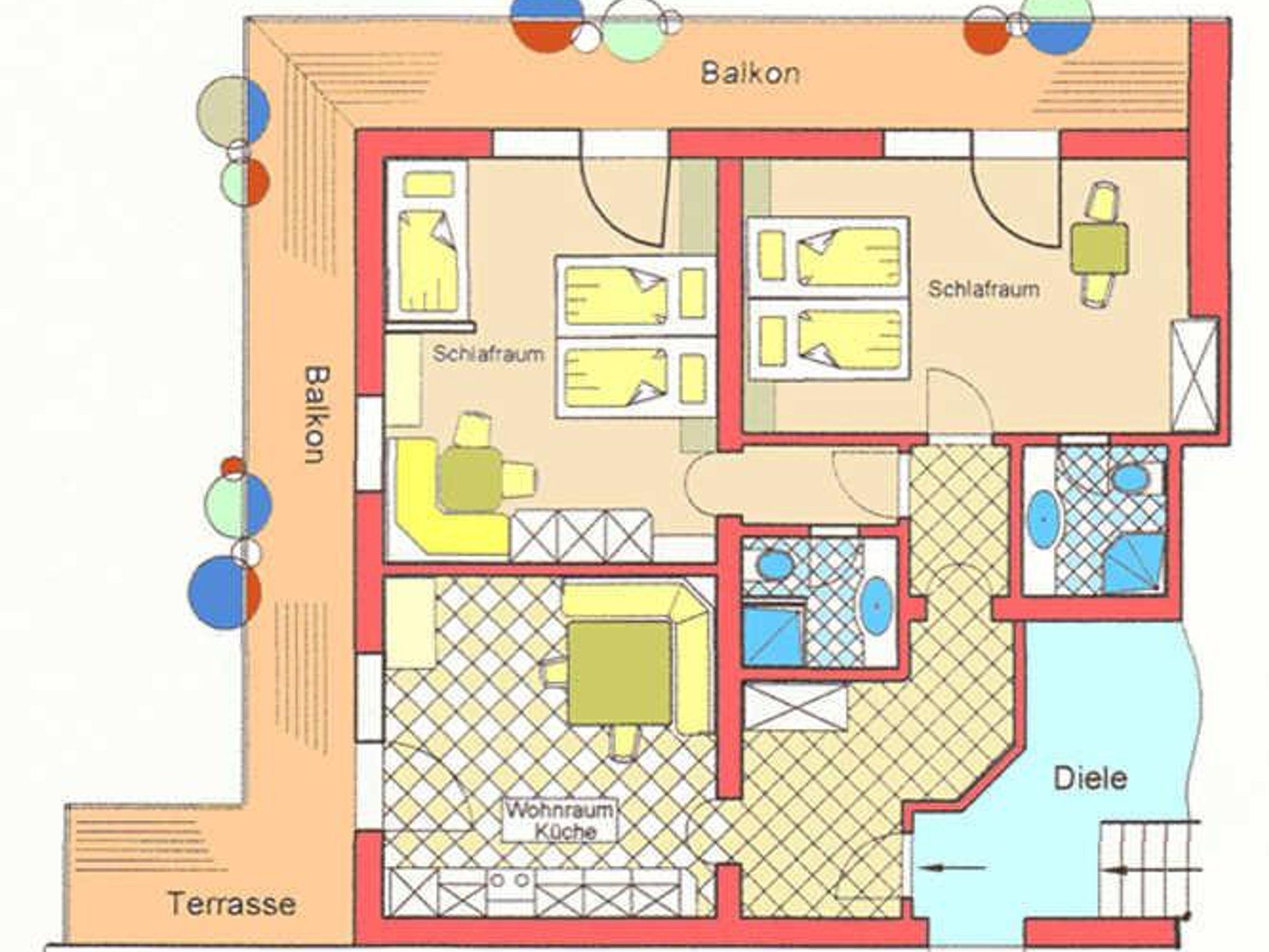 Appartement 74m² Gartenseite;Wohnküche, 2 Schlafzimmer mit Dusche-Wc.,Ost-Südbalkon, Kleine Terrasse,Liegegestühle,Berg- und Seeblick