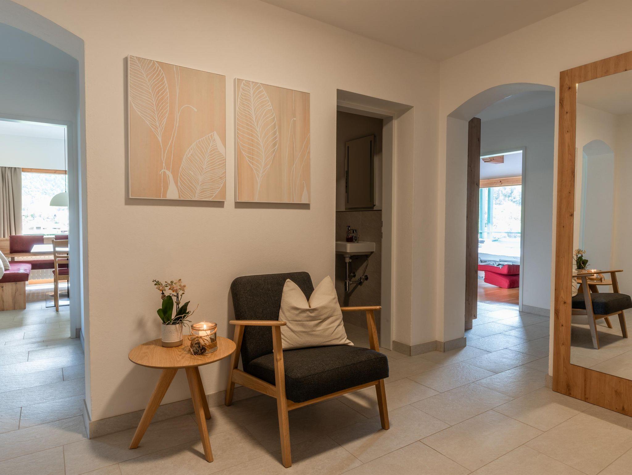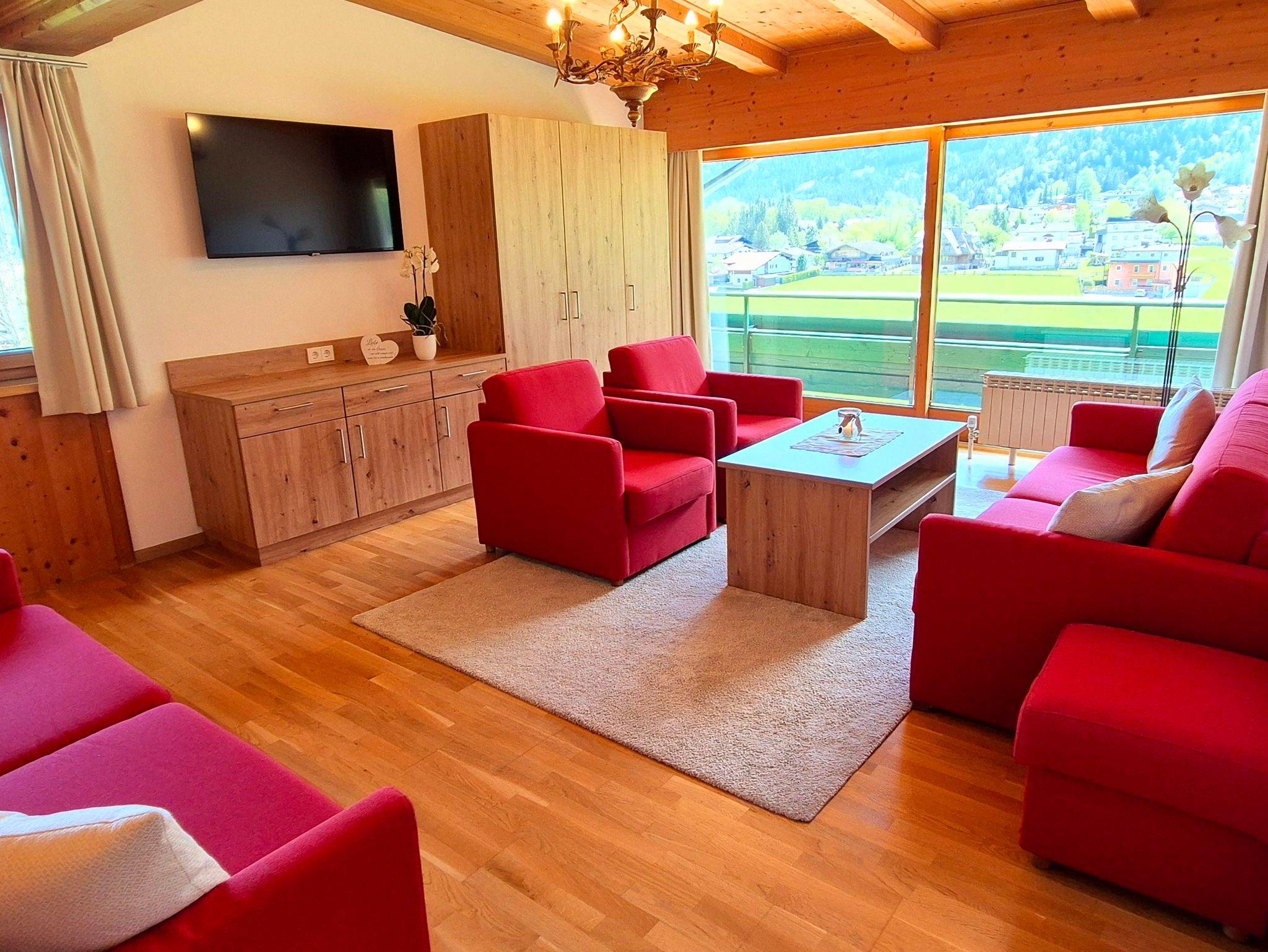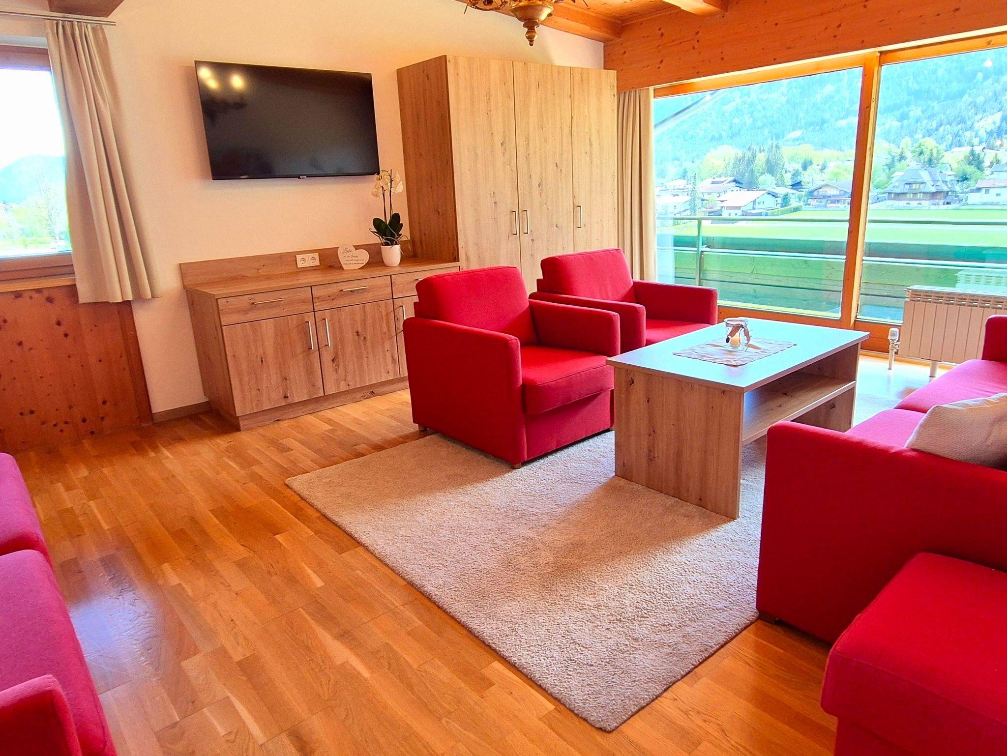 Raumhohe Panoramafenster sorgen für eine helle und freundliche Atmosphäre im gesamten Apartment. Das Wohnzimmer ist mit einem komfortablen Doppelschlafsofa ausgestattet. Schlafzimmer 1 verfügt über ein Doppelbett sowie ein Doppelschlafsofa. Schlafzimmer 2 bietet ein Doppelbett und ein Einzelschlafsofa. Ein weiteres Schlafzimmer ist mit einem Doppelbett, einem Einzelschlafsofa, einem Sessel und einem Schreibtisch eingerichtet und eignet sich ideal auch zum Arbeiten. Insgesamt stehen drei große Flachbild-TVs sowie High-Speed-WLAN zur Verfügung. Die separate, voll ausgestattete Küche mit großem Esstisch lädt zum gemeinsamen Kochen und Verweilen ein. Sie bietet einen Backofen, vier Cerankochfelder, einen Kühlschrank, eine Geschirrspülmaschine, einen Mikrowellenherd, eine Kaffeemaschine, einen Wasserkocher und einen Toaster. Raumhohe Fenster und ein großzügiger Balkon erweitern den Wohnraum nach außen. Das Apartment verfügt zudem über ein Vorzimmer mit Garderobe. Zur Verfügung stehen ein separates Badezimmer mit Badewanne, ein weiteres separates Badezimmer mit Dusche sowie ein separates WC. Im Keller befindet sich eine gemeinschaftlich nutzbare Waschmaschine mit Münzeinwurf sowie ein Trockner für alle Gäste.