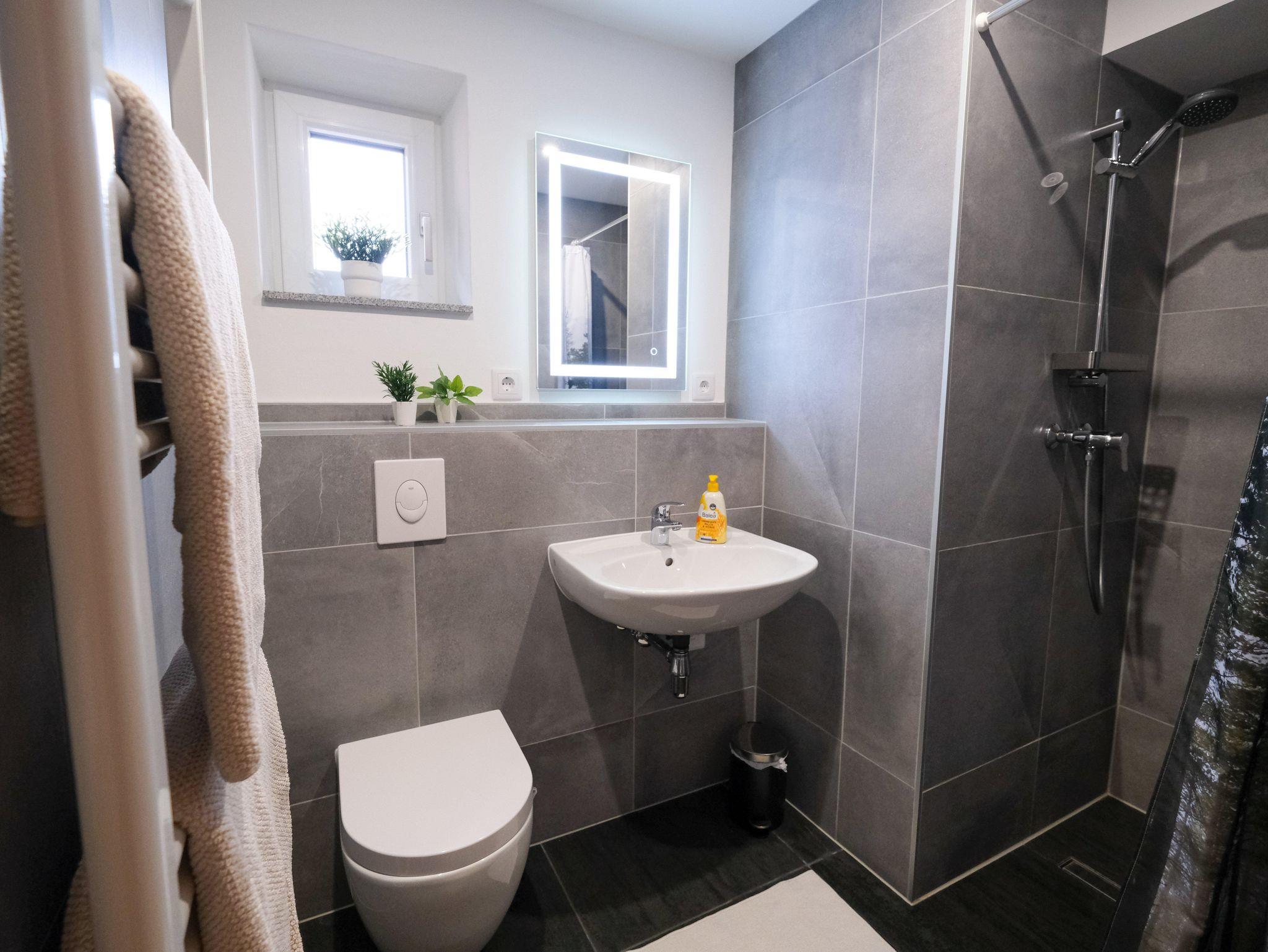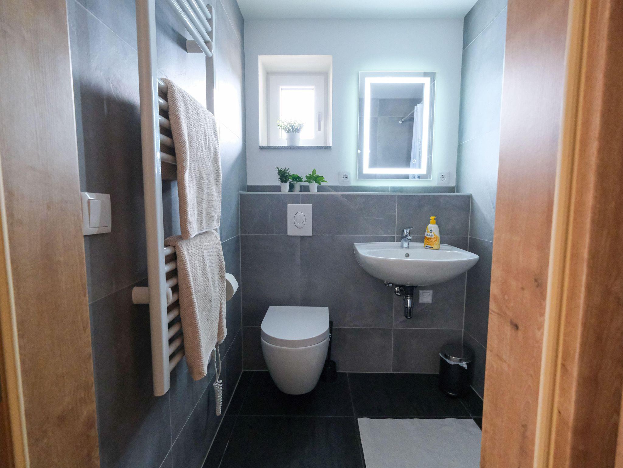 Zur Ausstattung gehören außerdem eine Dusche sowie zwei separate WCs, was besonders bei Belegung mit mehreren Personen zusätzlichen Komfort bietet.