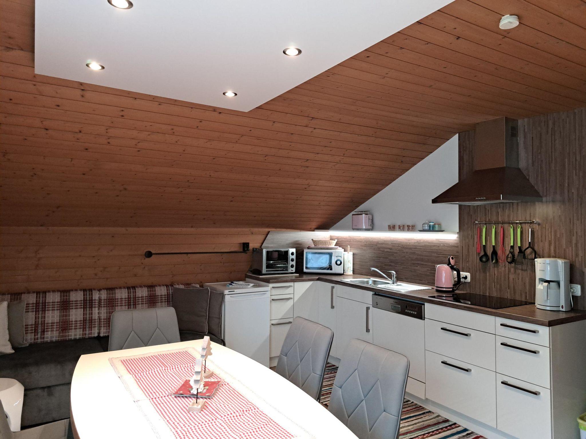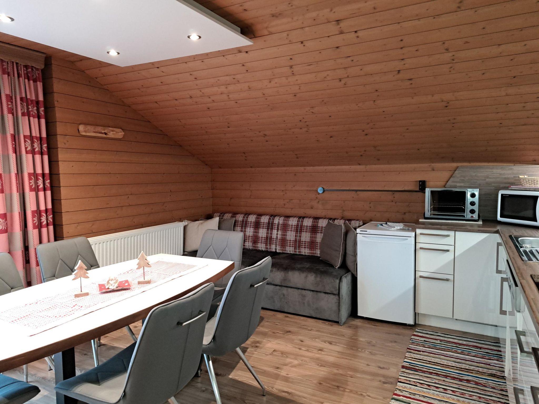 "Schragl", 3-room apartment 65 m2 on 2nd floor. Cosy and wooden furniture furnishings: 2 rooms, each room with 1 sofabed, 1 double bed and hand-basin. Exit to the balcony. Kitchen-/living room (oven, dishwasher, 4 ceramic glass hob hotplates, toaster, kettle, microwave, electric coffee machine) with dining table and satellite TV. Exit to the balcony. Shower, sep. WC. Wooden floors. Balcony. Facilities: children's high chair, baby cot. Internet (WiFi, free). Please note: non-smokers only. Smoke alarm, fire extinguisher. The apartment is open to the stairwell.