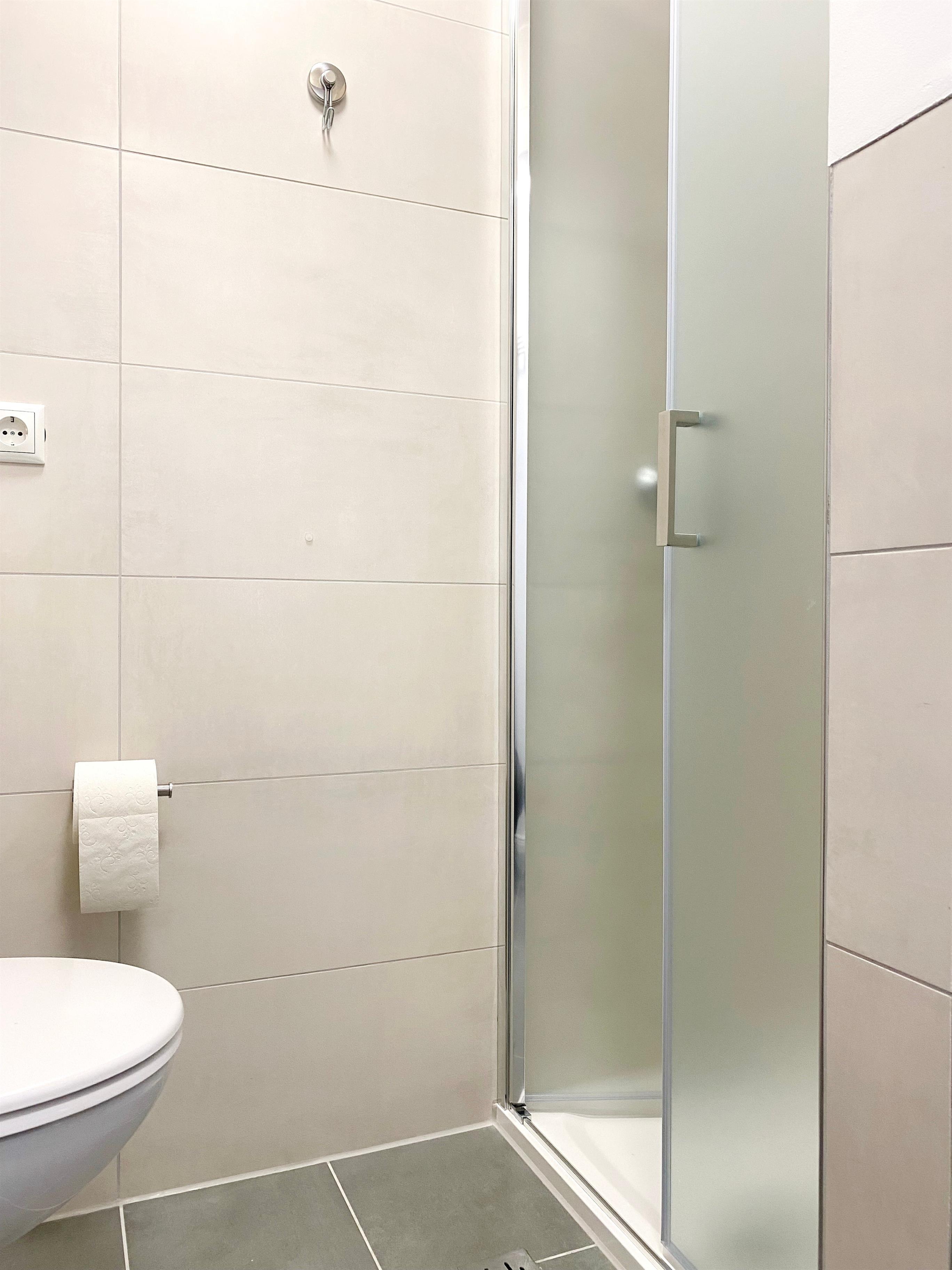 1 Badezimmer mit WC, Dusche, frischen Handtüchern und Haartrockner.