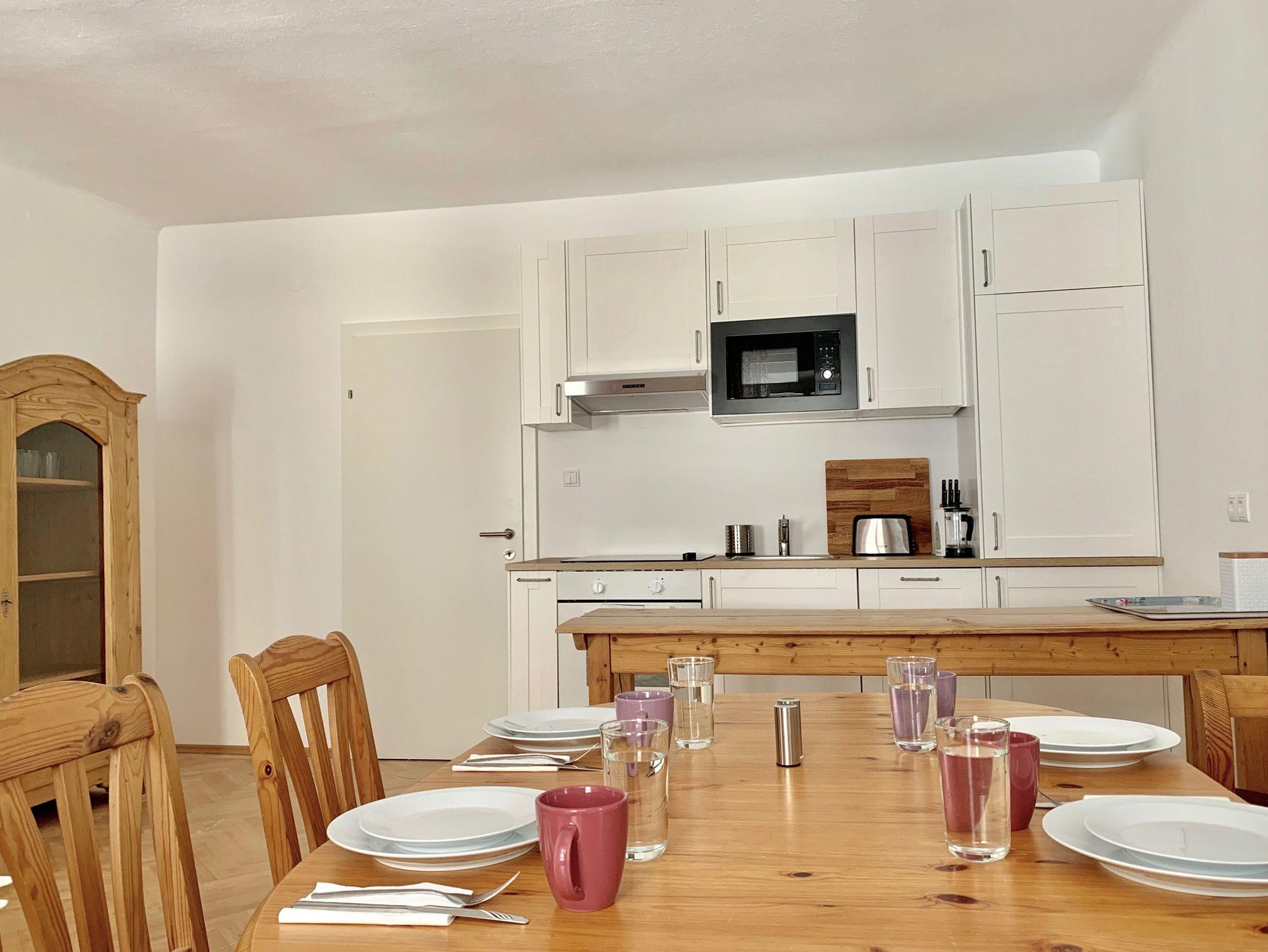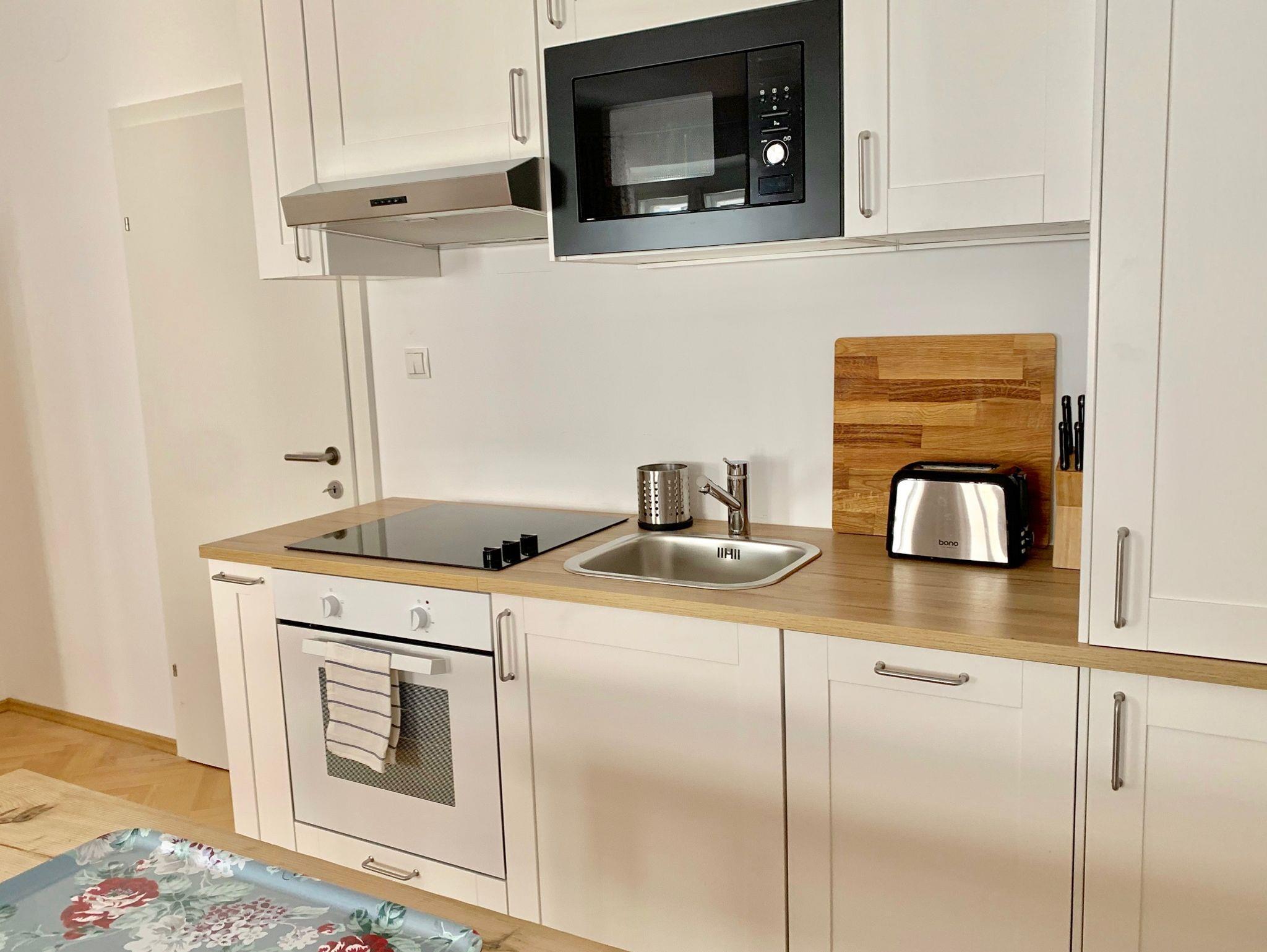 Großzügige Wohnküche mit Komplettausstattung: Backrohr, Kühlschrank mit Eisfach, Geschirrspüler, Mikrowelle, Wasserkocher, Toaster, Filter-Kaffeemaschine & Nespresso, Geschirr, Gläser, Besteck, Küchenutensilien