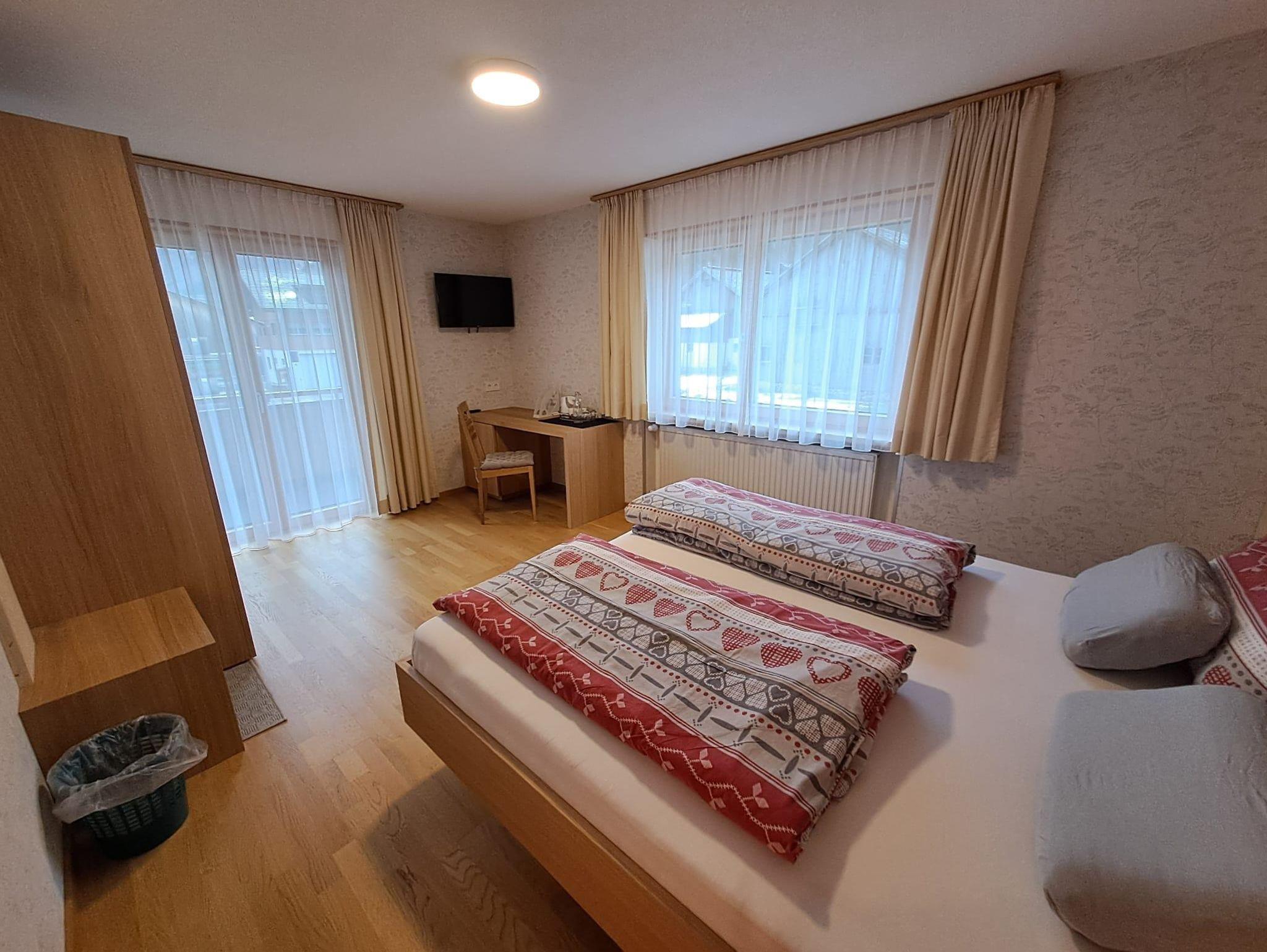 Dieses Doppelzimmer ist allergikerfreundlich und mit Holzparkett ausgelegt. Der Balkon ist nach Osten ausgerichtet und bietet einen direkten Blick auf die Kanisfluh, unseren Hausberg. Der Balkon (kann auch abgetrennt werden) wird mit dem Zimmer 4 geteilt. Die Nasszelle ist mit Dusche, WC, Haarfön, flüssiger Handseife sowie Hand- und Duschtüchern ausgestattet. Ein Flachbild-TV, ein Safe, ein Kühlschrank und WLAN sind ebenfalls vorhanden. Das Zimmer ist ca. 24 m² groß.