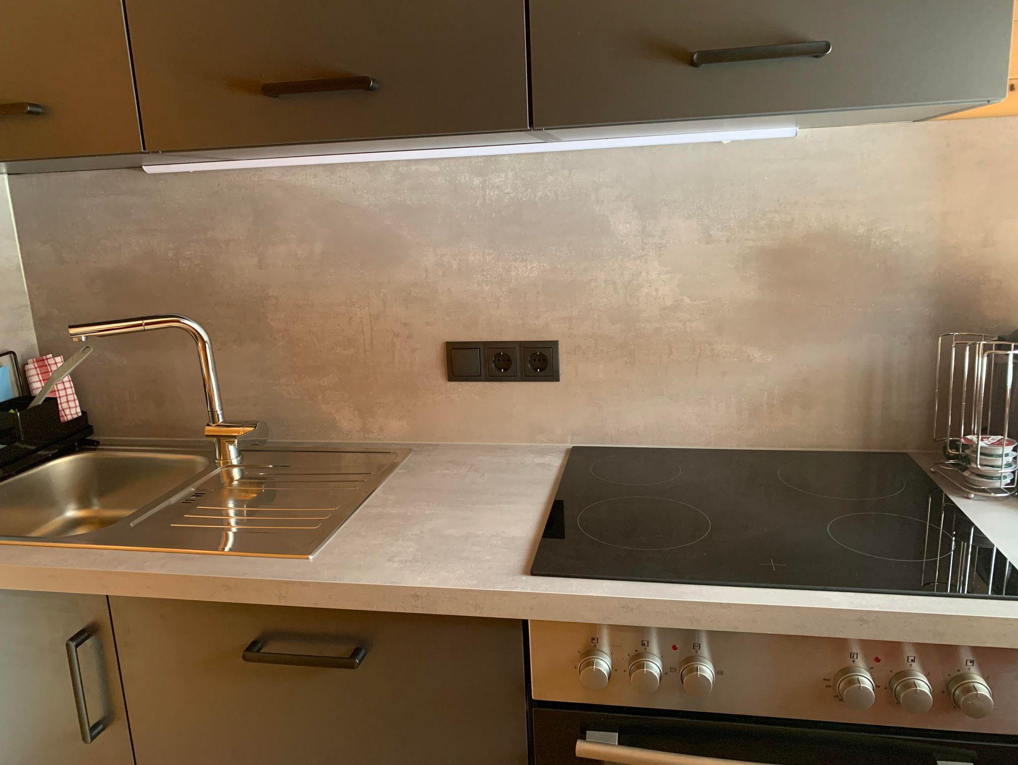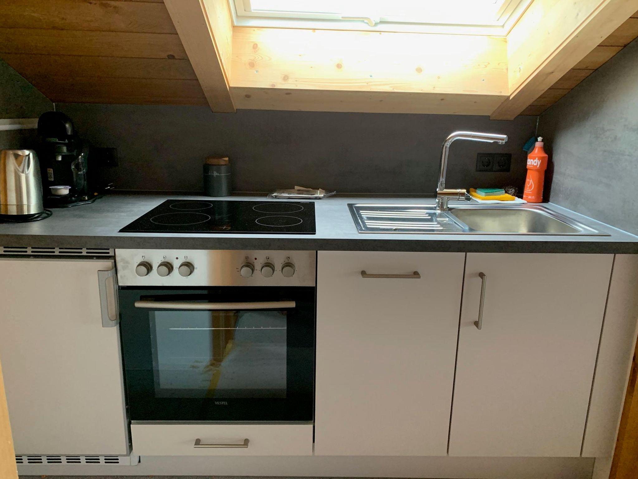 Die voll ausgestattete Küche mit Geschirrspüler, Backofen, Cerankochfeld, Kaffeemaschine und Wasserkocher ist perfekt für Selbstversorger. Der helle Aufenthalts- und Essraum mit Smart-TV lädt zum Verweilen ein.